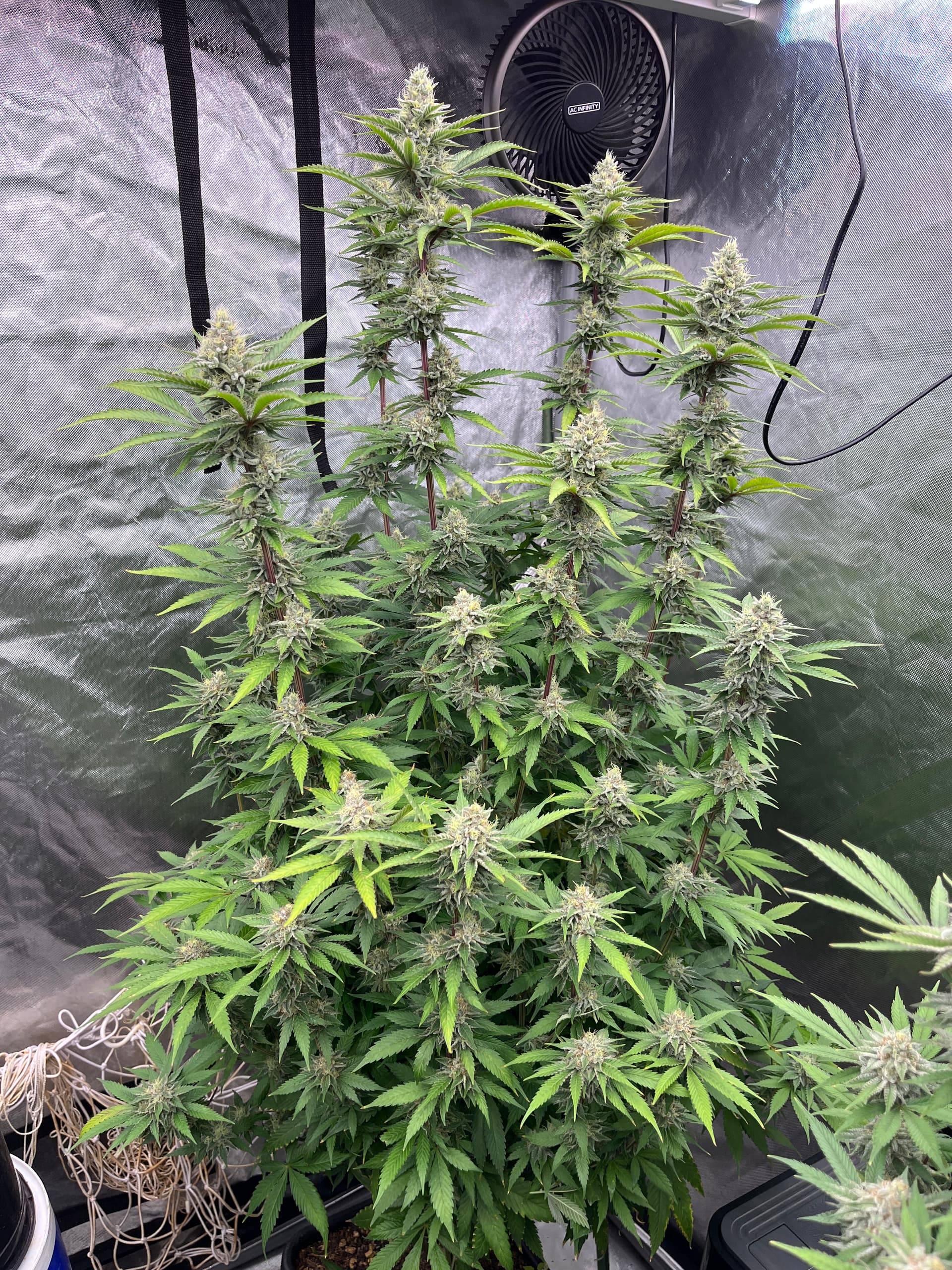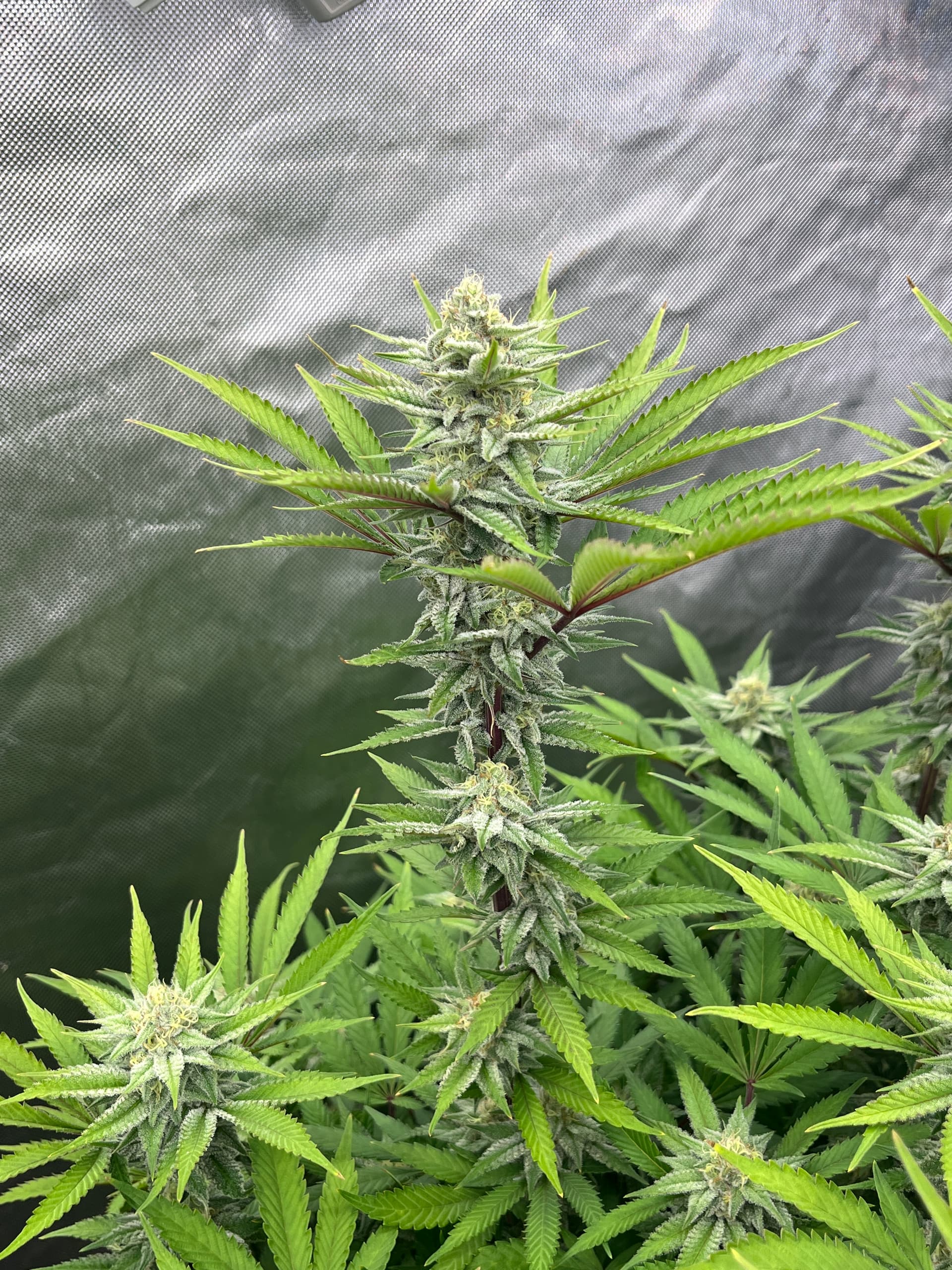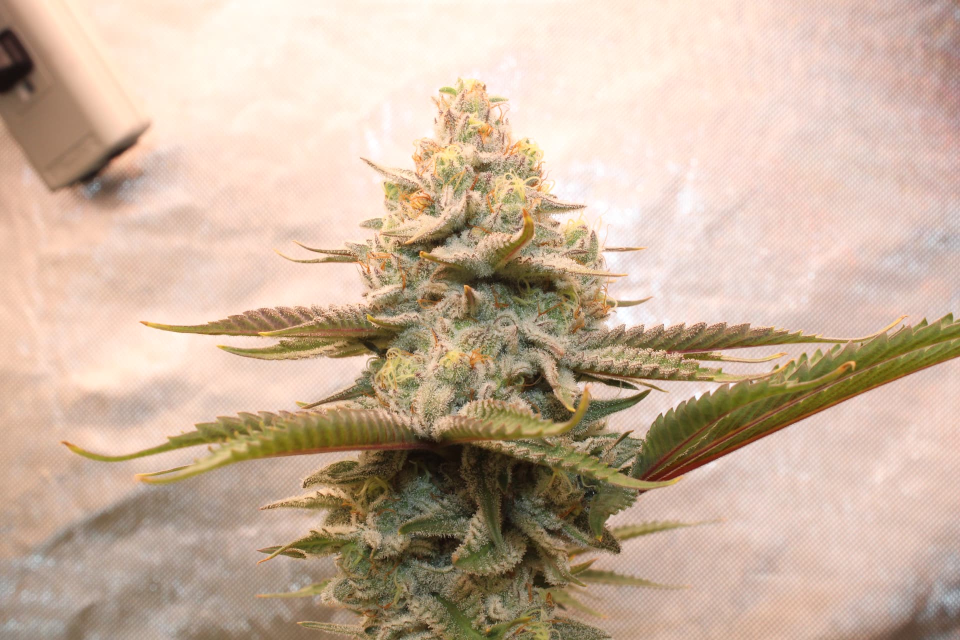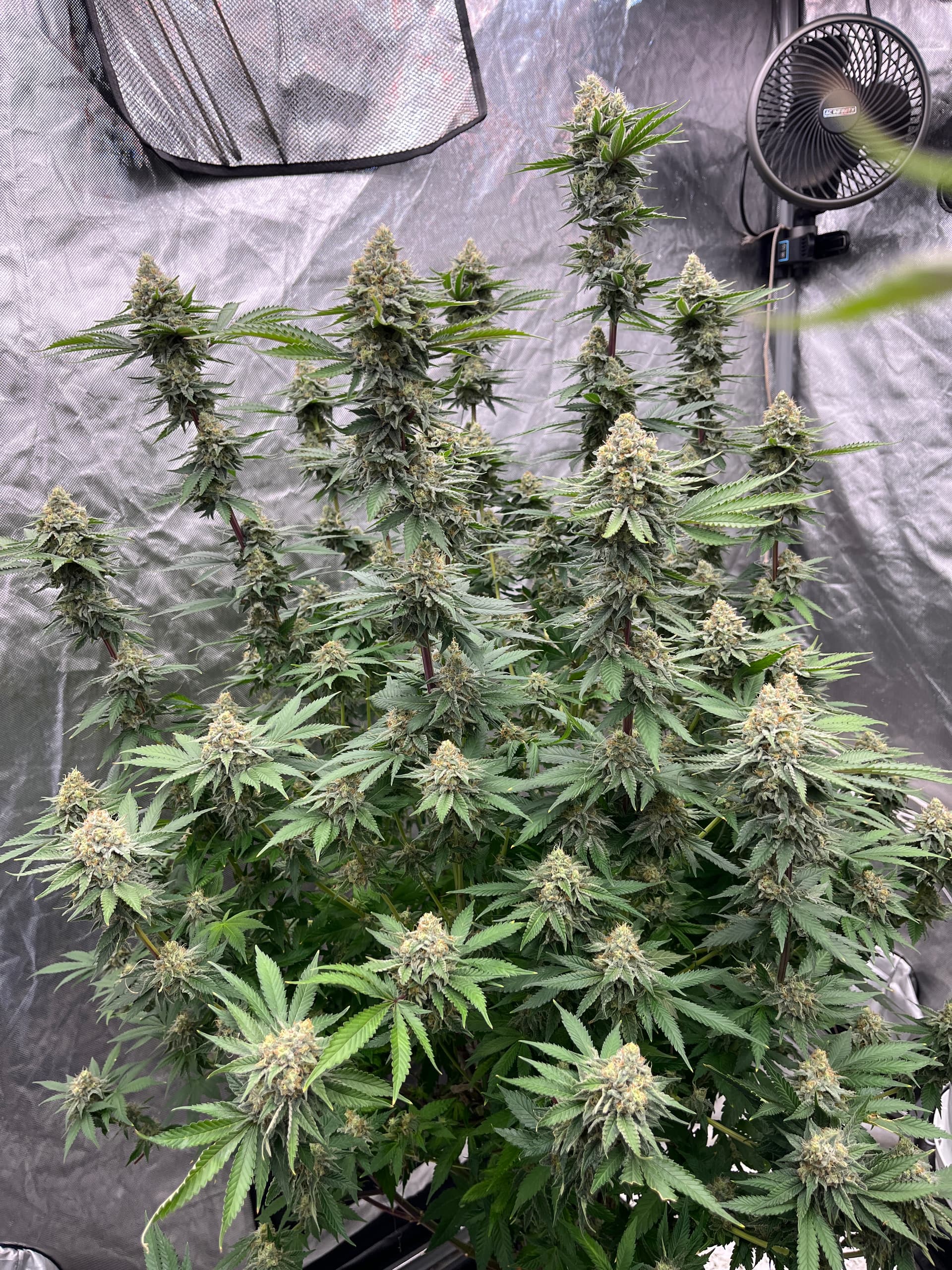 This is getting silly…not sure exactly how long they have been flowering, but seems like forever, well hell, I just went up my thread and they are not all that old on the flower. Just hitting 60 days now, so pretty quick actually and that’s a good thing cause I got two of these outside, so that should make them finish in late September. Just still not seeing any amber at all, and still throwing green hairs. But they are turning purple. Finally turned the AC on, so it’s getting about 58 degrees in the tent at night with the light off, keeping it at 75 during lights on.