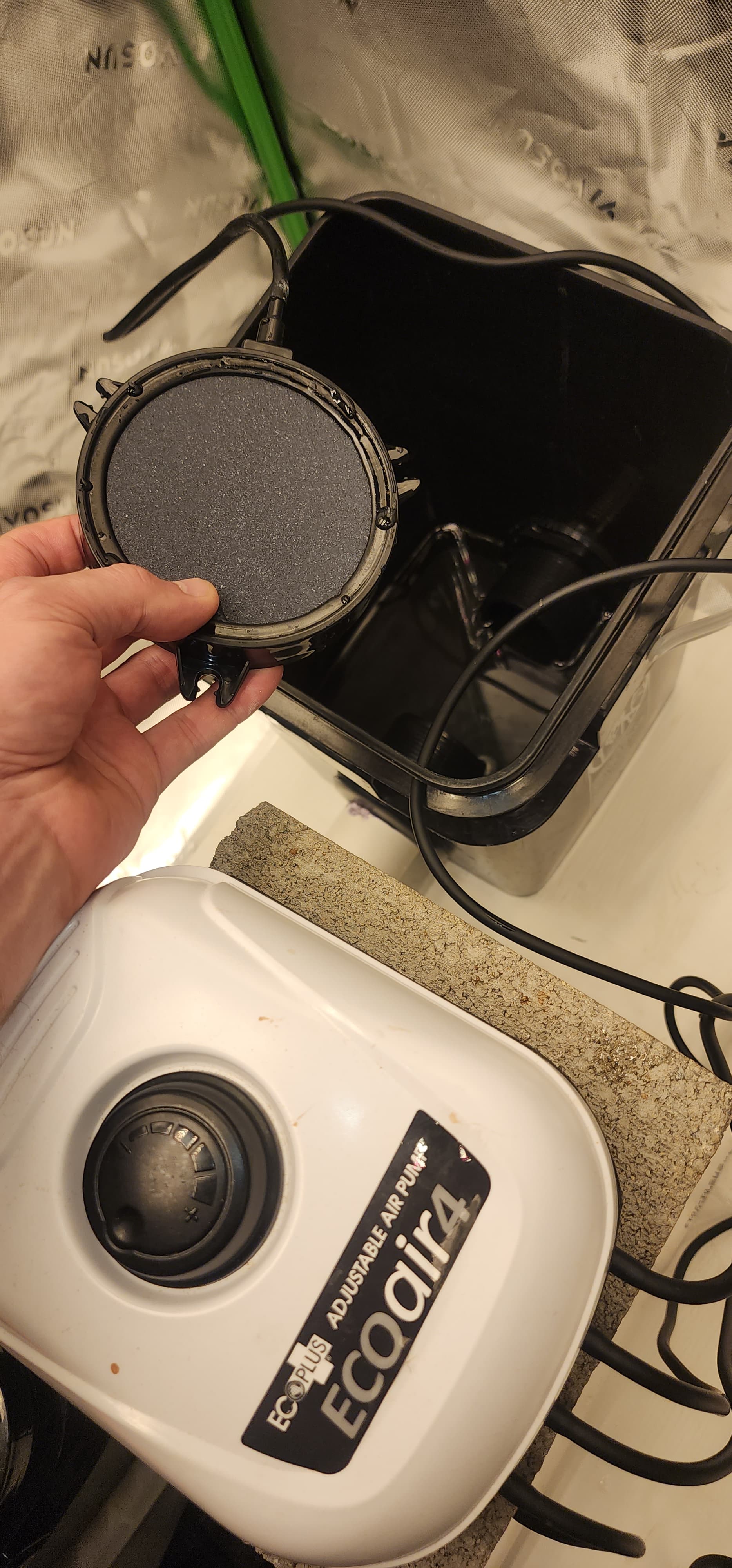 Ok the system is reset and up and running. And im pissed i broke the water line connector for my chiller! I had some old parts from an old pum and used a heat gun to melt the connecter so i could slide it into an old connector. Then i epoxied them together and it will work. But damn it. I put in new air stones. I keep them in inventory. I have 8 more for the next 2 runs after this one. Because cleaning them sucks. And i prefere to start every grow sterile as i can and always use new clean things i can replace.