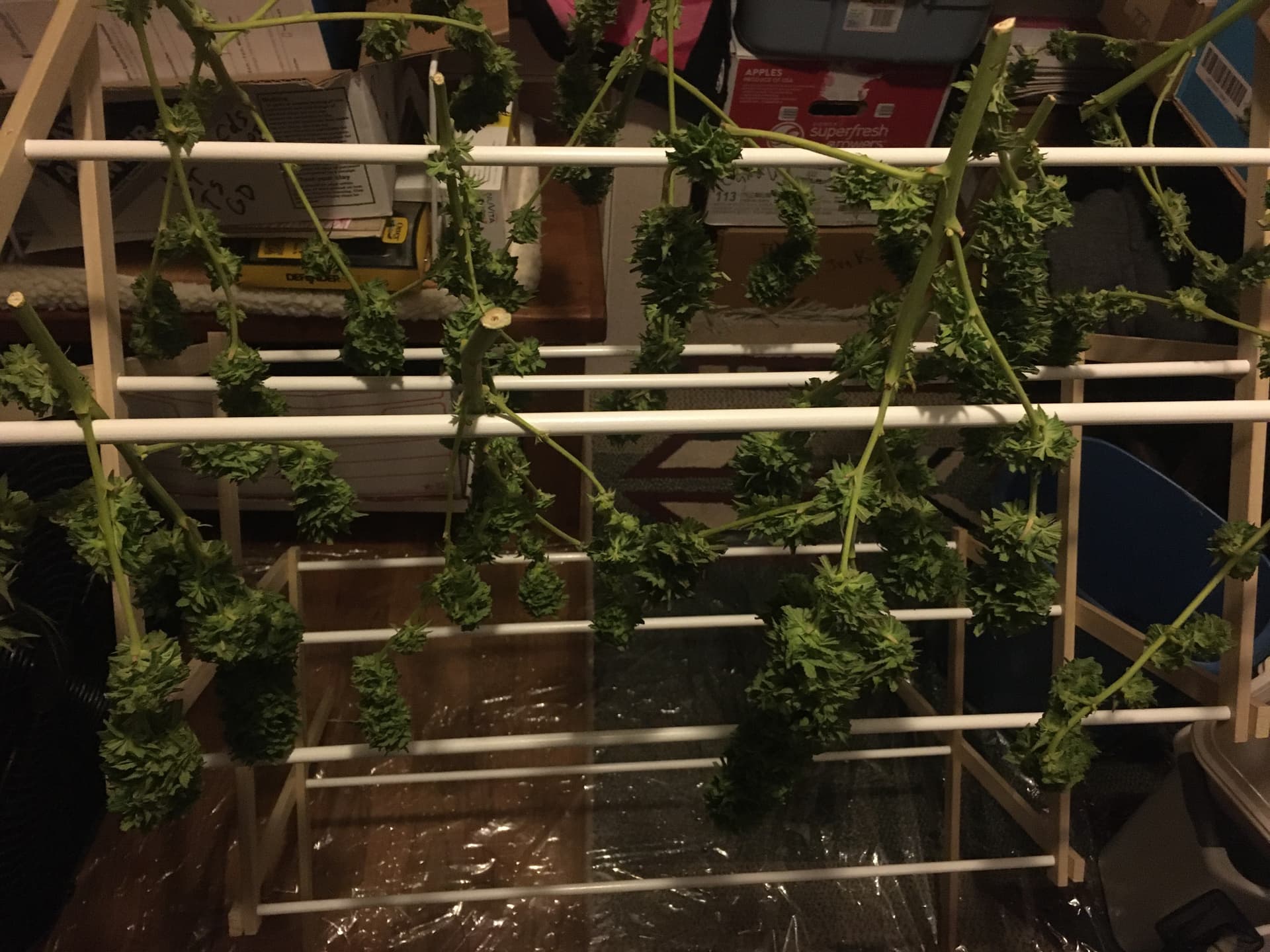 Back to chopping the second White Runtz x Skywalker og … third plant, third day of chopping/trimming. Tomorrow I do the Sky God that is in the dark in my pantry. It’s like a factory here …