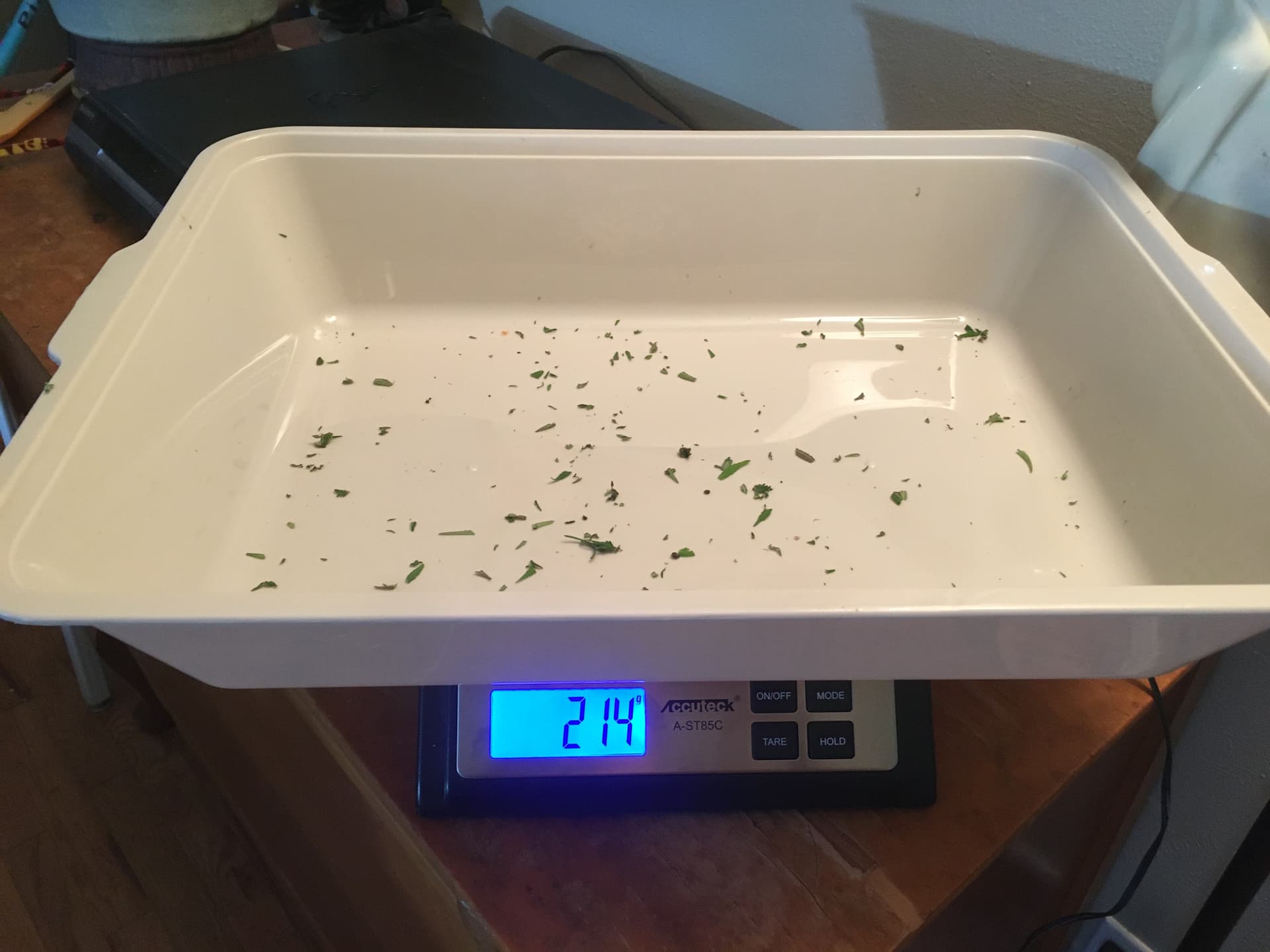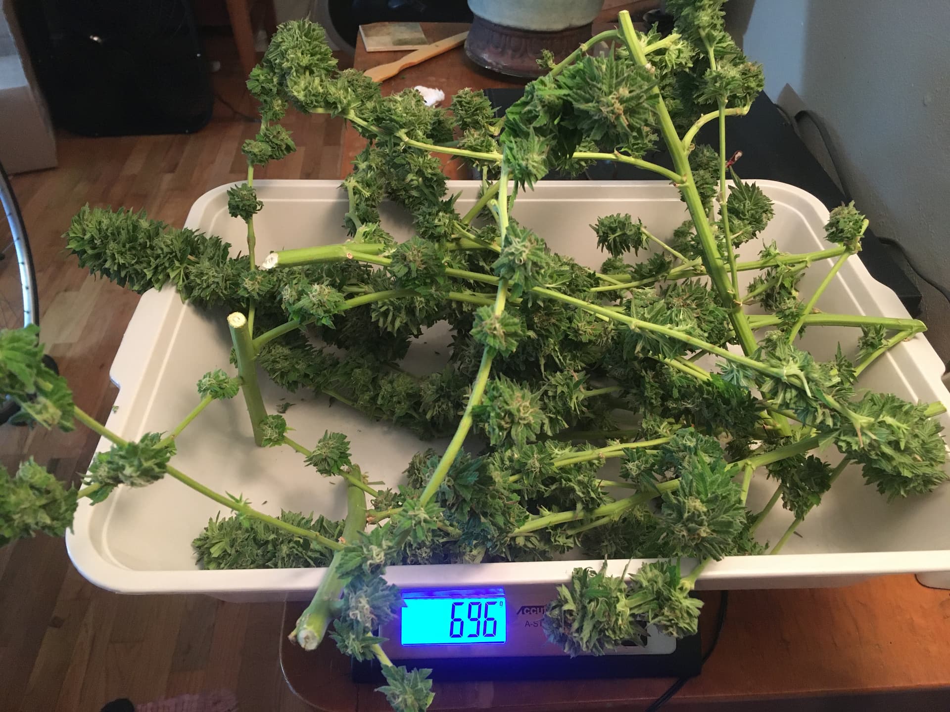 We just finished chopping and wet trimming the Hash God and it weighs 696 grams, including the tray it’s in. I went with wet trimming because #1 it’s how @OlyBoy taught me hands on and #2 I read that wet trim was better to prevent bud rot. LOL My ‘new’ iPhone already died so I have to wait for it to charge to take pics. I’m getting ready to wash and hang after I take a few pics.