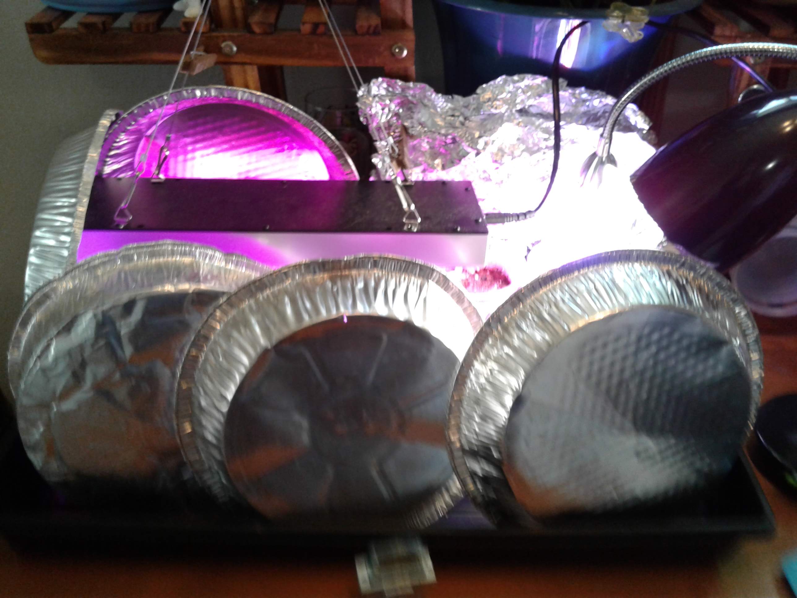 I added foil and foil tin pans around the lights.Yesterday, I added an Ottlite to the mix of lites. Only 6-7 plants fit under the very low LED grow lamp, so I have two LED white lites over the others and I rotate them so that they all share all the kinds of lights.