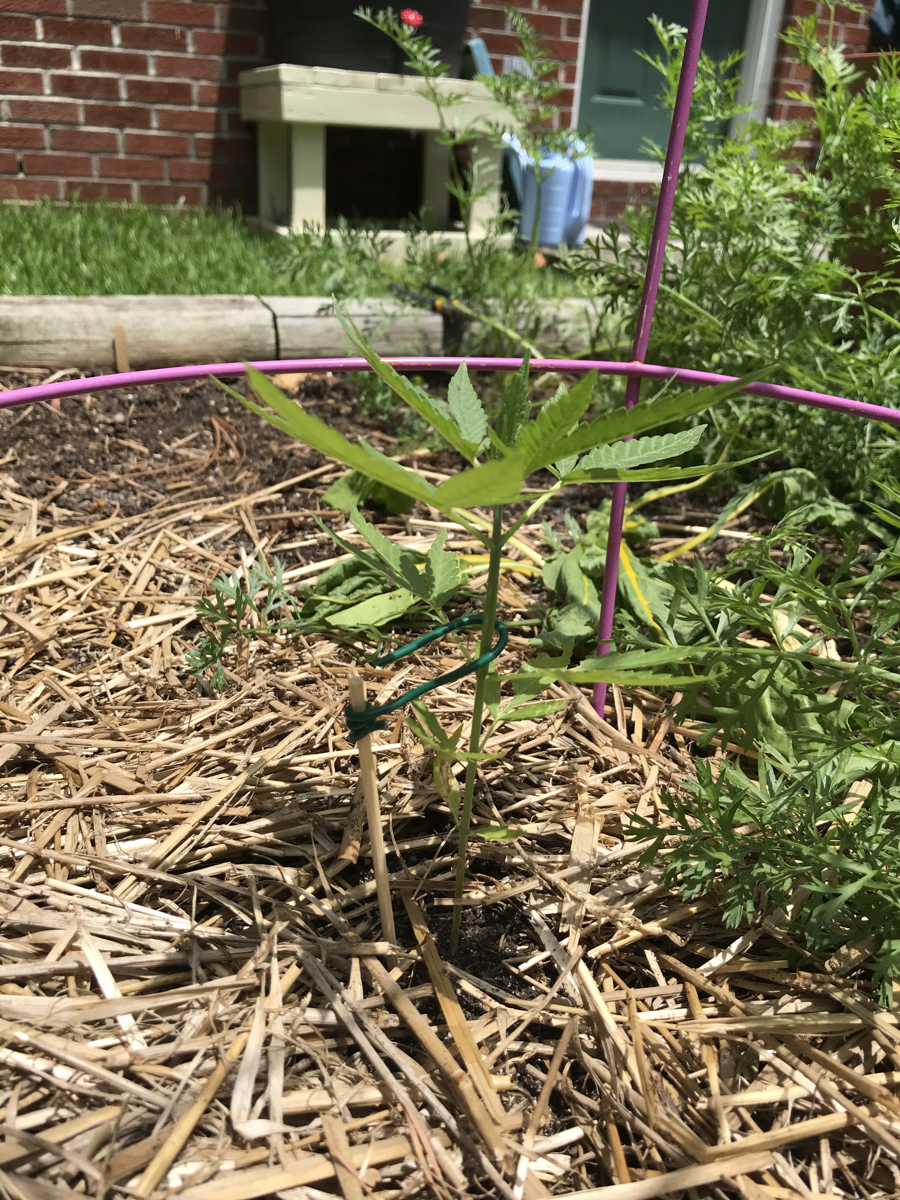 And here’s the other Zkittlez that is in my garden. Really growing quickly now, putting on a new set of leaves every day, including new baby leaves at the base of the biggest fan leaves. Is that how branches begin?? As you can see, I used a small skewer and some plant training wire to make a little support for this one. She was rocking and rolling in the wind the other day. Would love your feedback on that, too, as I don’t have a clue.