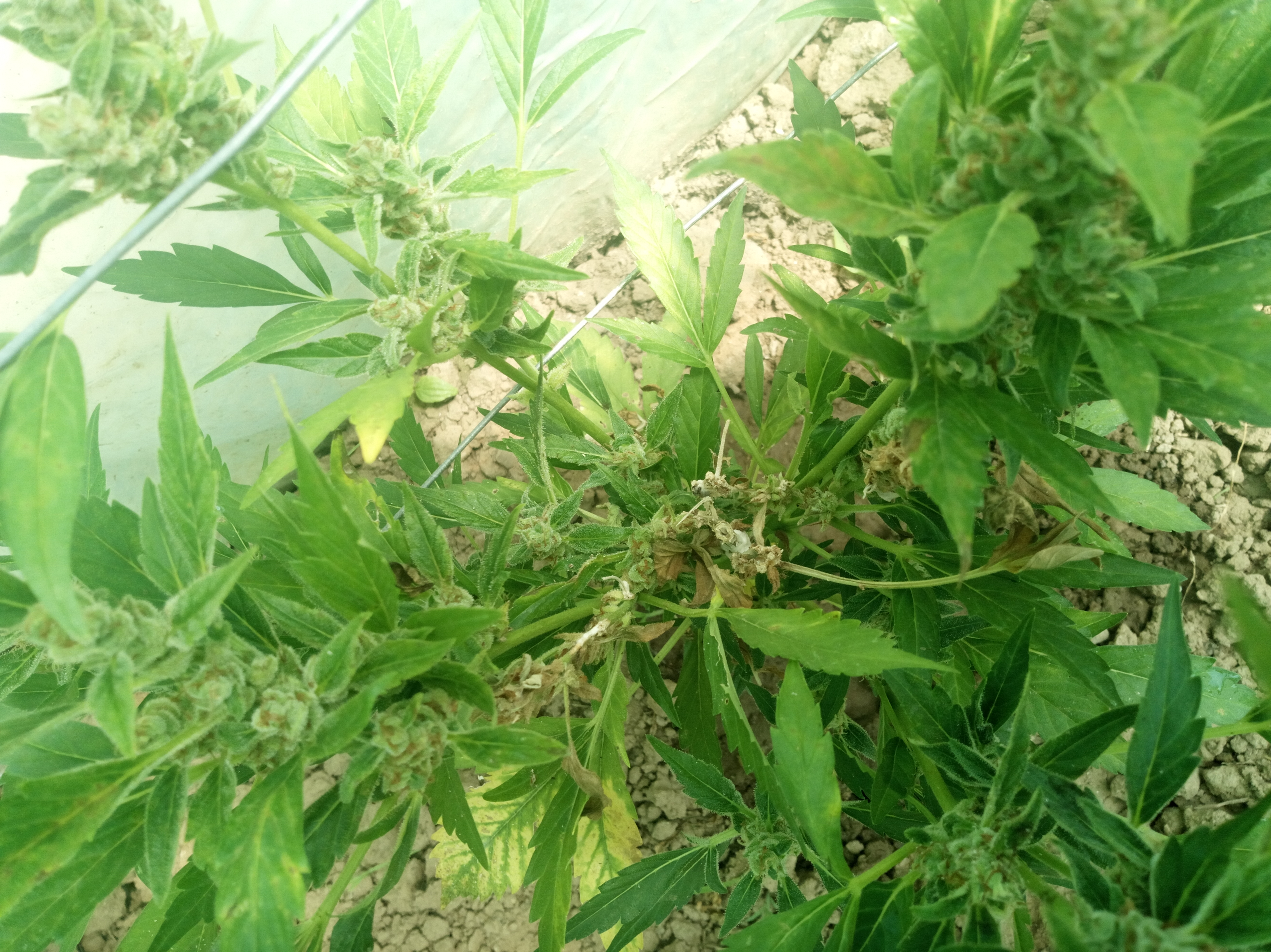 These are Amnesia. I had four Amnesia seeds, I grew them in small coconut receptacles, but only the two made it. The other two rose a few centimetres then withered and died. They’re two months old. The first flowers appeared one month ago. I used Canna Rhizotonic in a feed-feed-water-feed-feed-nothing pattern and then, when they started flowering, I’ve started using Canna Terra Vega, 4mg each, in a filtered water bottle, mixing one fertilizer at a time. I haven’t overwatered, but this year it’s been ultra hot everywhere (30° Celsius for 10 hours a day). I’ve moved the male outside the greenhouse. There are still tomatoes and cucumbers inside the greenhouse. I wanted to make it less conspicuous. My neighbours are cops and weed’s illegal in my country