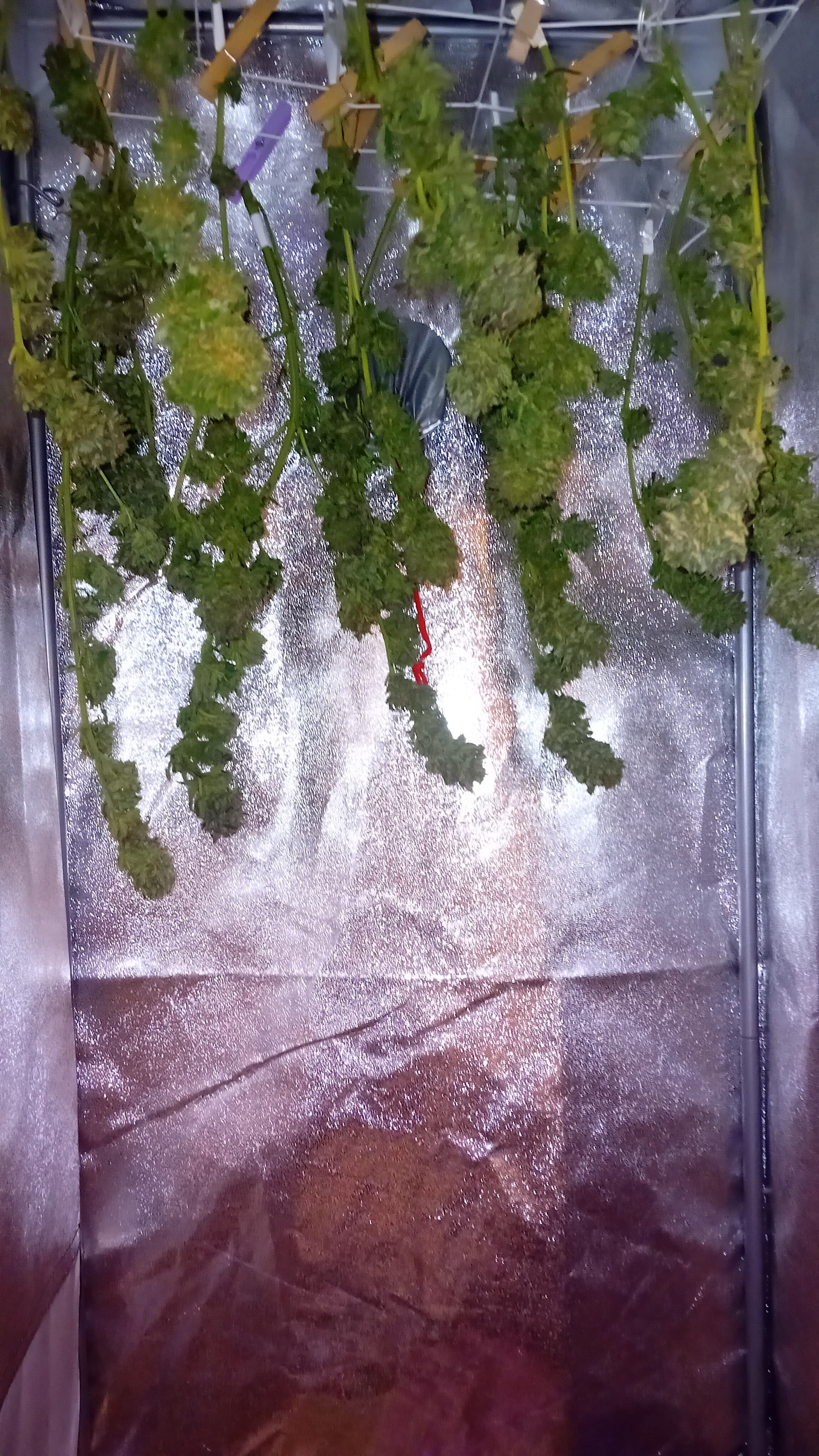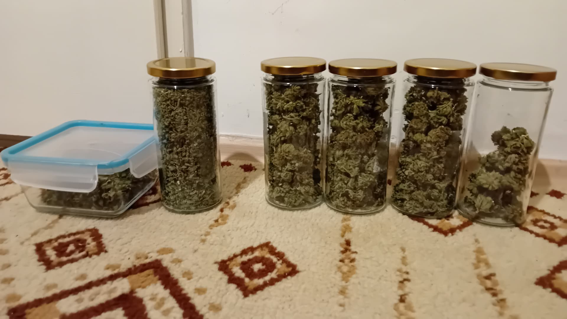 The final result of my yield weight measurement is 111 grams of fully dried flower. In addition, I have about 1 litre of trimming from sugar leaves (the glass container on the left plus the mason jar right next to it.) I don’t know if its considered a good yield, but Im satisfied as this was my very first grow.