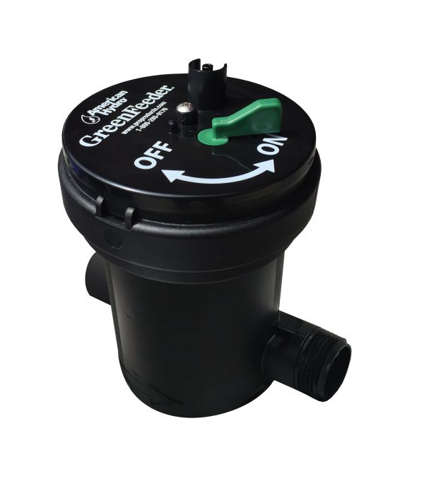 GreenFeeder Automatic Injection System. The GreenFeeder easily installs on any irrigation system and allows for automatic fertilization and/or pest control every time you water. The GreenFeeder adjusts the feed rate based on water flow, so users don’t have to worry about over- or under feeding. Simply connect a bottle of Grass So Green fertilizer or NatureShield pest repellant to the GreenFeeder and let the system go to work. GreenFeeder can be installed underground or above ground after the backflow preventer. The GreenFeeder can also be installed vertically, horizontally, or on an angle.
