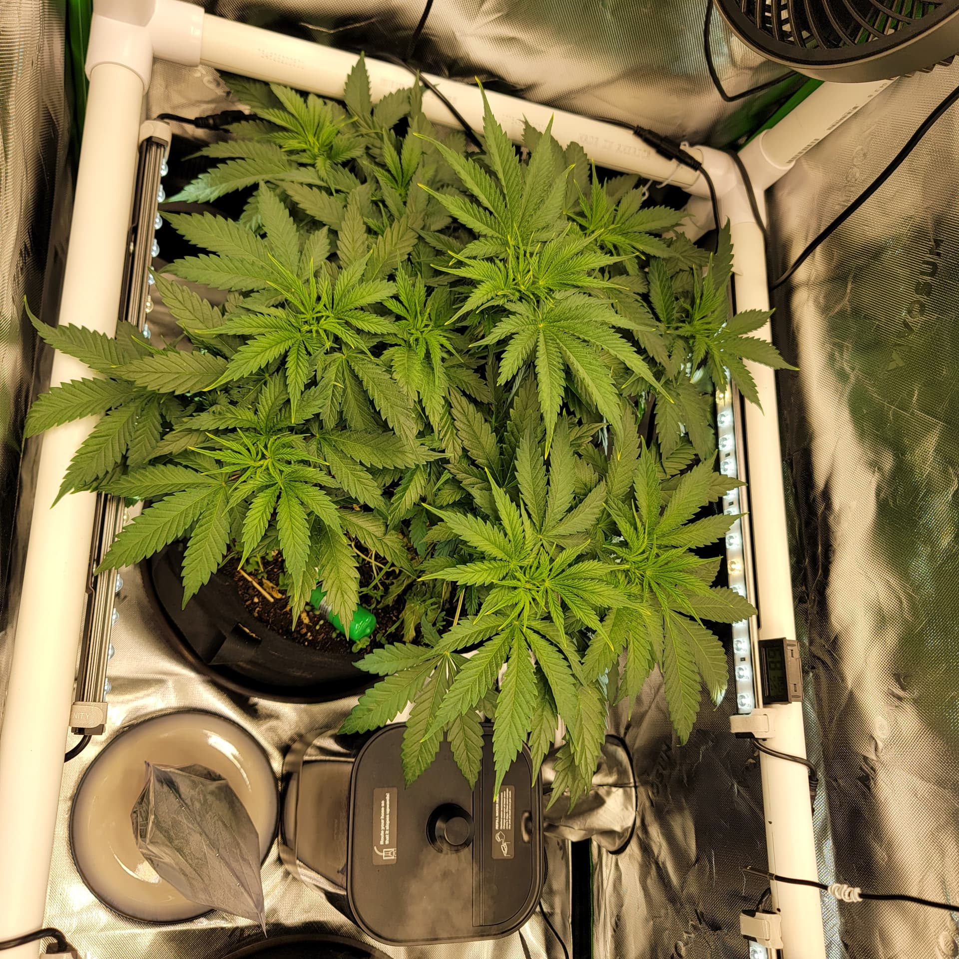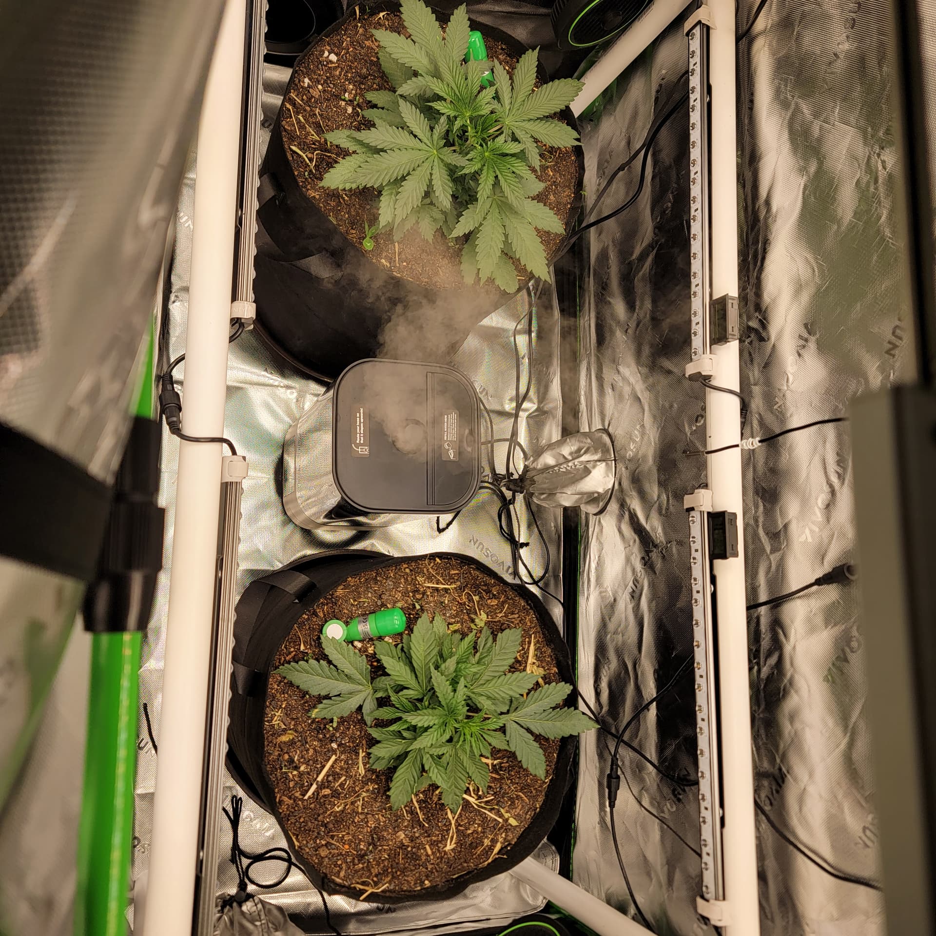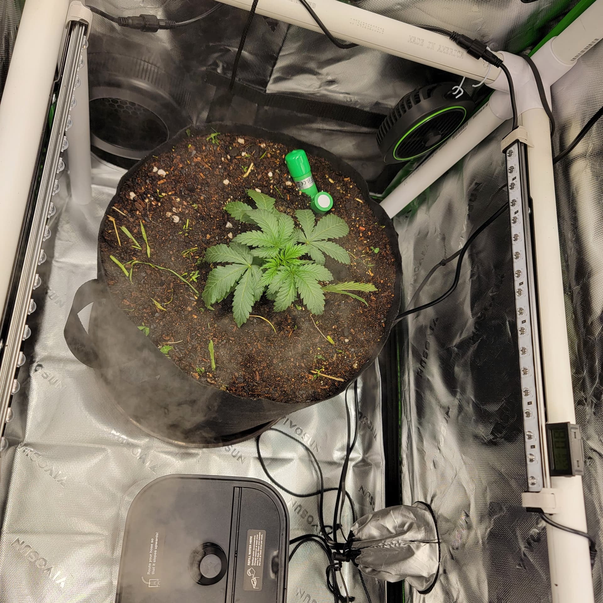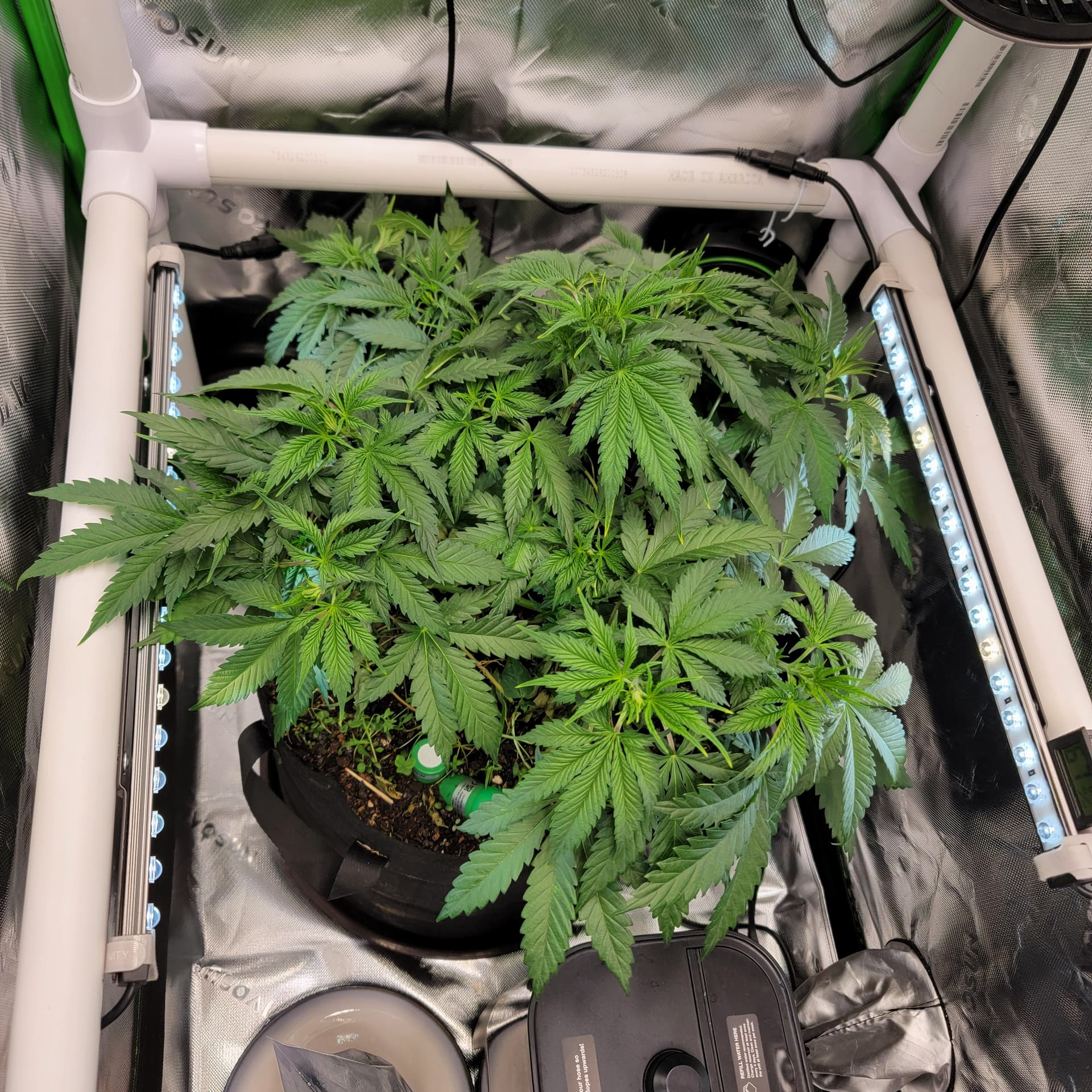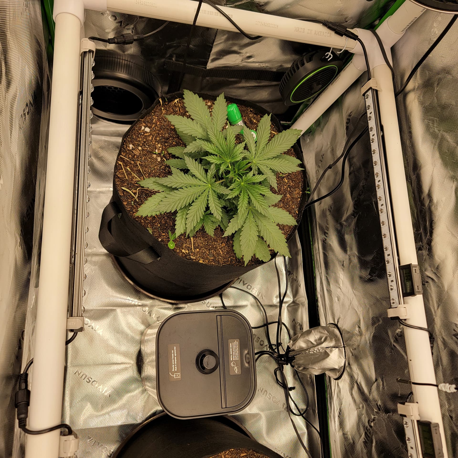 I also just defoliated the lower branches on the wedding cake and plucked the large fan leaves on both. My Monkey Slapz is going to be a dwarf plant . Trying to train her out a little . Before I flip to flower. It is what it is. Im going to water again today with just some rootwise mycrobe complete and some Quillaja 20 extract at 1/2 tsp per gallon. Im using the Ecowitt moisture meter sensors and I and trying to keep my moisture between 50% high and 30% low . Here are some pictures from then until now.