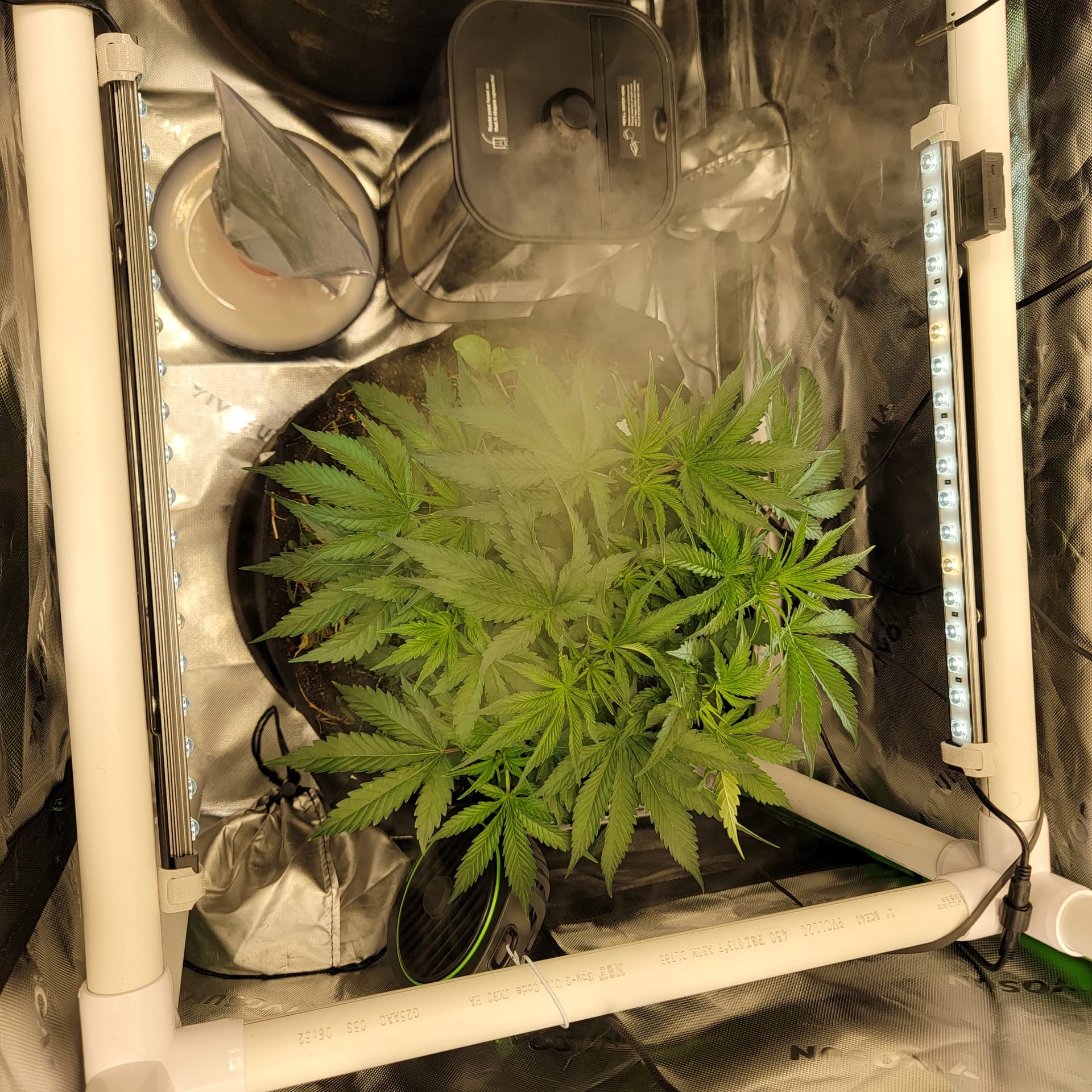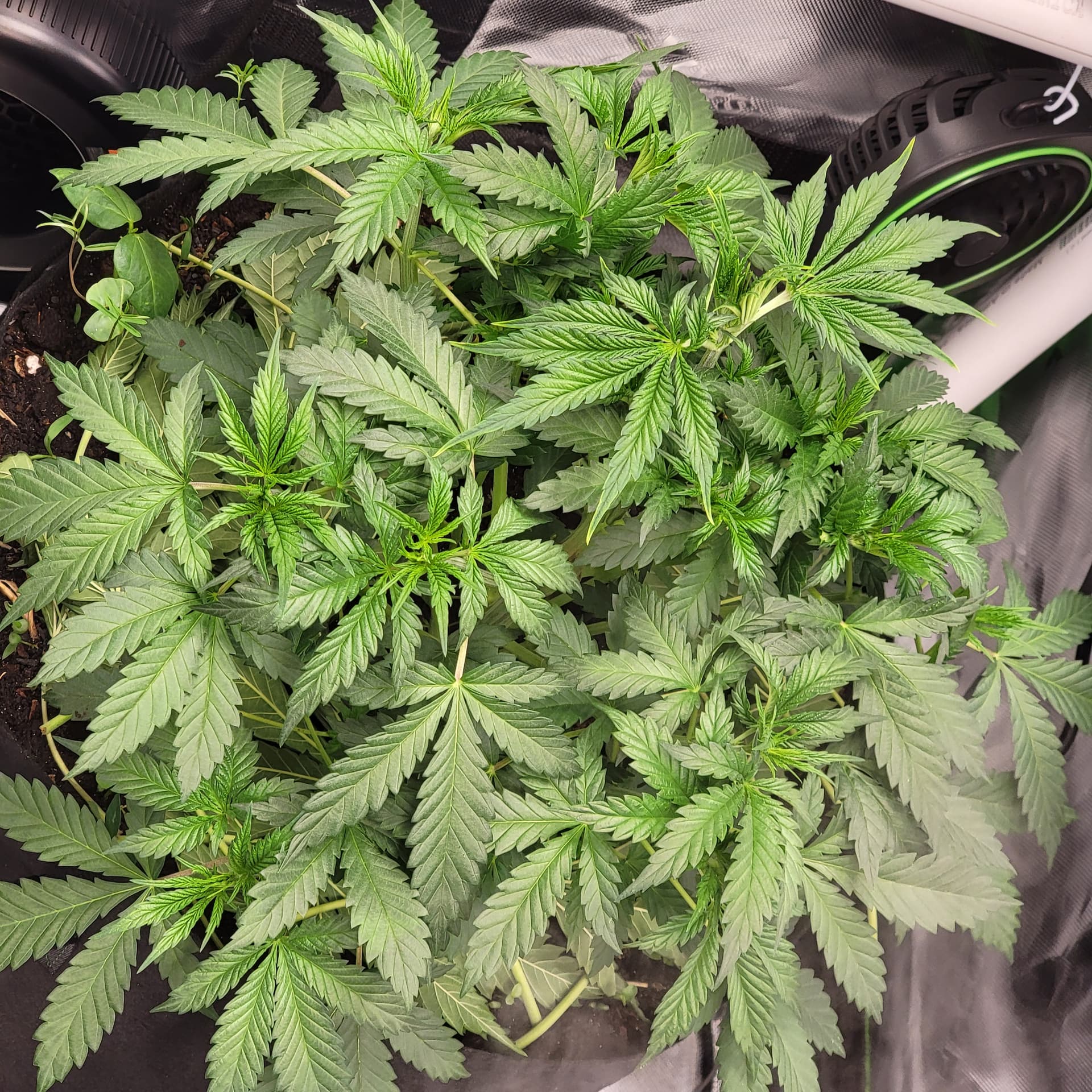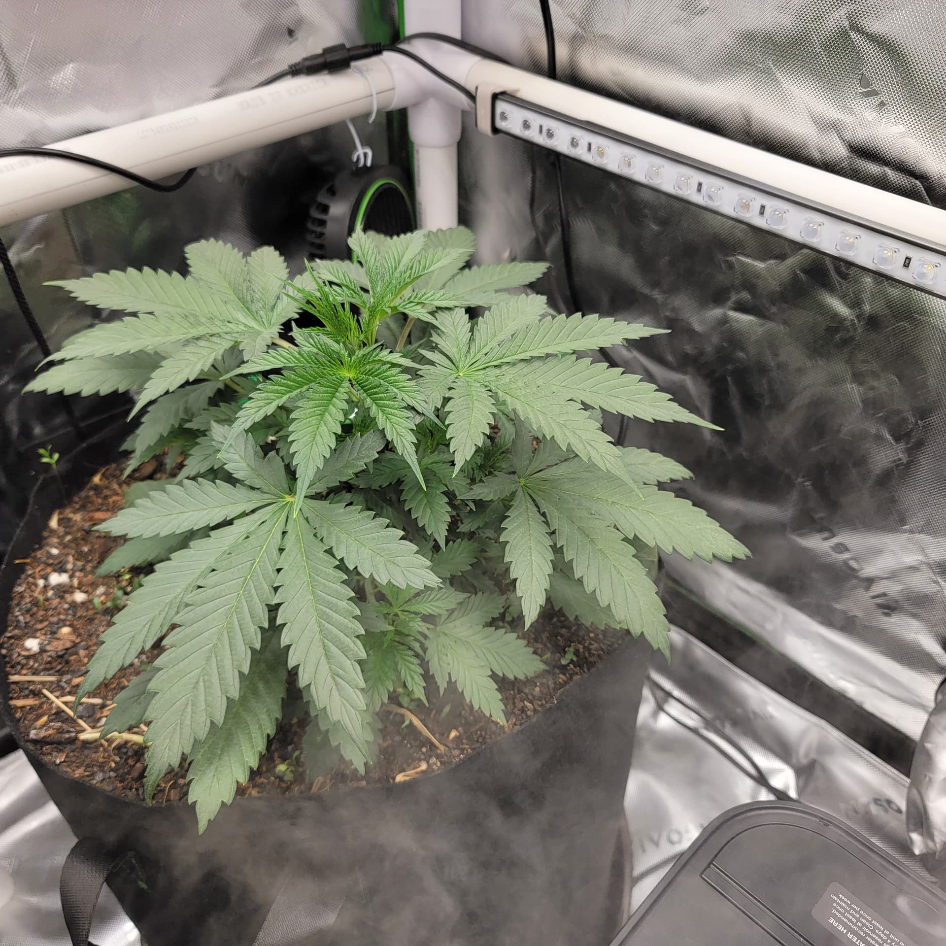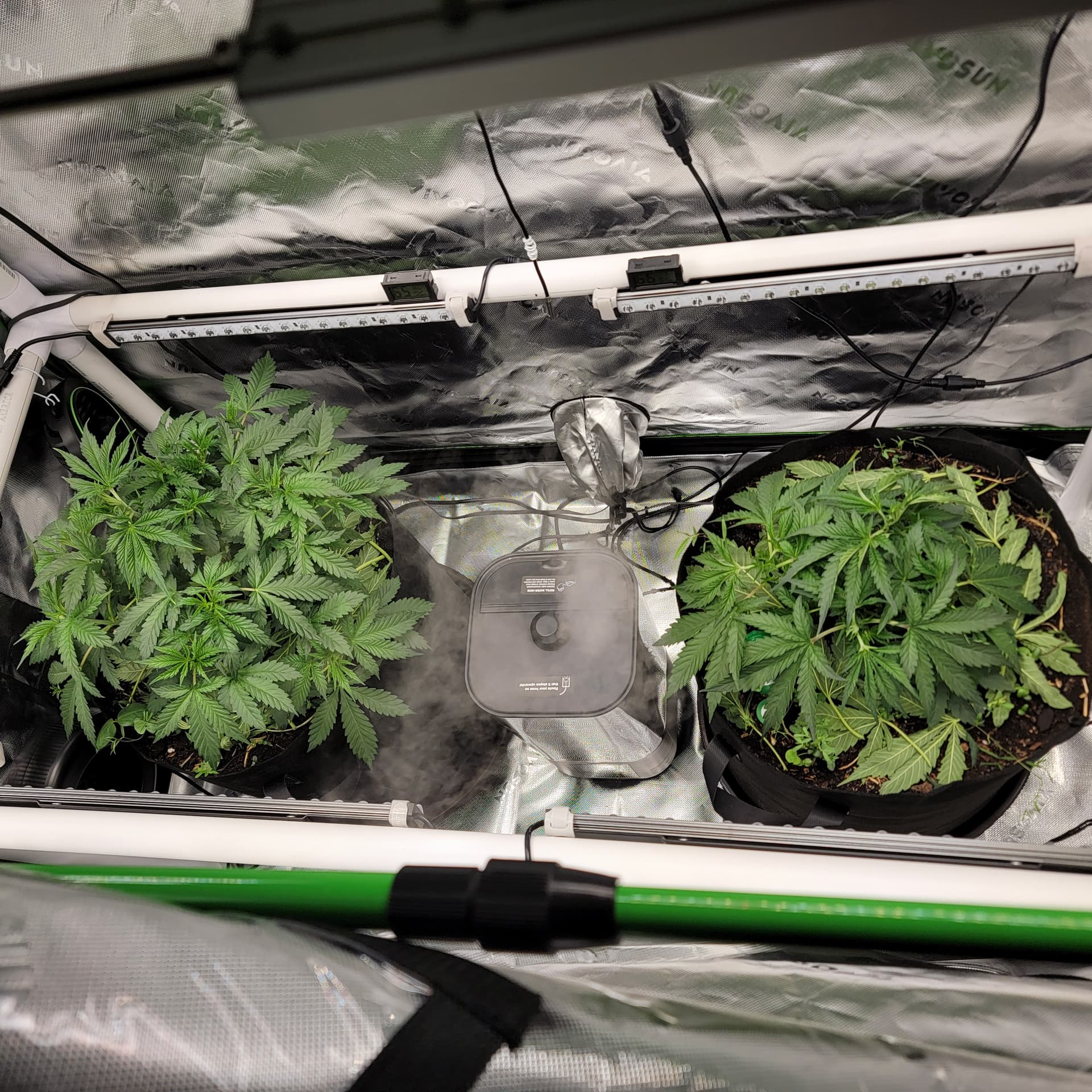 I also just defoliated the lower branches on the wedding cake and plucked the large fan leaves on both. My Monkey Slapz is going to be a dwarf plant . Trying to train her out a little . Before I flip to flower. It is what it is. Im going to water again today with just some rootwise mycrobe complete and some Quillaja 20 extract at 1/2 tsp per gallon. Im using the Ecowitt moisture meter sensors and I and trying to keep my moisture between 50% high and 30% low . Here are some pictures from then until now.
