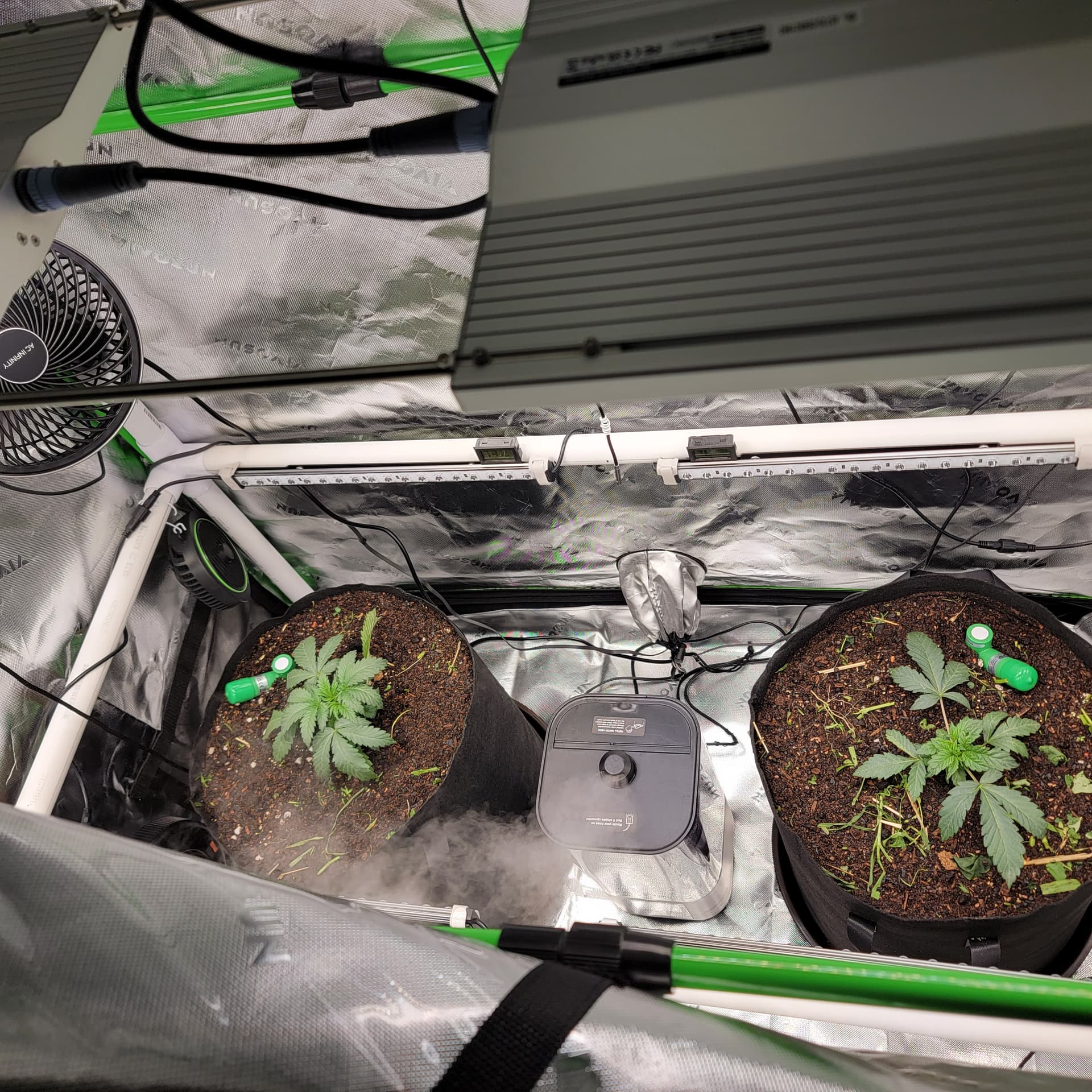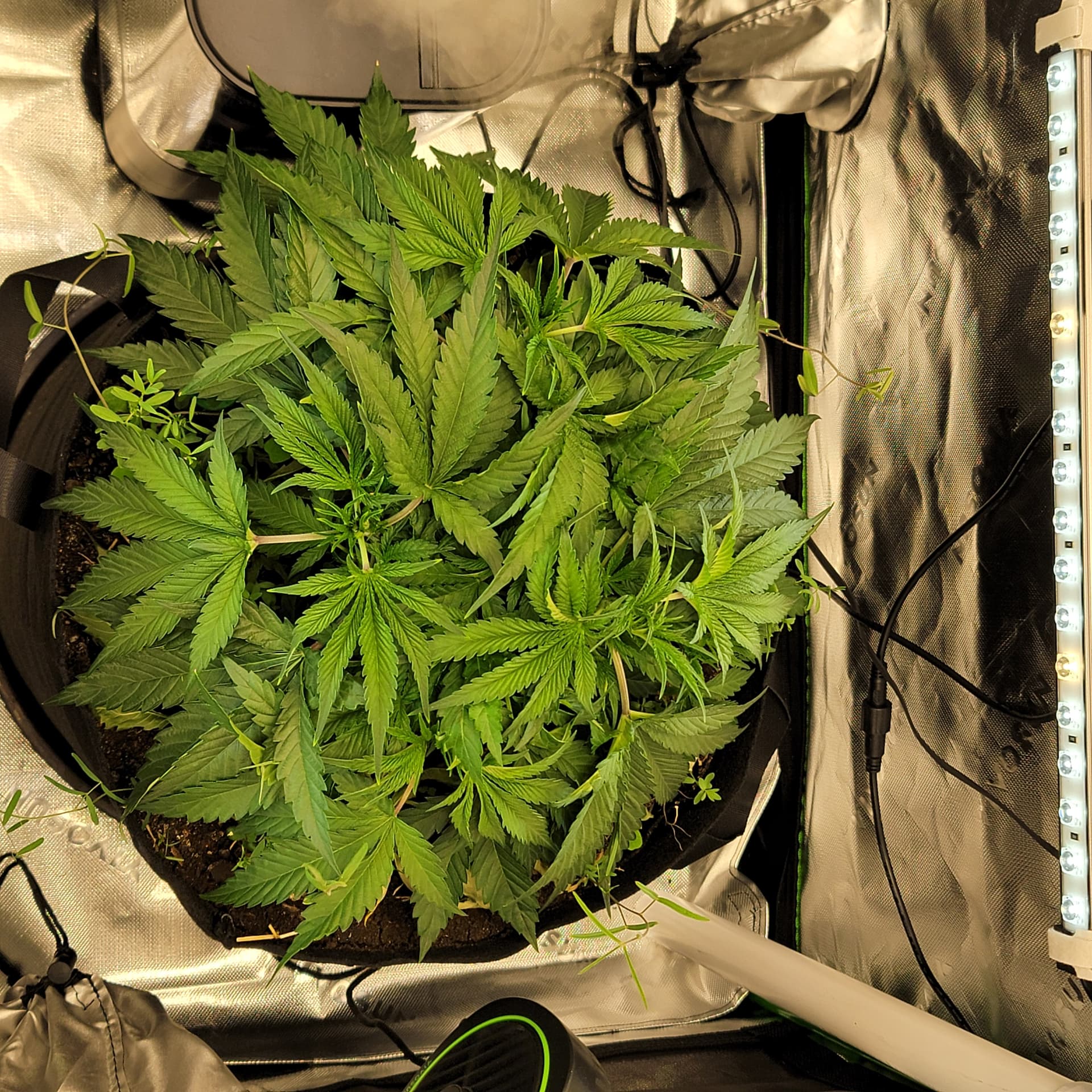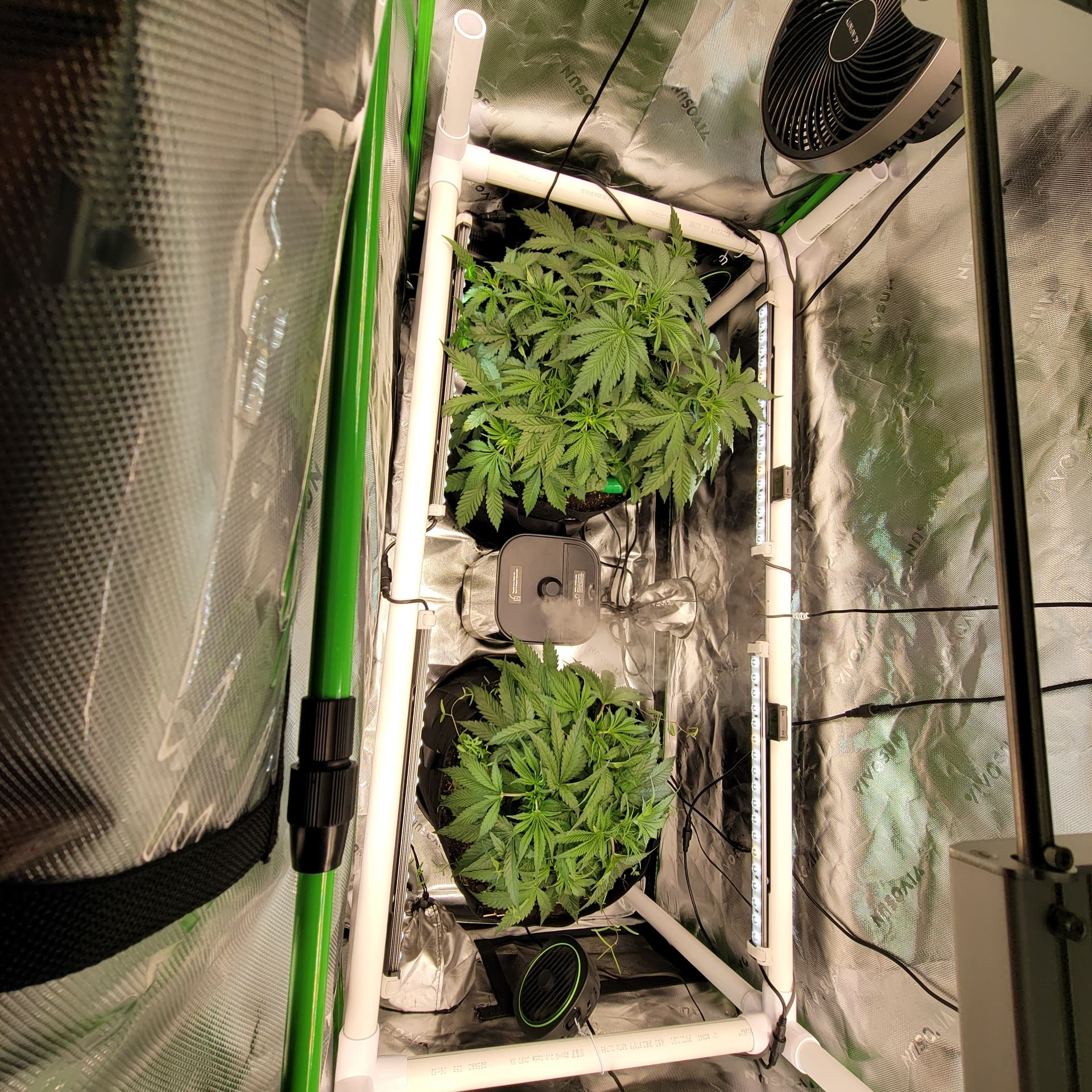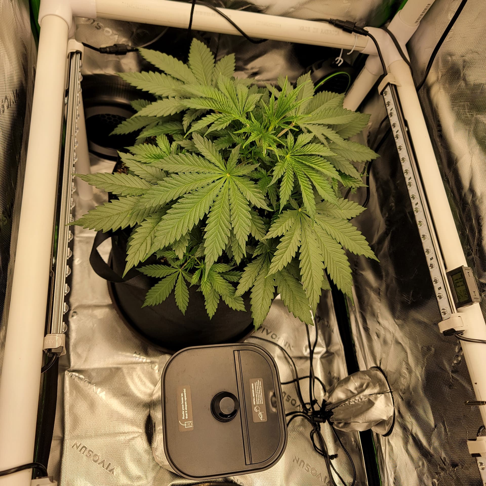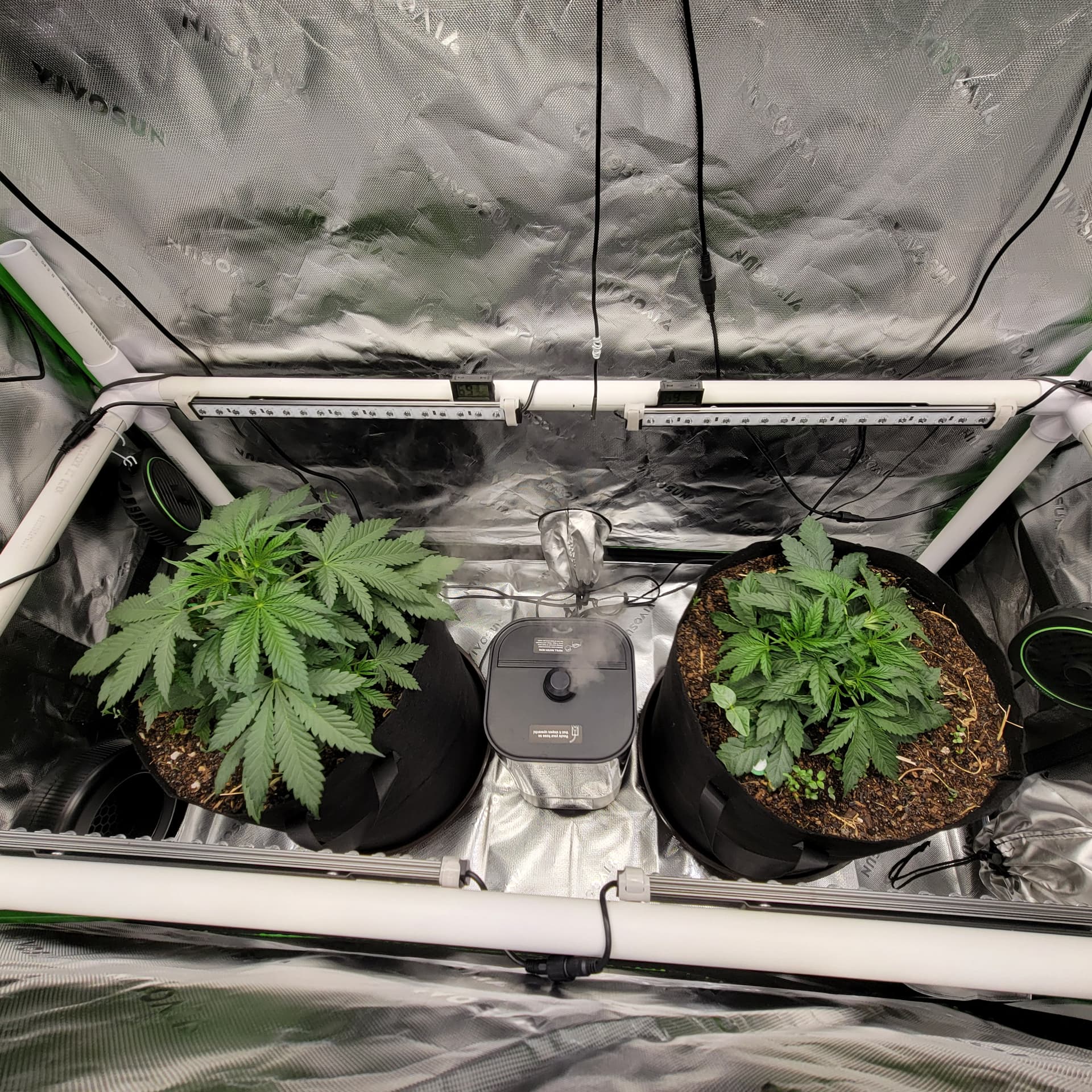 I also just defoliated the lower branches on the wedding cake and plucked the large fan leaves on both. My Monkey Slapz is going to be a dwarf plant . Trying to train her out a little . Before I flip to flower. It is what it is. Im going to water again today with just some rootwise mycrobe complete and some Quillaja 20 extract at 1/2 tsp per gallon. Im using the Ecowitt moisture meter sensors and I and trying to keep my moisture between 50% high and 30% low . Here are some pictures from then until now.