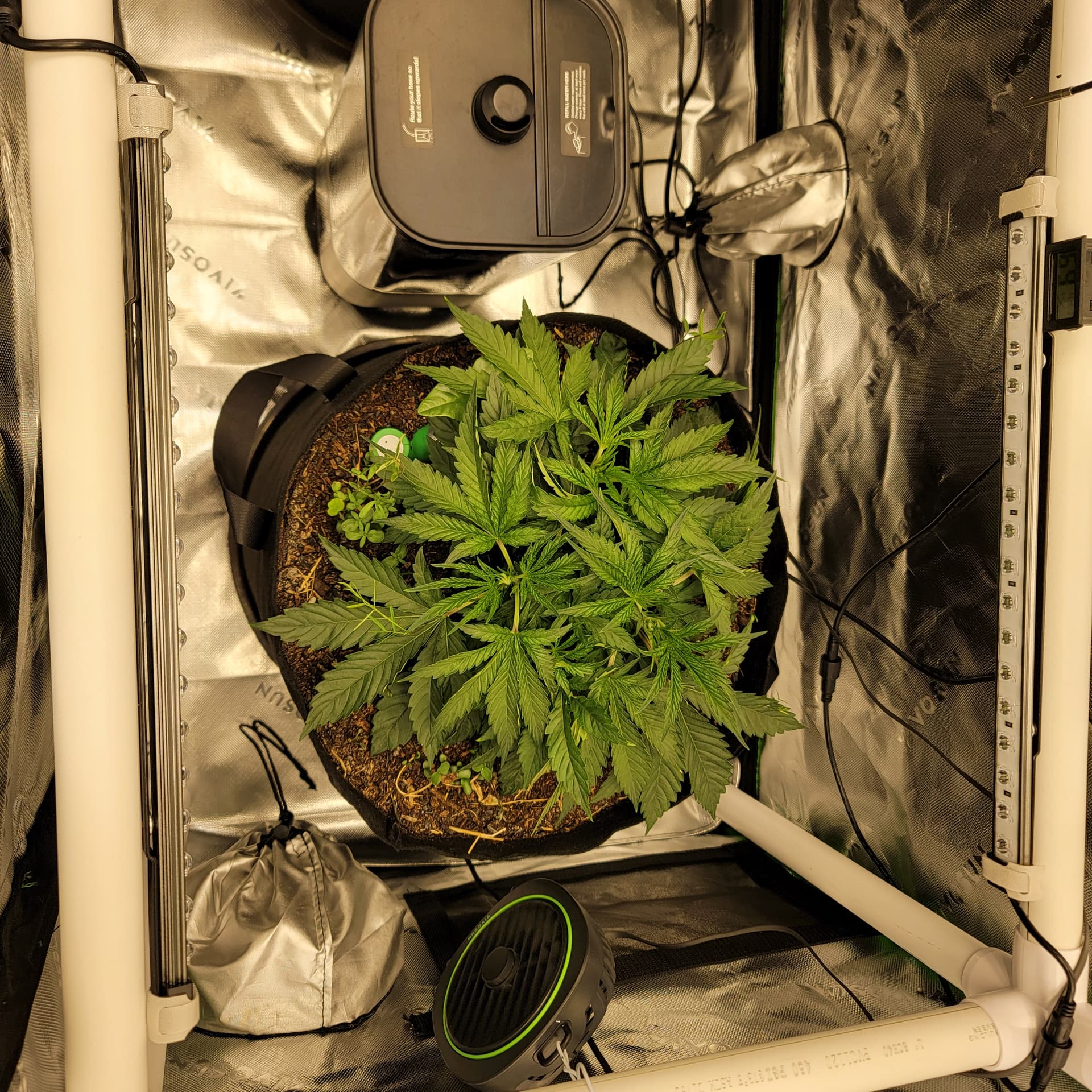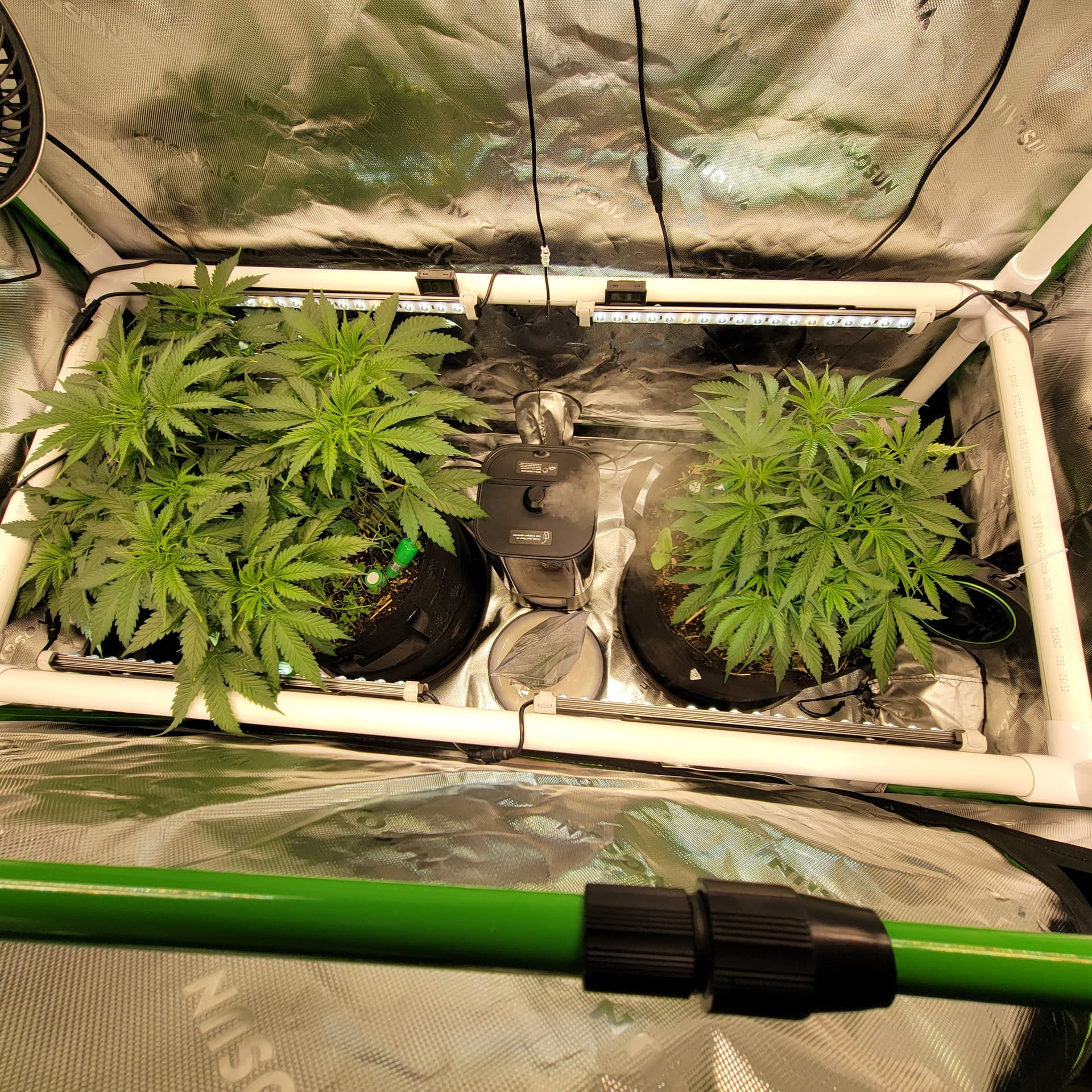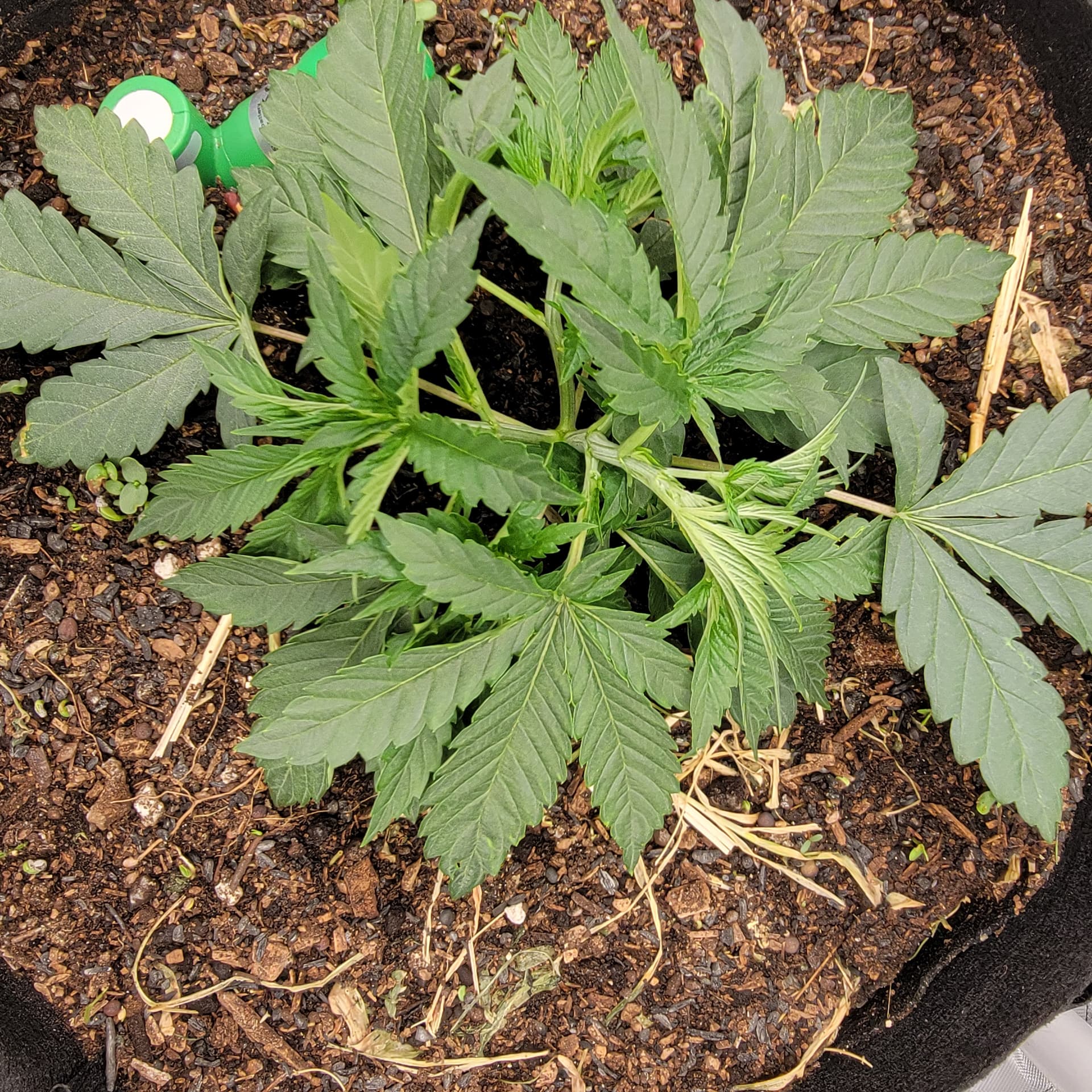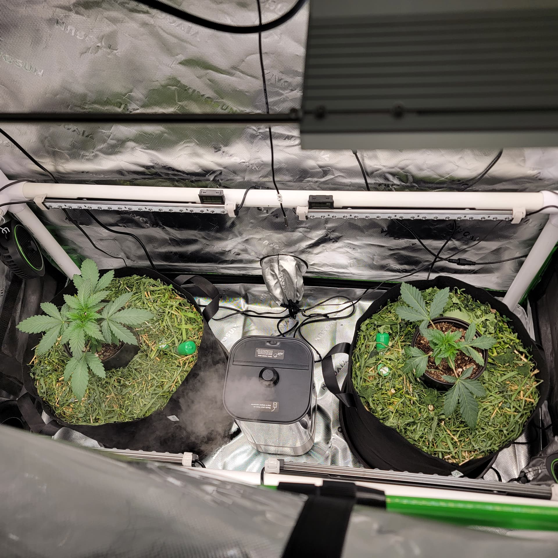 I also just defoliated the lower branches on the wedding cake and plucked the large fan leaves on both. My Monkey Slapz is going to be a dwarf plant . Trying to train her out a little . Before I flip to flower. It is what it is. Im going to water again today with just some rootwise mycrobe complete and some Quillaja 20 extract at 1/2 tsp per gallon. Im using the Ecowitt moisture meter sensors and I and trying to keep my moisture between 50% high and 30% low . Here are some pictures from then until now.