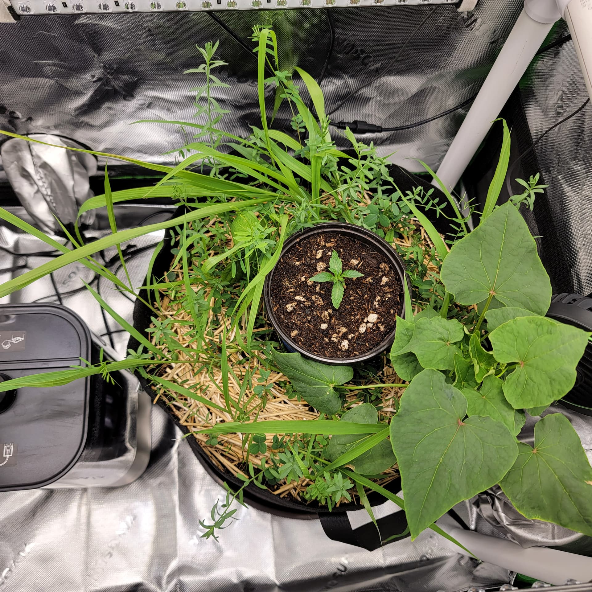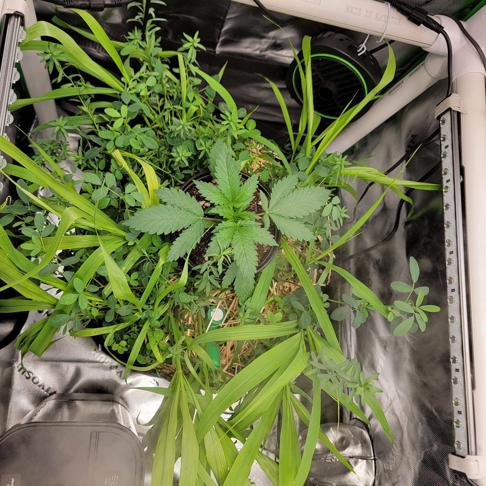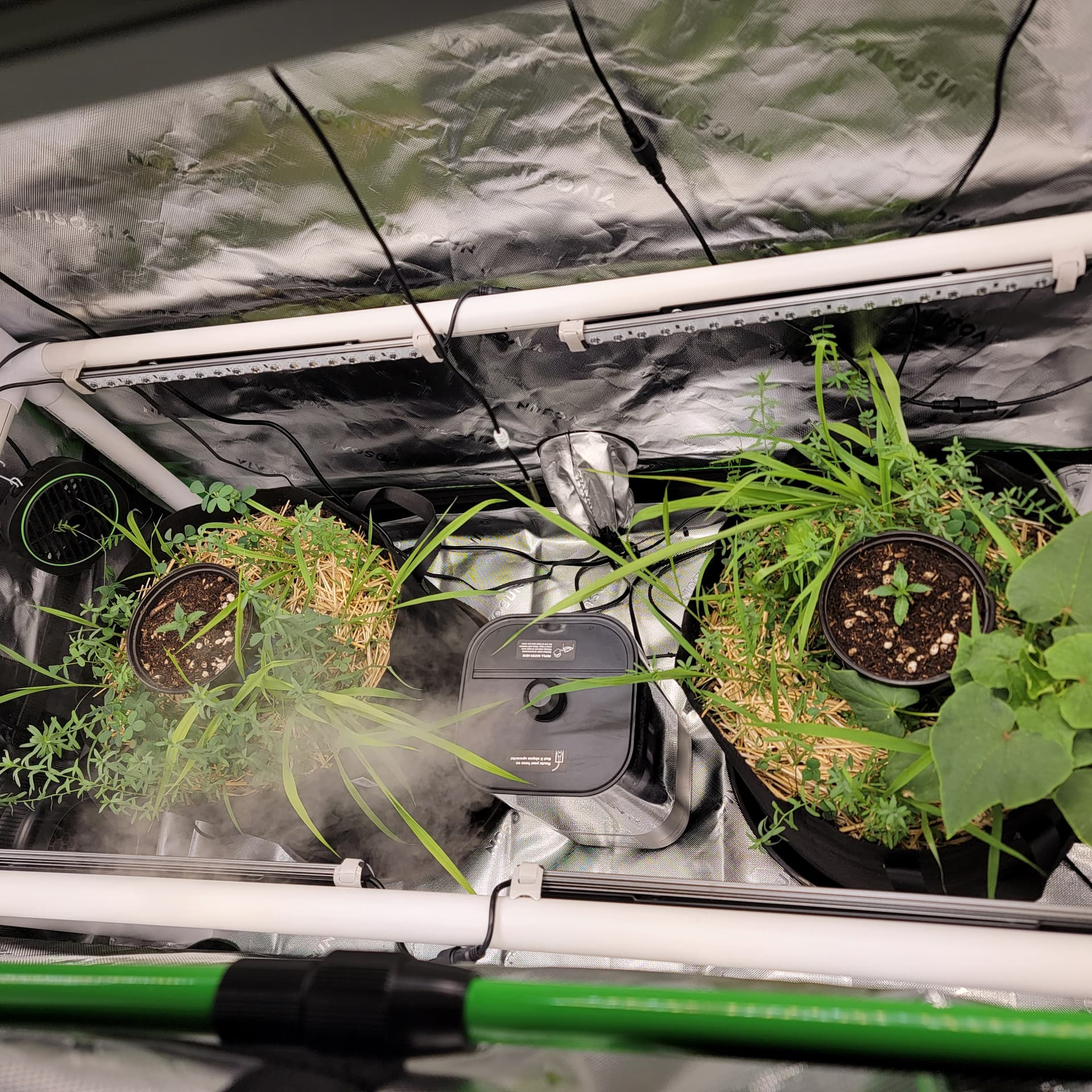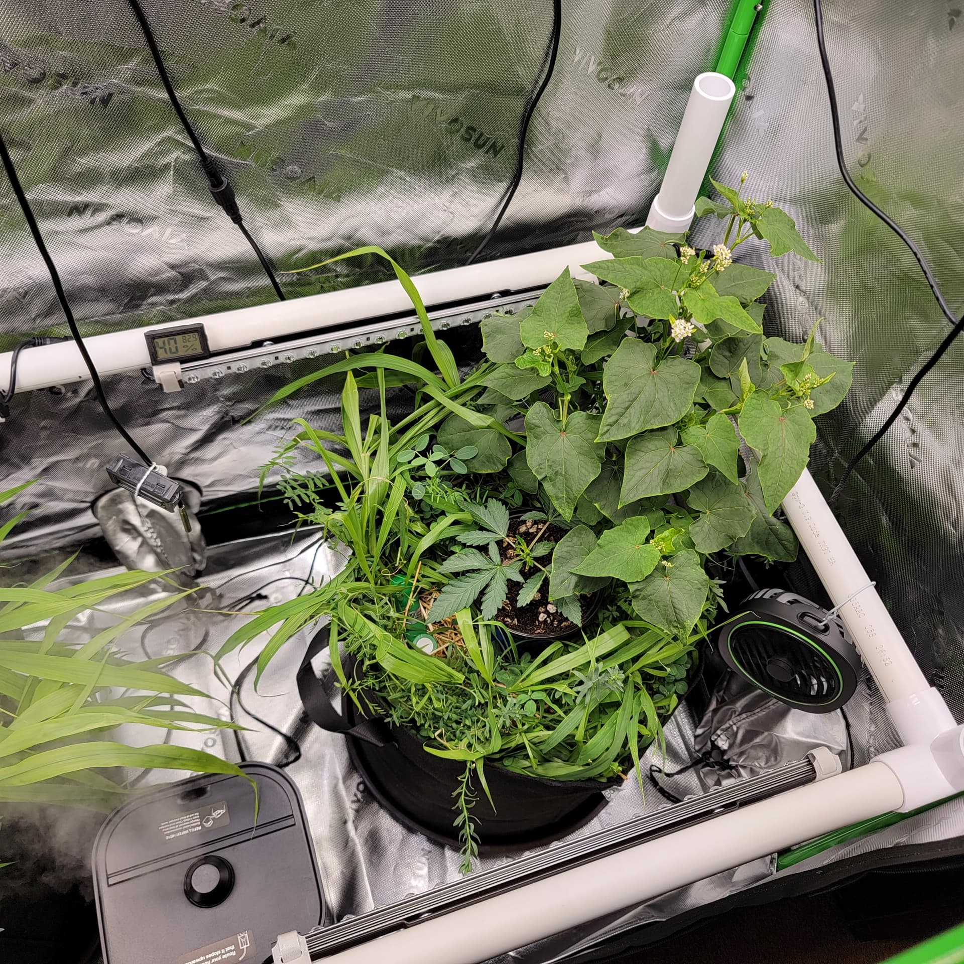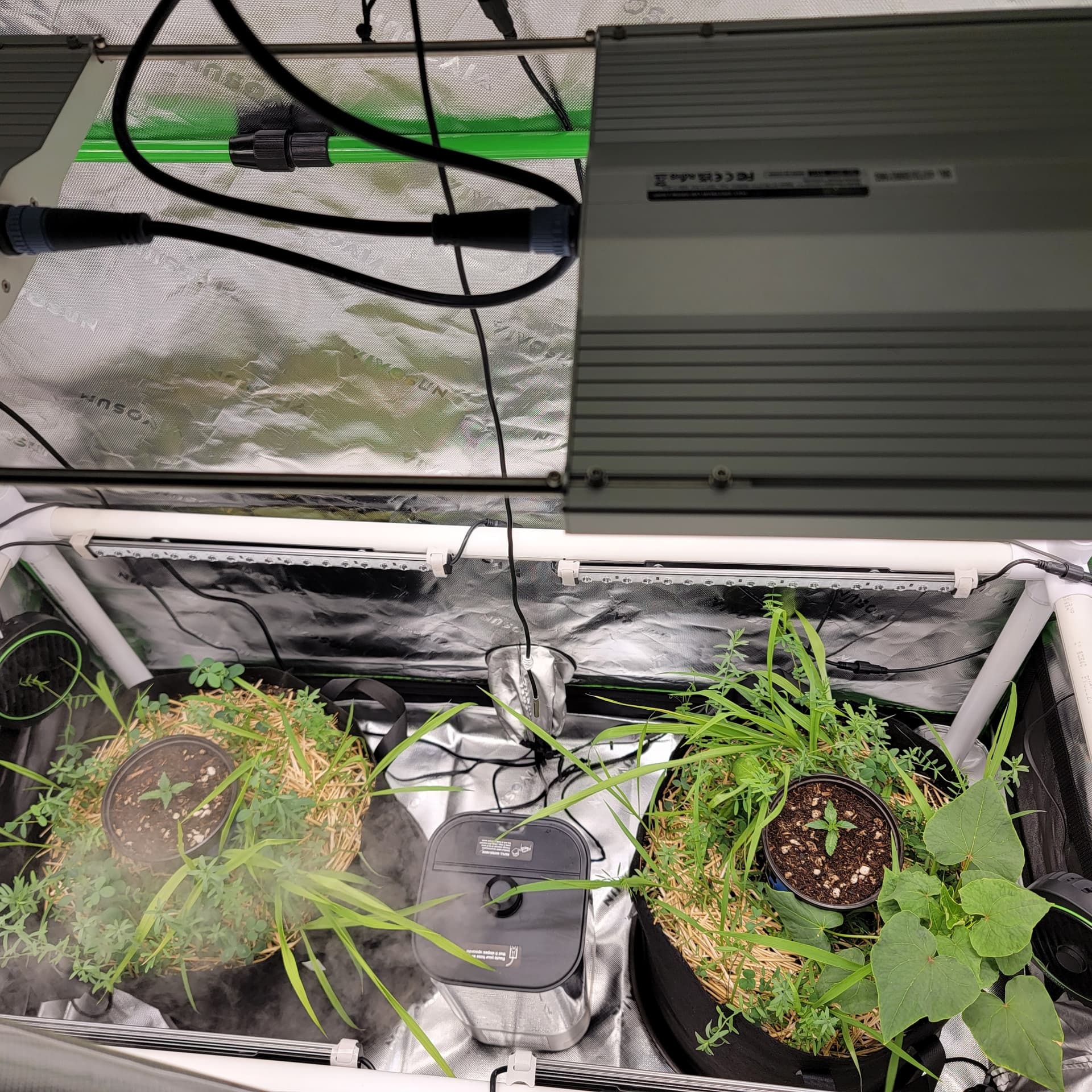I also just defoliated the lower branches on the wedding cake and plucked the large fan leaves on both. My Monkey Slapz is going to be a dwarf plant . Trying to train her out a little . Before I flip to flower. It is what it is. Im going to water again today with just some rootwise mycrobe complete and some Quillaja 20 extract at 1/2 tsp per gallon. Im using the Ecowitt moisture meter sensors and I and trying to keep my moisture between 50% high and 30% low . Here are some pictures from then until now.