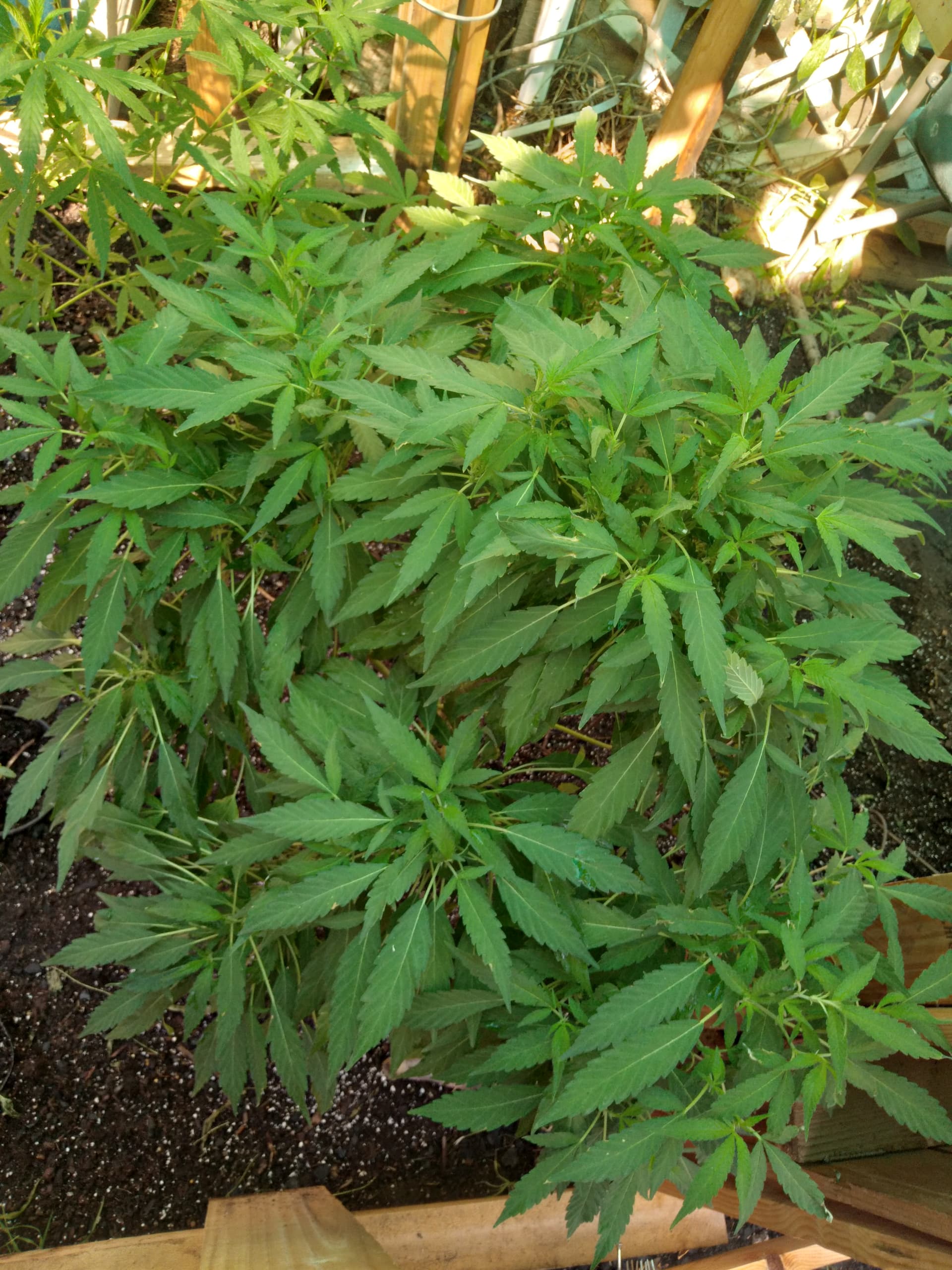 These will still be monsters (in size) One died, one did not re-veg well (smallest shadow on left in line of plants in photo, one small pot is empty with no plant shadow) but the other six are going crazy. I filled the empty spot with a fresh Sour Diesel in May and the rate of growth is astounding. These should easily grow well over my head and greater than six feet across.