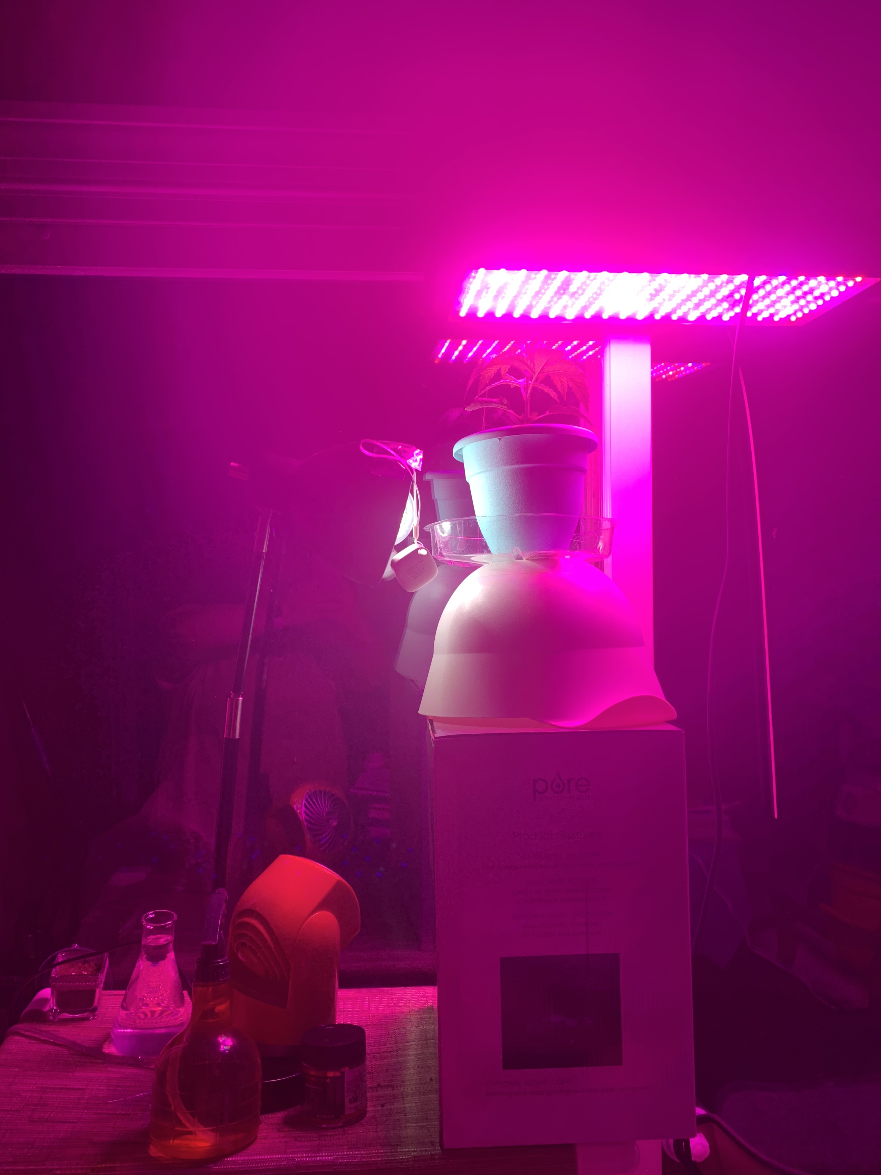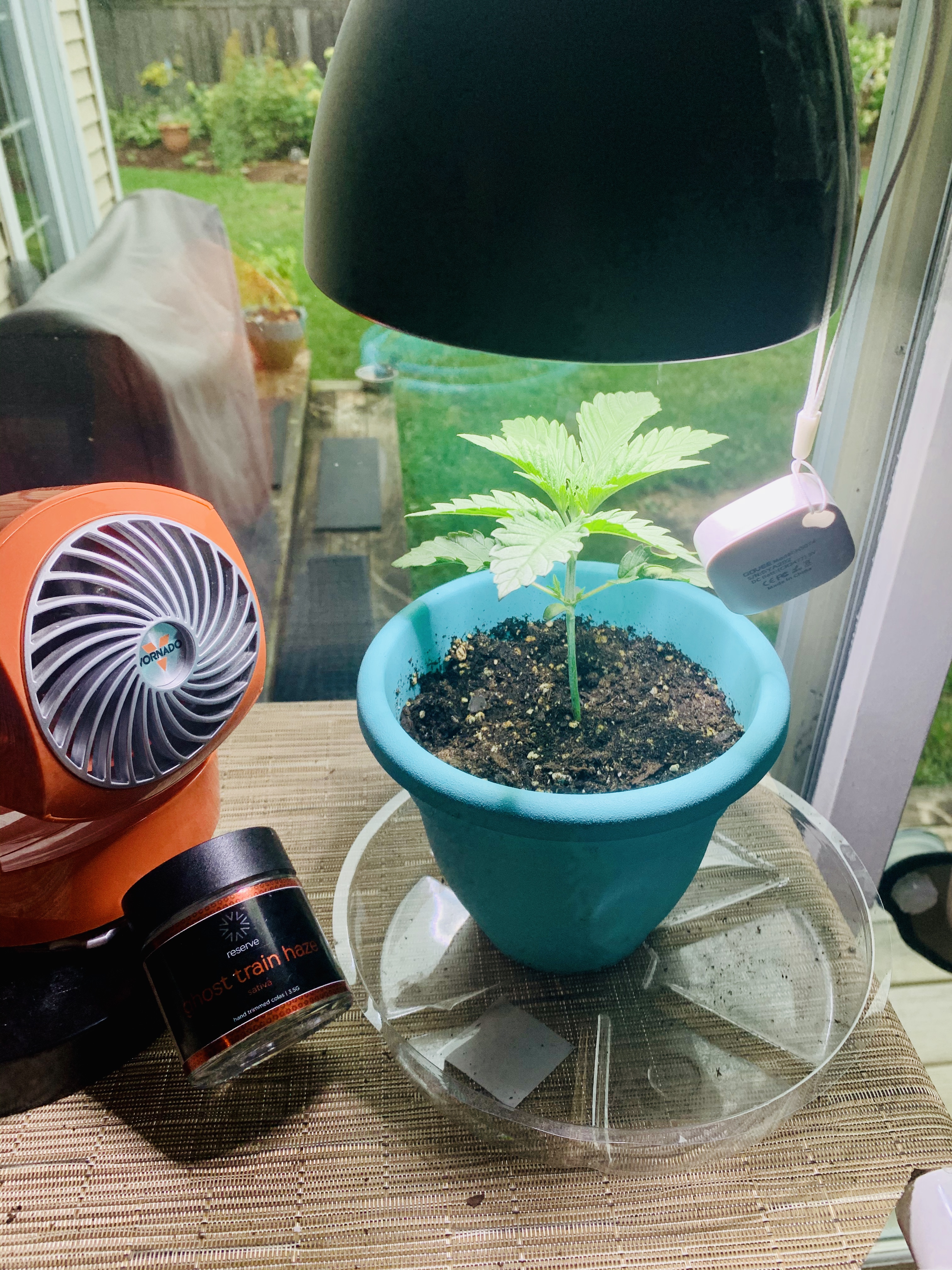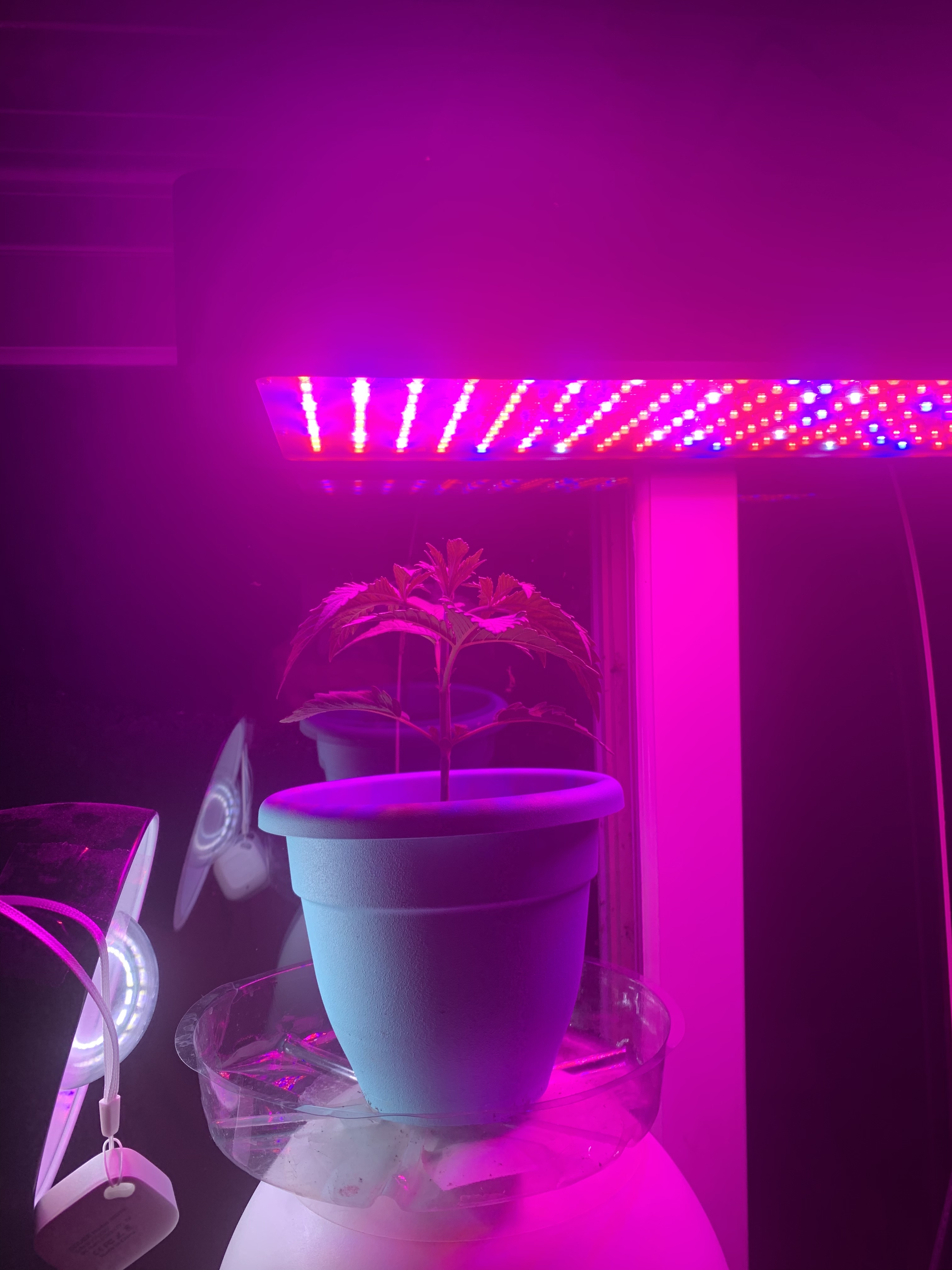 I’m going to transplant lucky as soon as all the stuff for me to make the soil arrives! It’s 3 gallon fabric pot and it’s water tray are ready to go. Here’s the current setup. I know it’s kinda ghetto the way I set it up but I think it will work until I get the grow tent.