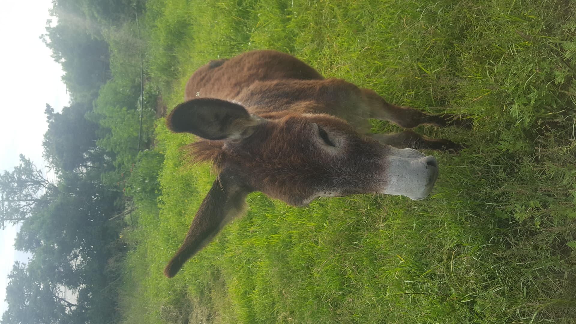 A picture of Rasta, the youngest donkey on our farm. Shortening the grass and looking after the outdoor weed plot.