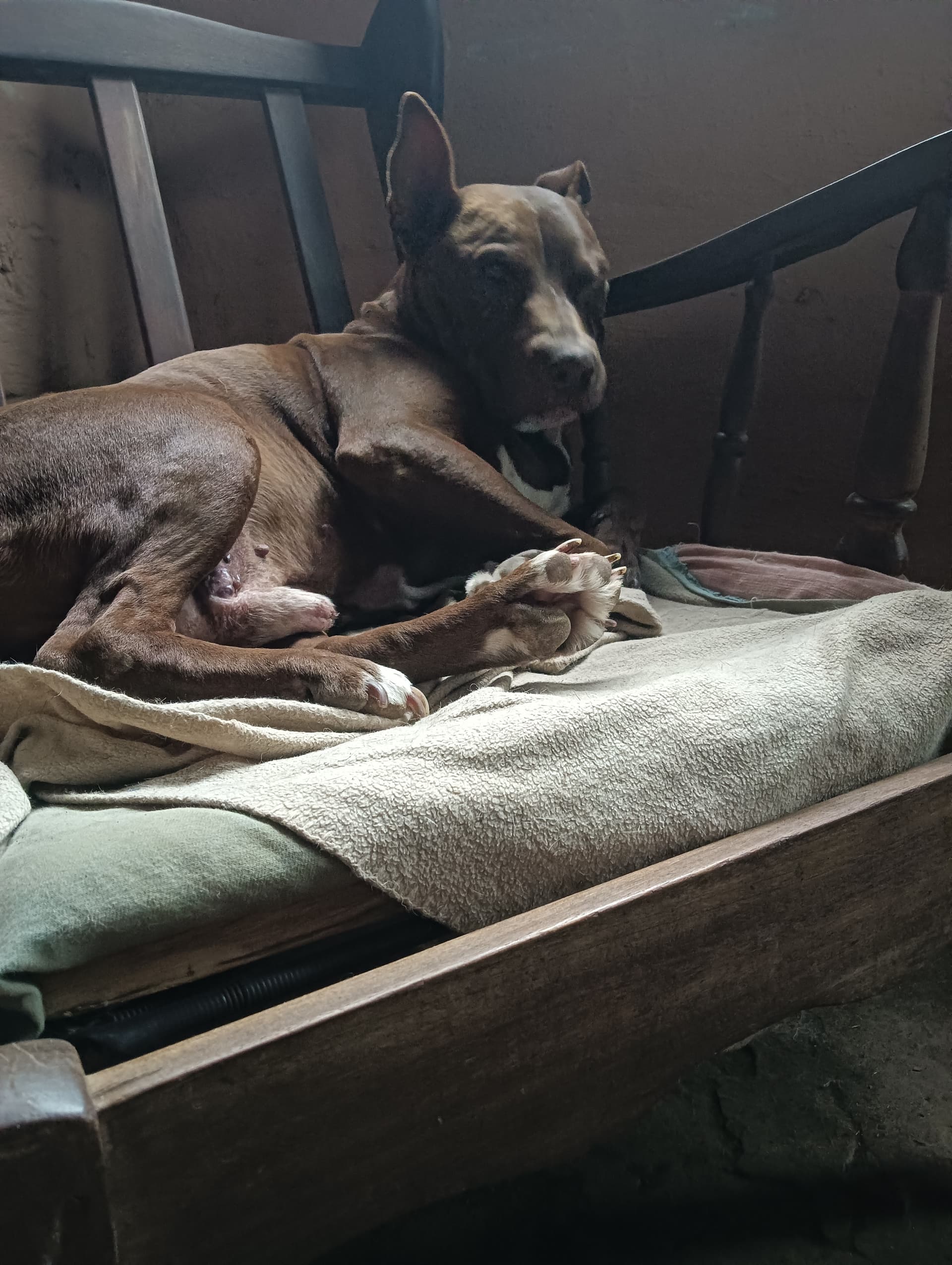 So I mentioned Kashi was raised by cats, and here’s one of his parents. Meet Kagome. Right now I have 5 cats, 3 of which were rescues. The other 2 were born here. Had north of 30 cats a couple years back lol. So, the rescued cats raised my rescued pit. Kagome is the only one allowed outside, she’s got 6 toes on each paw, and due to an incident with a black lab/pit I rehomed, she is brain damaged. Nothing malicious, the other dog who I rehomed tapped the back of her head into the floor real hard while playing. She was preggers too. She gave birth while lethargic to 7 kits, re homed 6 of them. I’m outta the rescue biz nowadays, got my forevers now. More pics n less words later lol.