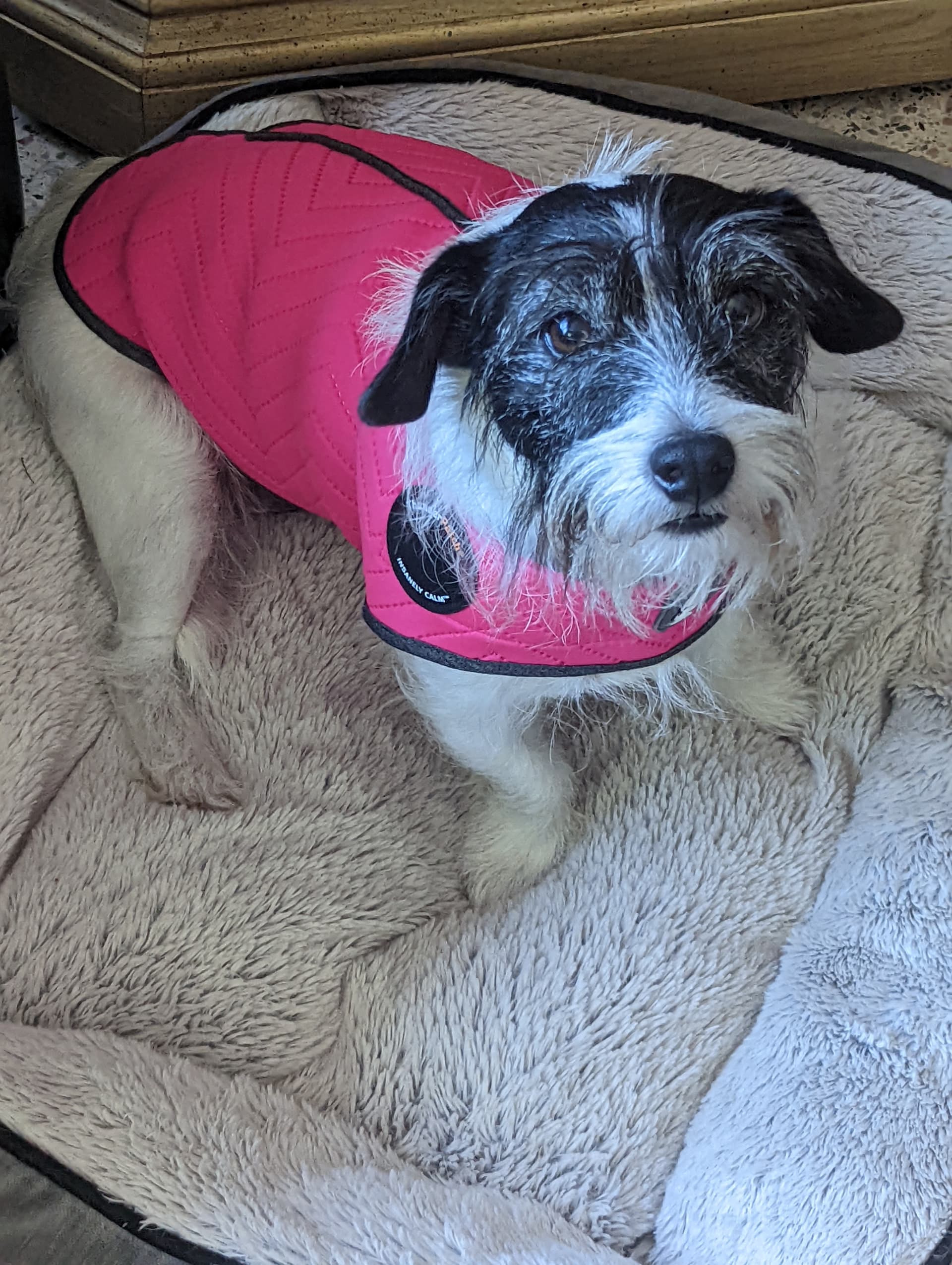 Lol Flasher!! The only other choice was gray, and thatâs blah. . . I think the hot pink looks really good on a black and white dog! In fact, his vest-harness is pink too!