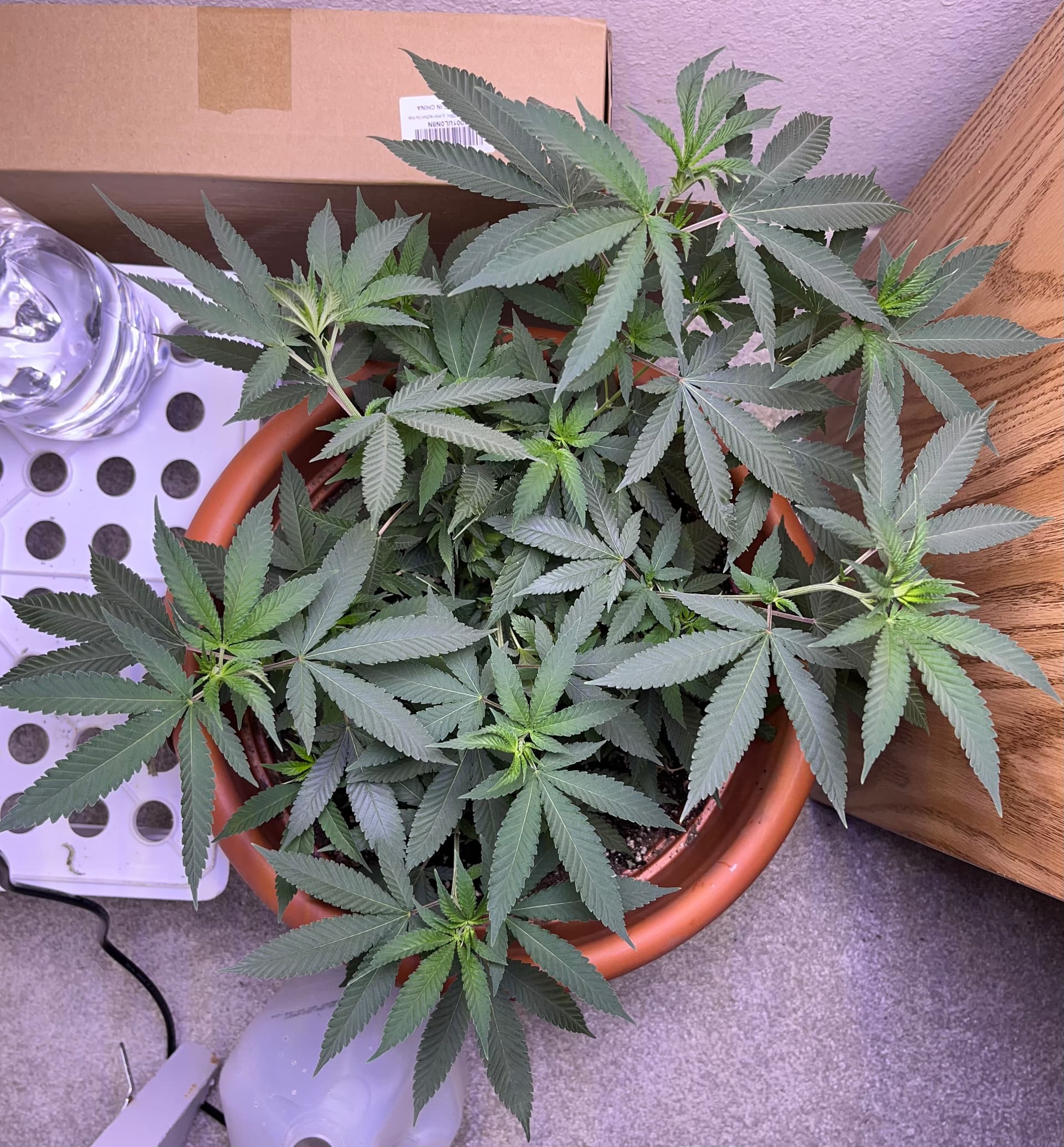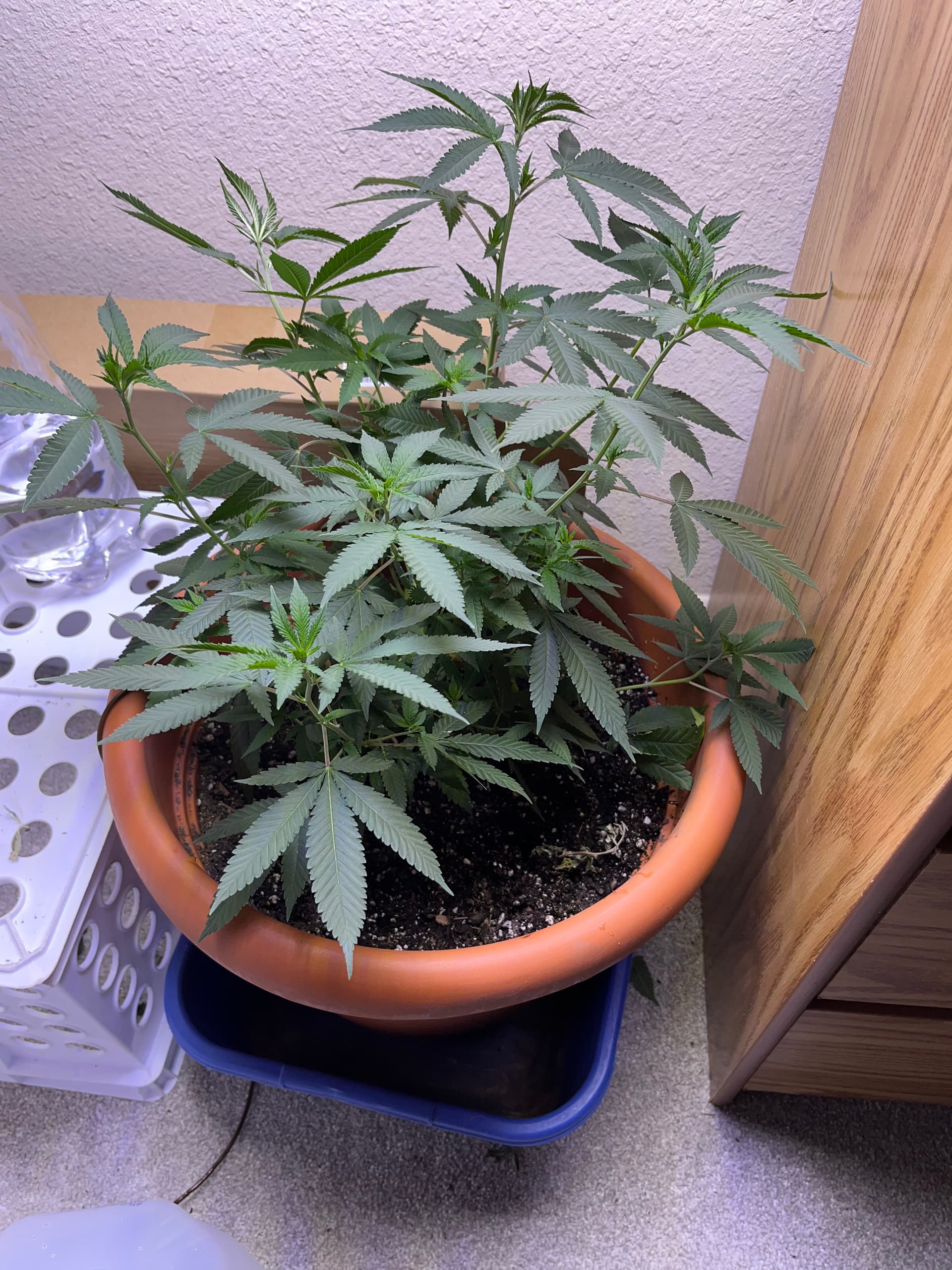 She looks very healthy though not so tall as I had thought she might be. I received her as a seedling, pictured below, on June 3, had a couple of weeks of inadequate light before getting my big LED array. She’s grown steadily, if slowly, since then. I have wanted to start her on flowering light when I got home and would love to hear from you all as to whether this is too soon to do that. Now we’ll find out if I know how to post pictures – can’t hold a thought at my age, so have to learn it anew every time.