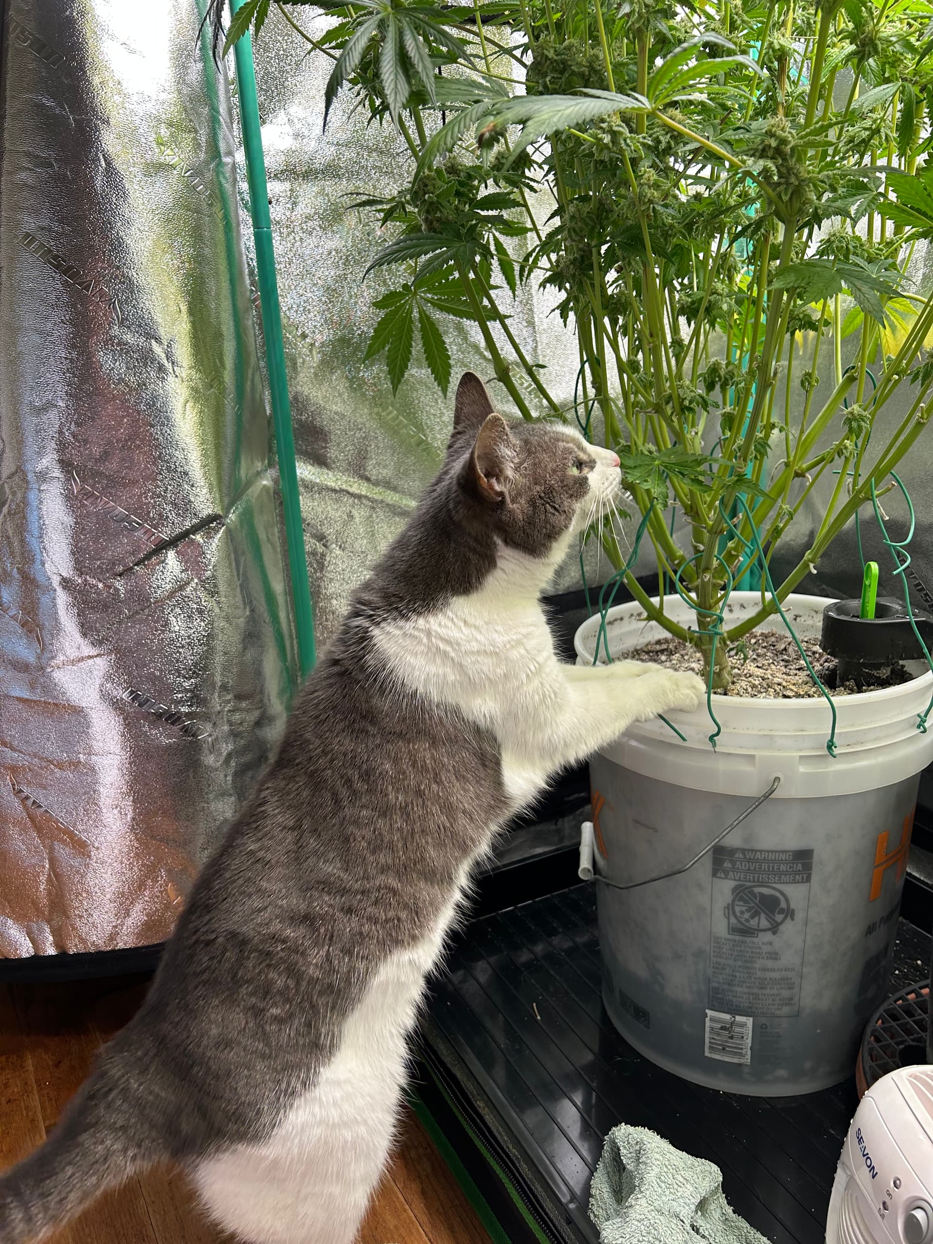 My little cat meows at me all morning until I open the tent to do my daily maintenance. Each day, she eats exactly one fan leaf. Not sure exactly why/what she likes about it, but she really enjoys and looks forward to her daily leaf.