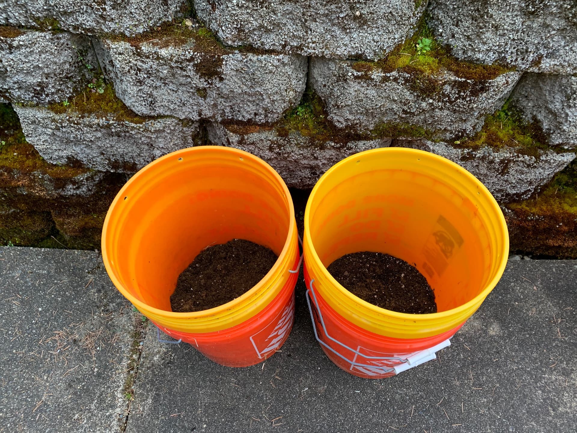 The top buckets have holes in them to drain into the bottom buckets. The buckets are now sitting in the downstairs bathroom/drying room with the big black saucers on top to use as lids. I’ll take them out to sit in the sun later.