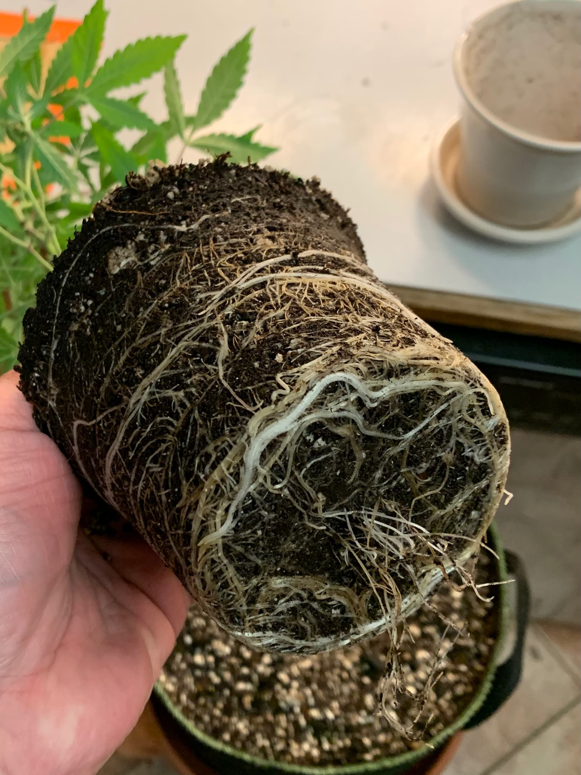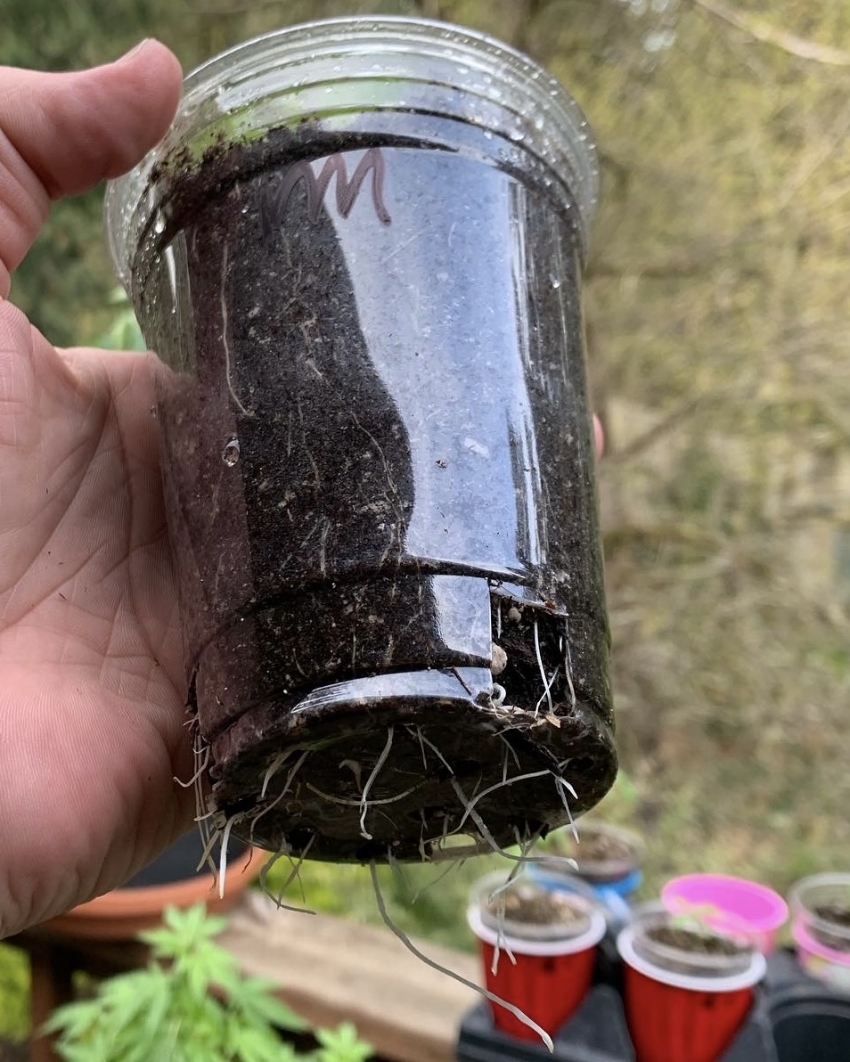 Then he picked the plant up to show us the underside of the plant… And there were THREE plants in this pot. He intentionally grows THREE autoflowers in one 5 gallon pot. then this conversation happened.