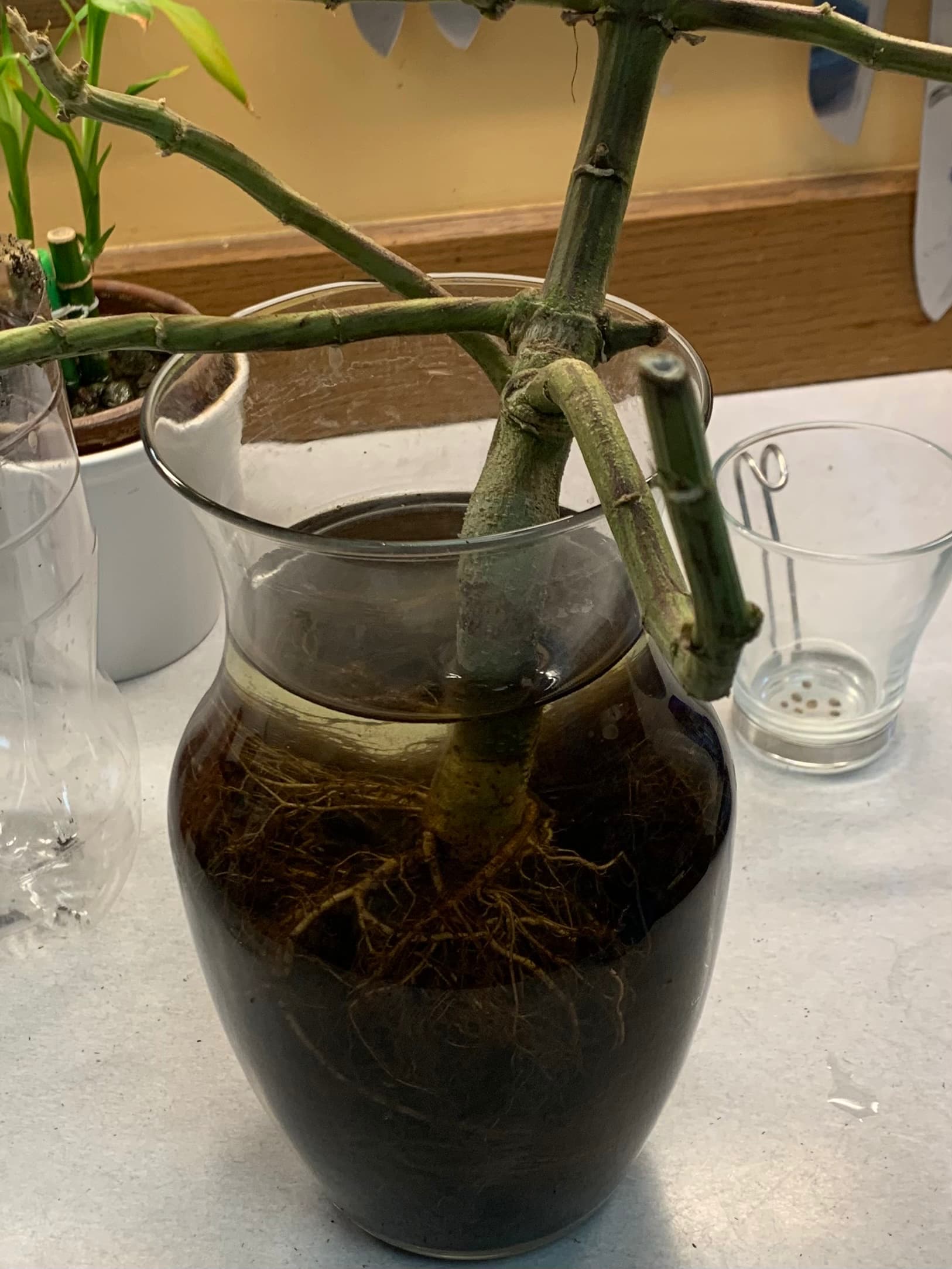 12 Move under 9. Had roots like this. (this plant is 6 months old, planted in Sohum, with nothing but tap water [now with fish!t or recharge ]. I didn’t think it would grow.)