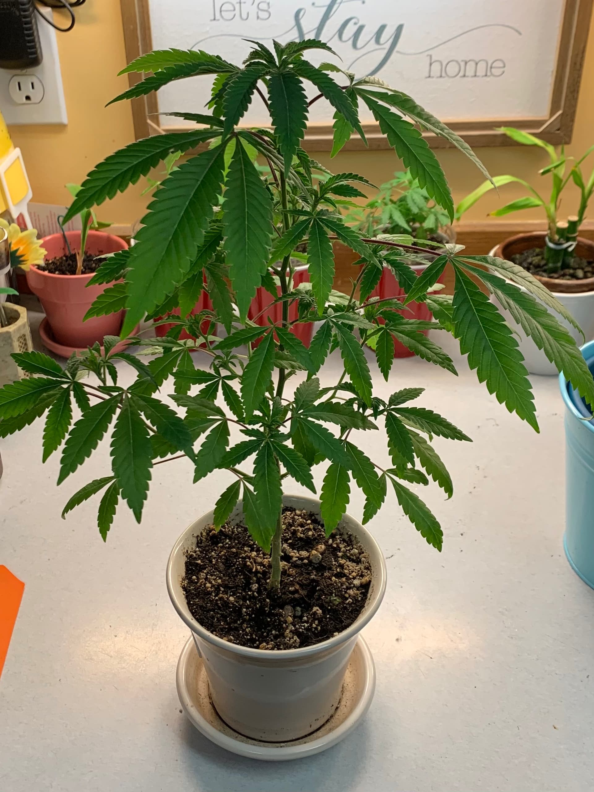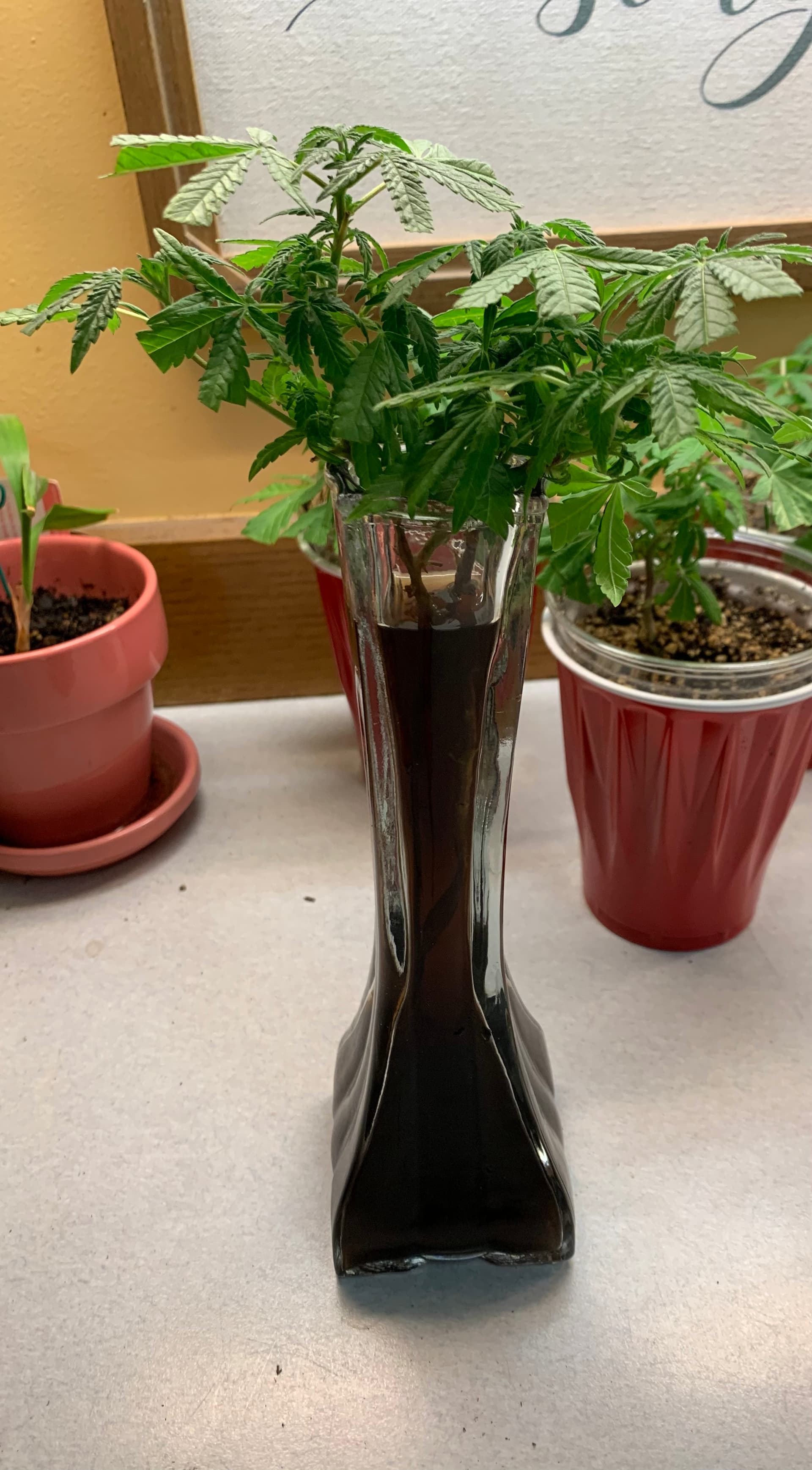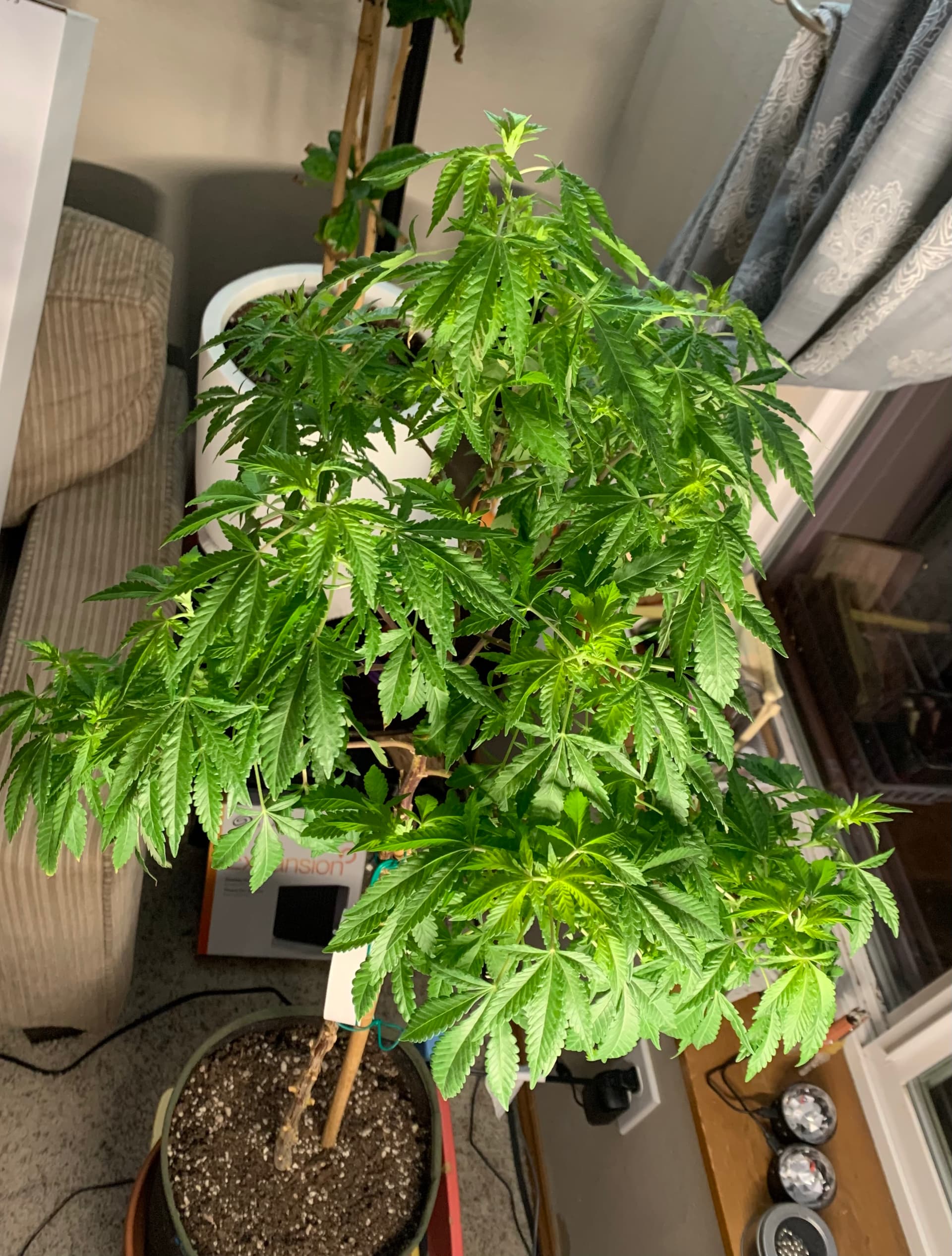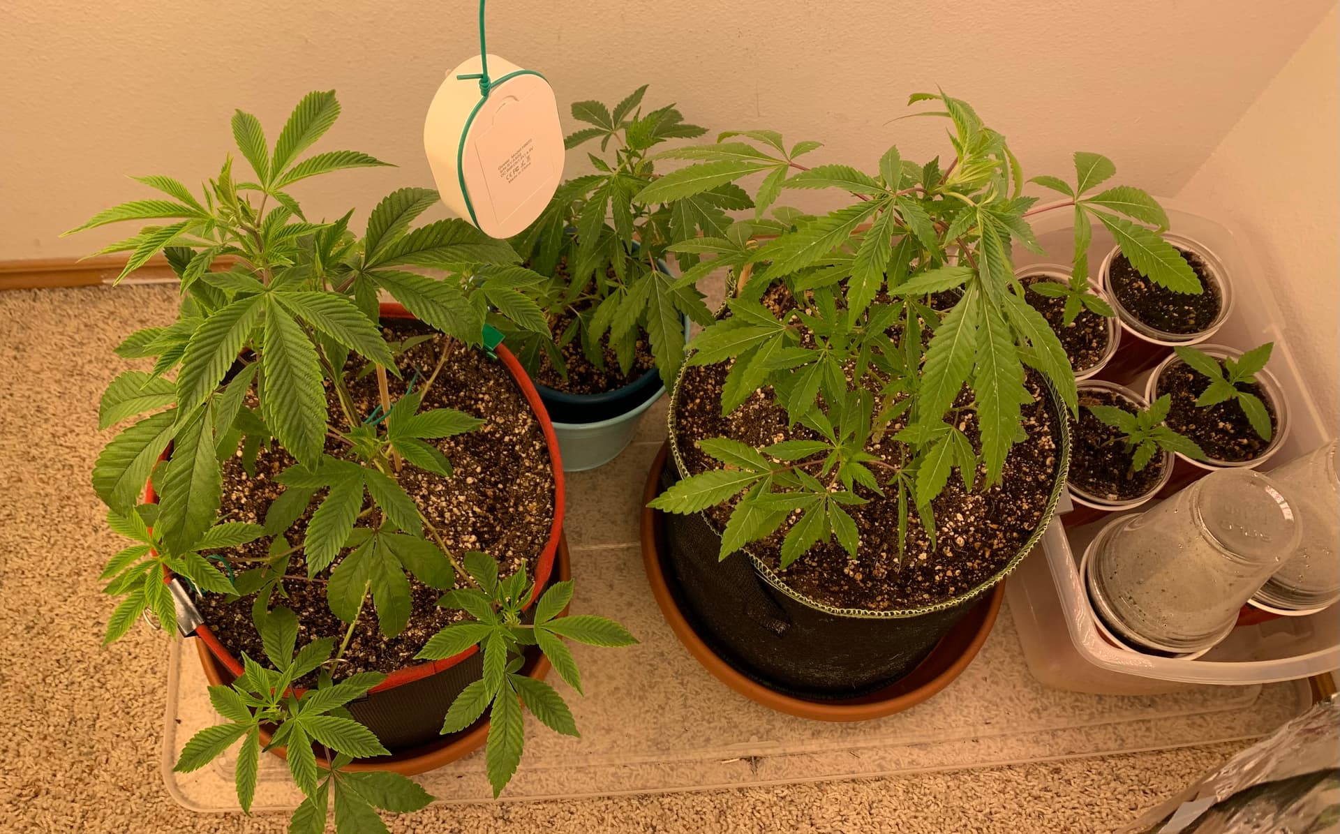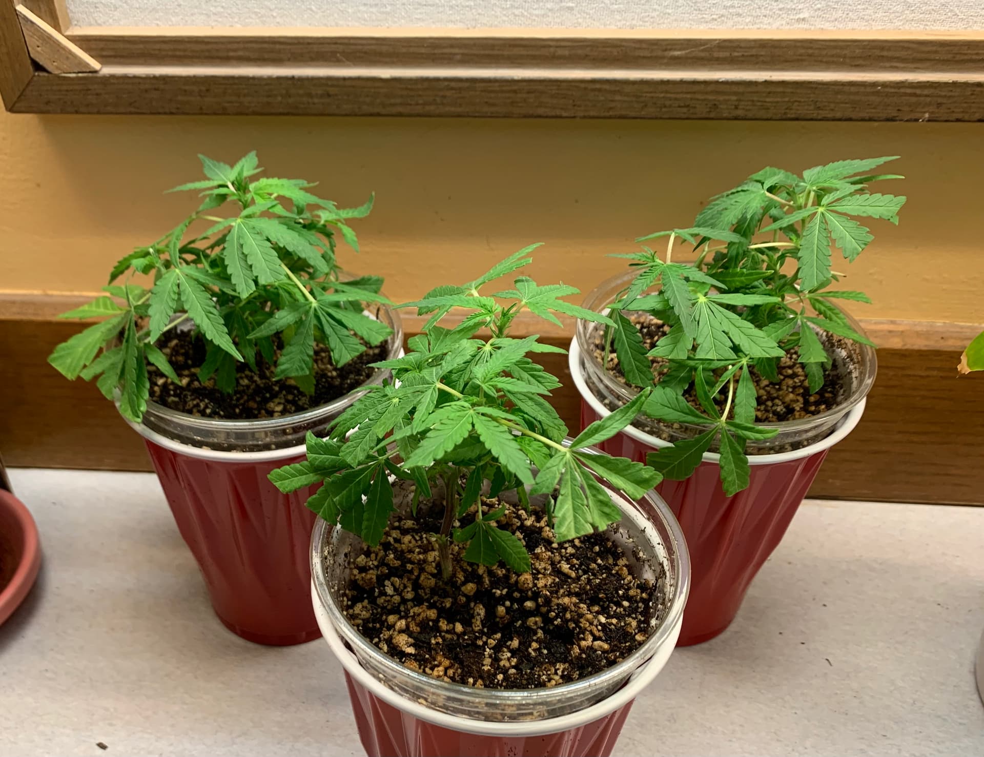 4 It’s almost bed time for everyone. My kush is the red pot looks awful. She had been in coco and perlite for a few days after got her with just water and a little miracle grow (gasp) that I had for my houseplants. Anyway, I knocked as much of the coco and perlite out of the roots as I thought was safe and tried to carefully plant it in the Sohum. She did NOT like that. @1sttimegrower You might want to treat your two with a little more care when you transplant them. I’ve been watering with either water and fish shit or water and recharge. I might have to ammend with something.