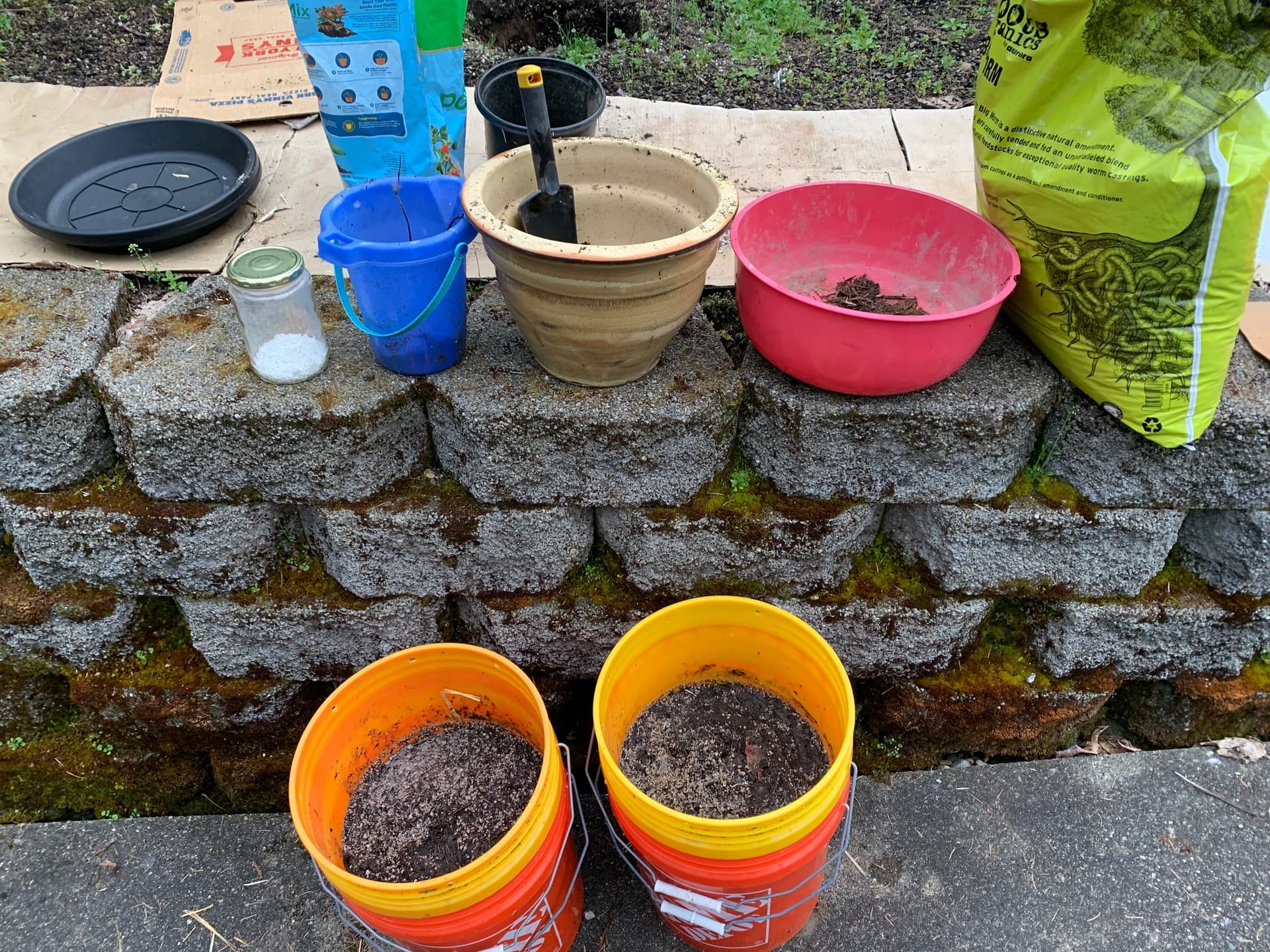 So I ended up making two layers of crumbled bale, worm castings, eggshells that I’ve been cleaning/collecting/smashing for about half a year, a bunch of veggie and fruit scraps, and the little blue bucket had the fine material and small chunks that I collected out of my fire pit (thanks @LoCoRocK ), and fresh straw… all sandwiched in between two layers of dirt that I dug out of the garden. I was going to put some pond muck in there, but I got too wrapped up and forgot about it.