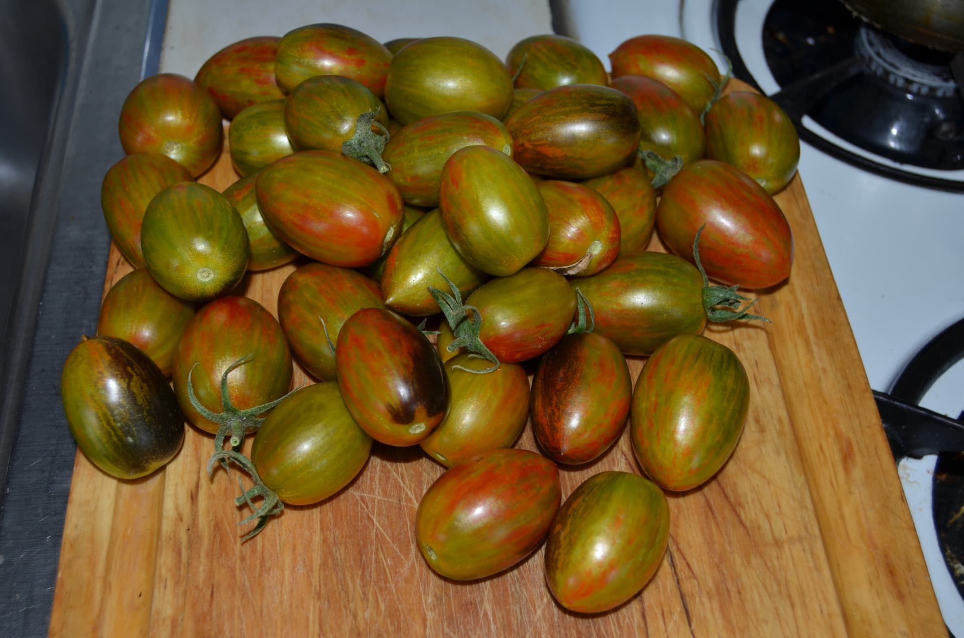 Finally the monster cherry tomato got a few ripe, it has TONS of tomatoes on it, but they have a long ripen time. They are bigger than most cherry tomatoes and oval. Making a big salad tonight with most of it from my garden.