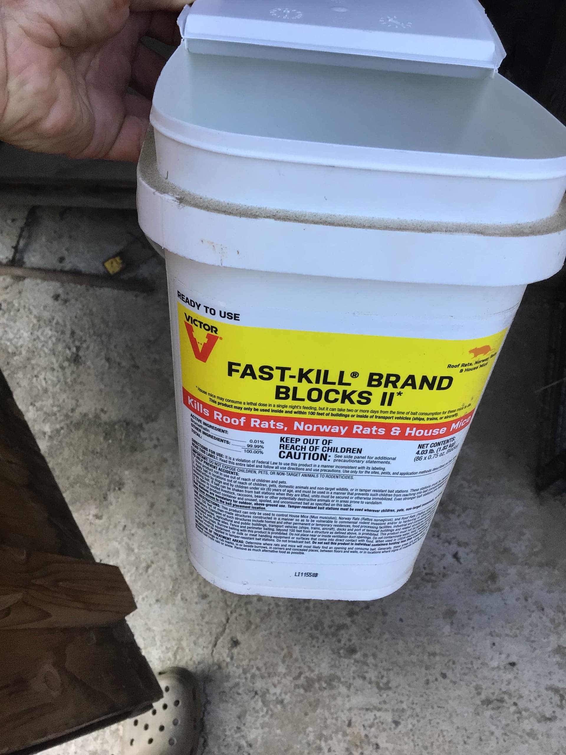 Well this should take care of them. Fairly quickly too. I think I got it at Home Depot or Loweâs probably Home Depot. I just take a hot glue gun crank it up high. Get a 2 x 4 or something similar footer too long, put a big glob of hot glue on the 2 x 4 impress one of these little square things down. The glue pushes up through the hole. This prevents them from carrying it anywhere. Wouldnât want another animal like a dog or a cat to get this stuff. Anyways, I put about 10 of them on a board and slide it under my shed I also put one under my container. If you can fit the 2 x 4 in there the rat can get in there. You just want it tight enough for your dog or cat canât get to it. ![]()