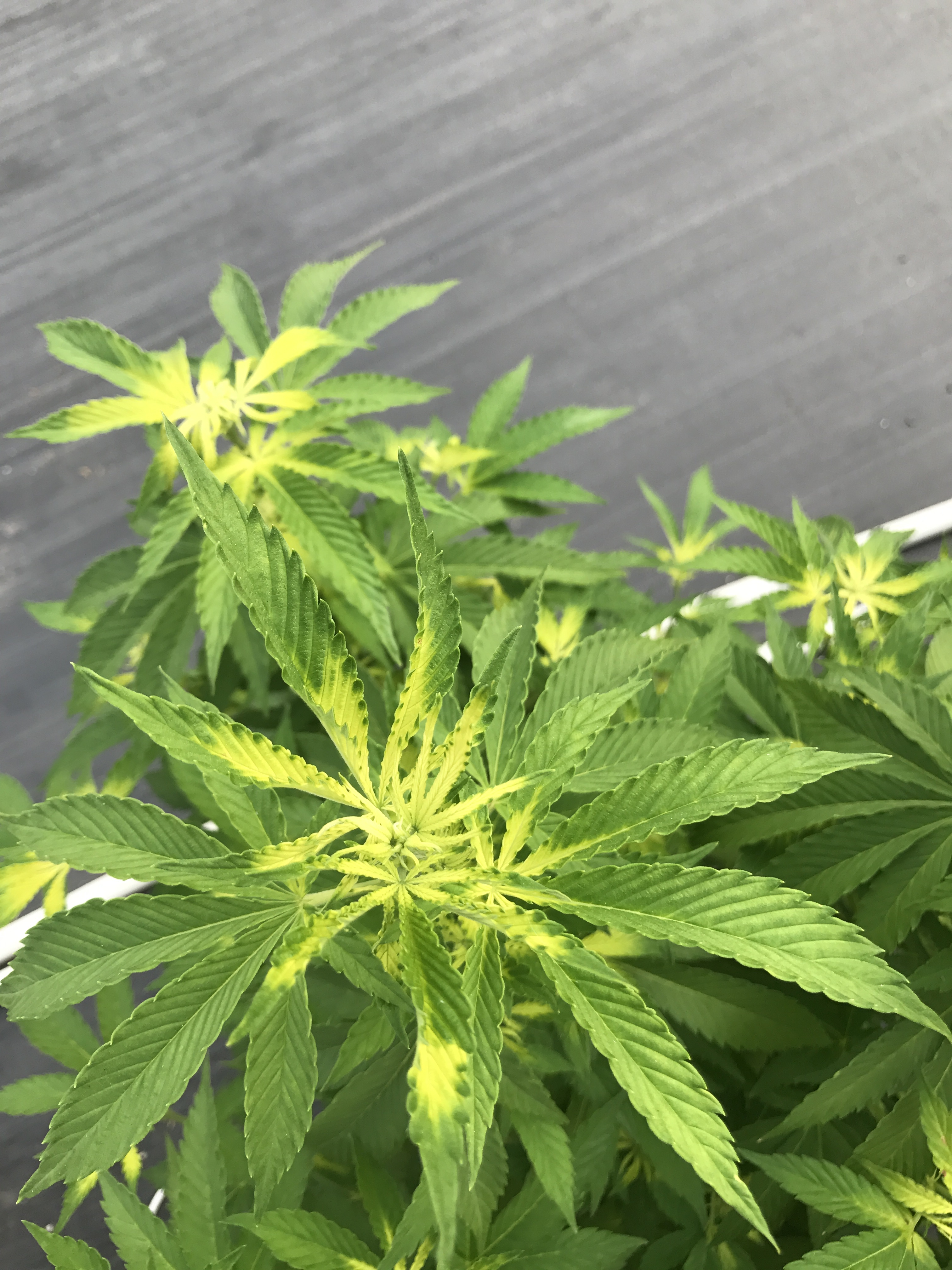 This is the same farm only with plants in 5 gal planters. I just noticed this odd colorization on the tops of the plants ! it happened over a few days. I don’t know if it is related to the other discoloration or not? I am leaning toward the watering system.