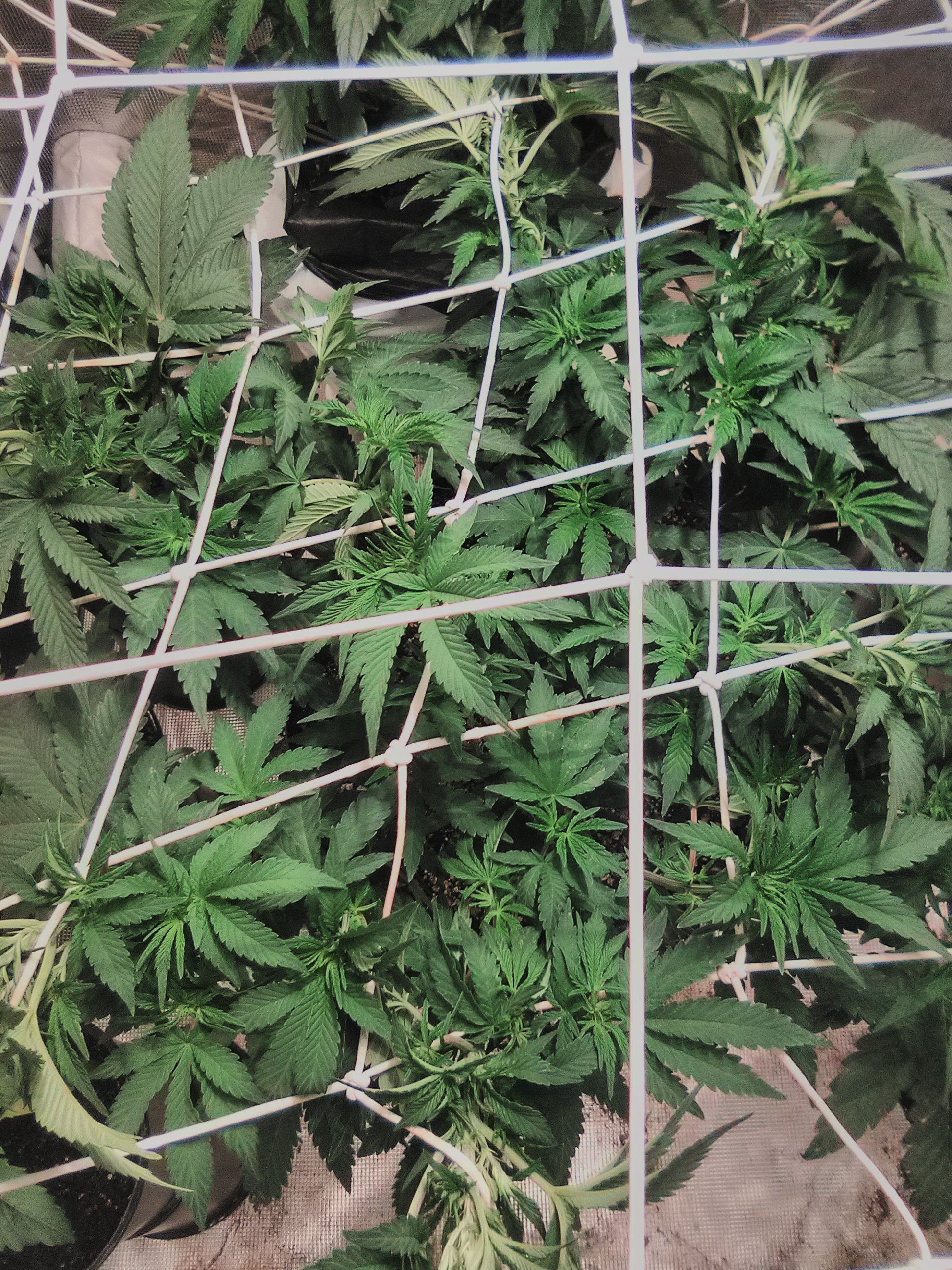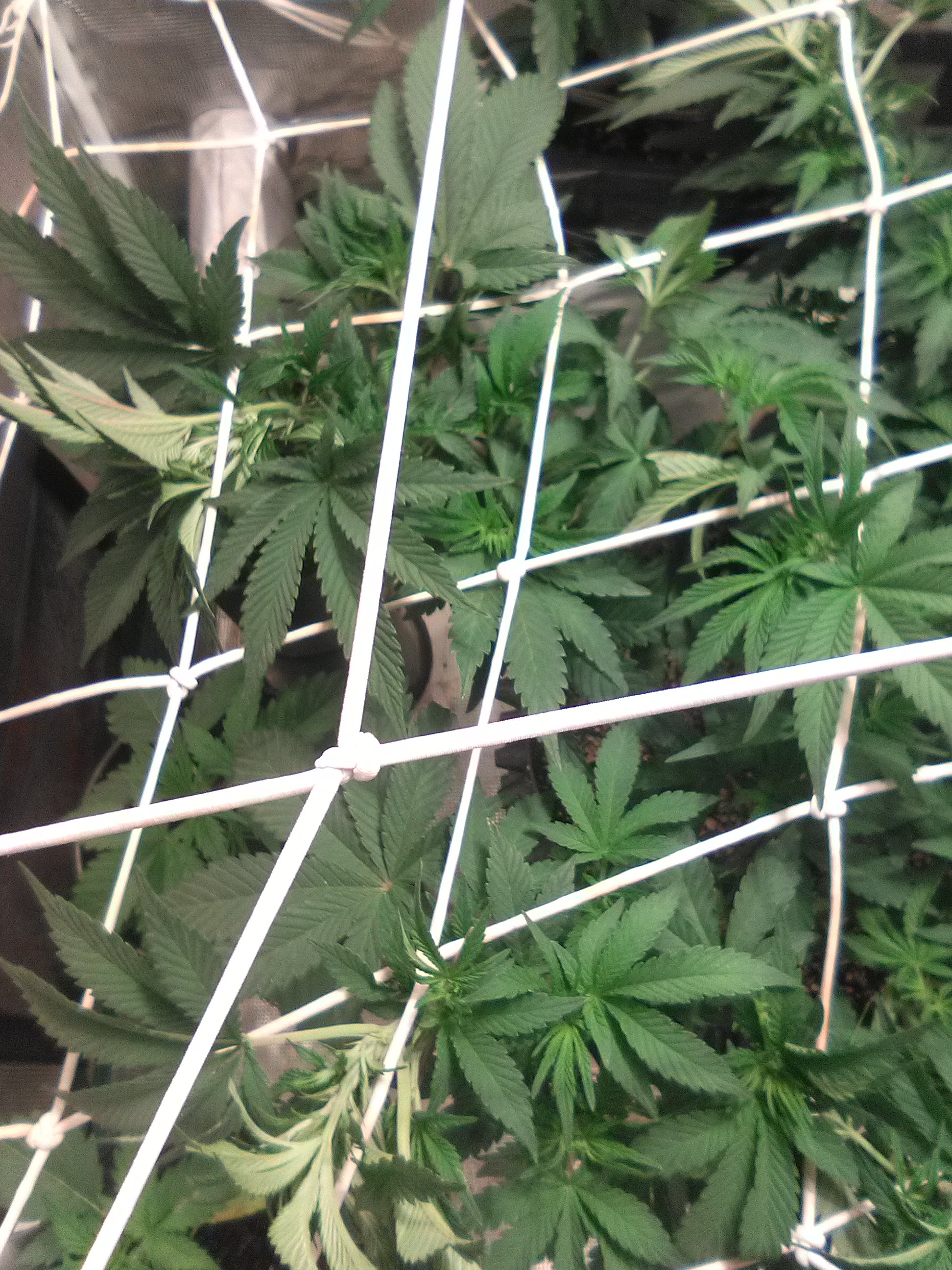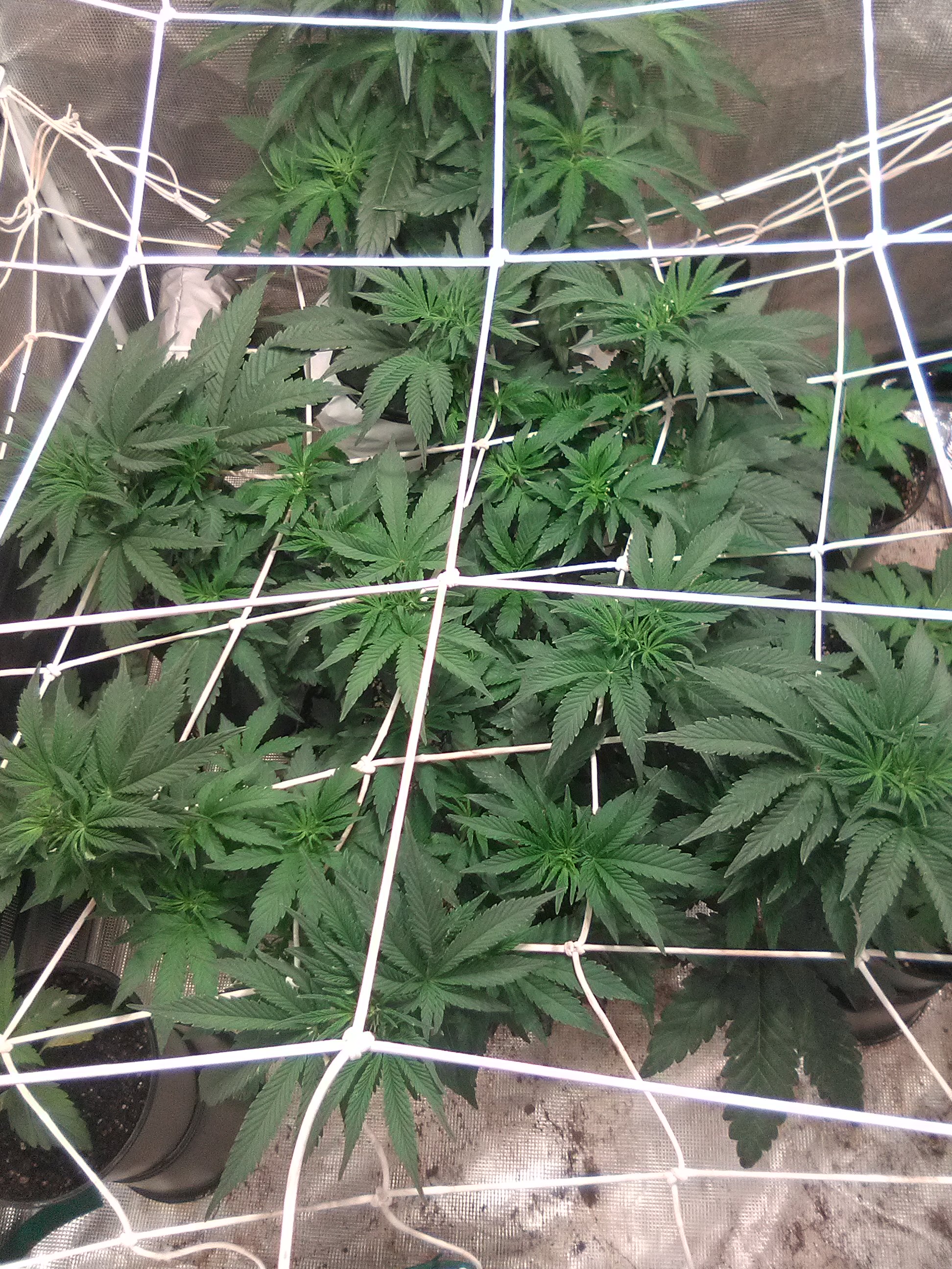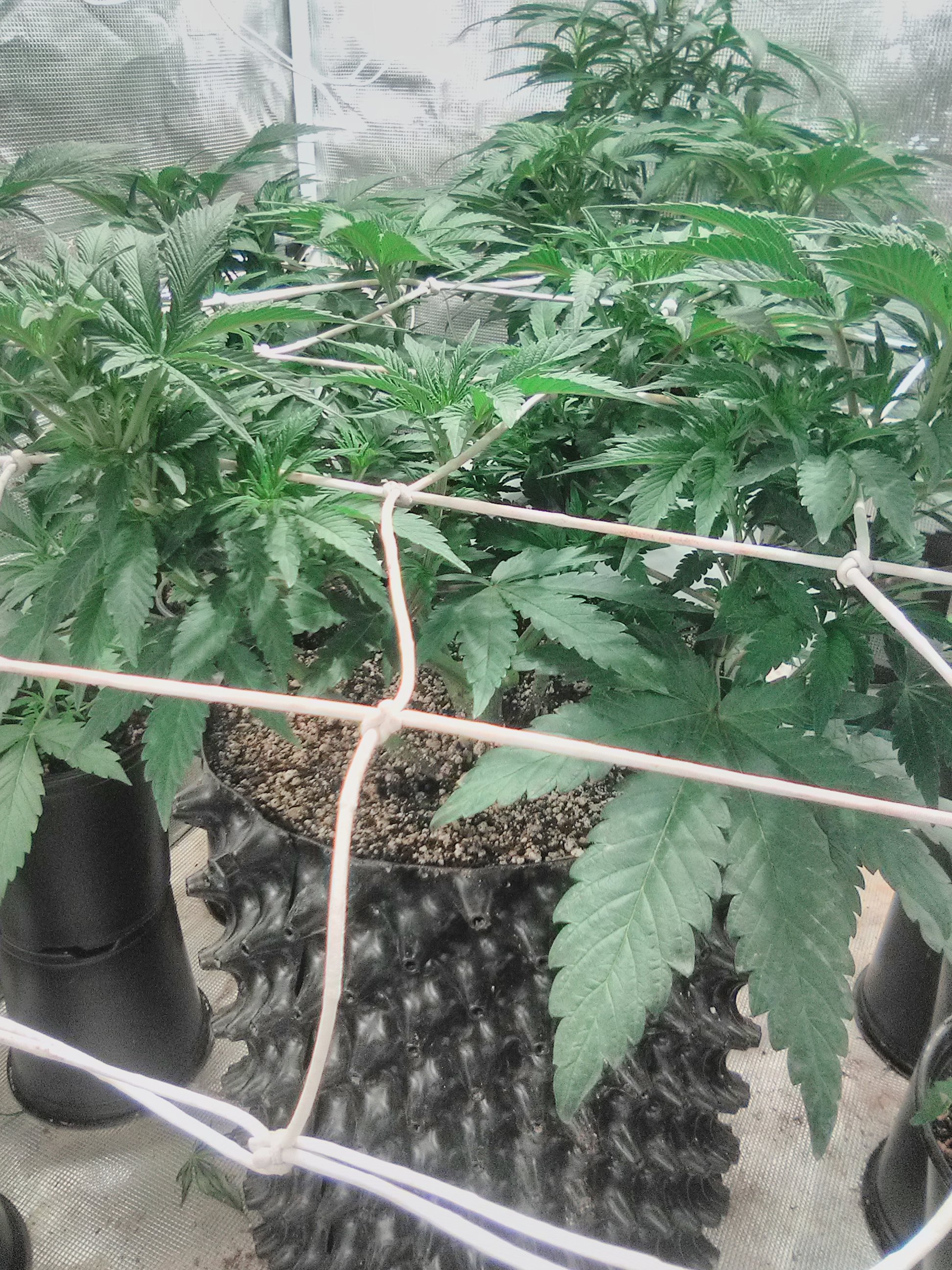 In a tent set up. You are creating a horizontal growing plain for a vertical direction light source. This will allow nodes that wouldn’t normally get as much light to be fully exposed. As the branching progresses we raise the net a little by little. The plants upward growth from the top will continue to apply pressure to your topped section. If not careful your plant will split in half. (Keep some tape available). As the secondary branches grow keep tucking them. Try to keep all fan leaves tucked below the canopy line. Continue this process till week three of flower, then let it go. They will need support so I will add a second net when the time comes. Stay tuned.