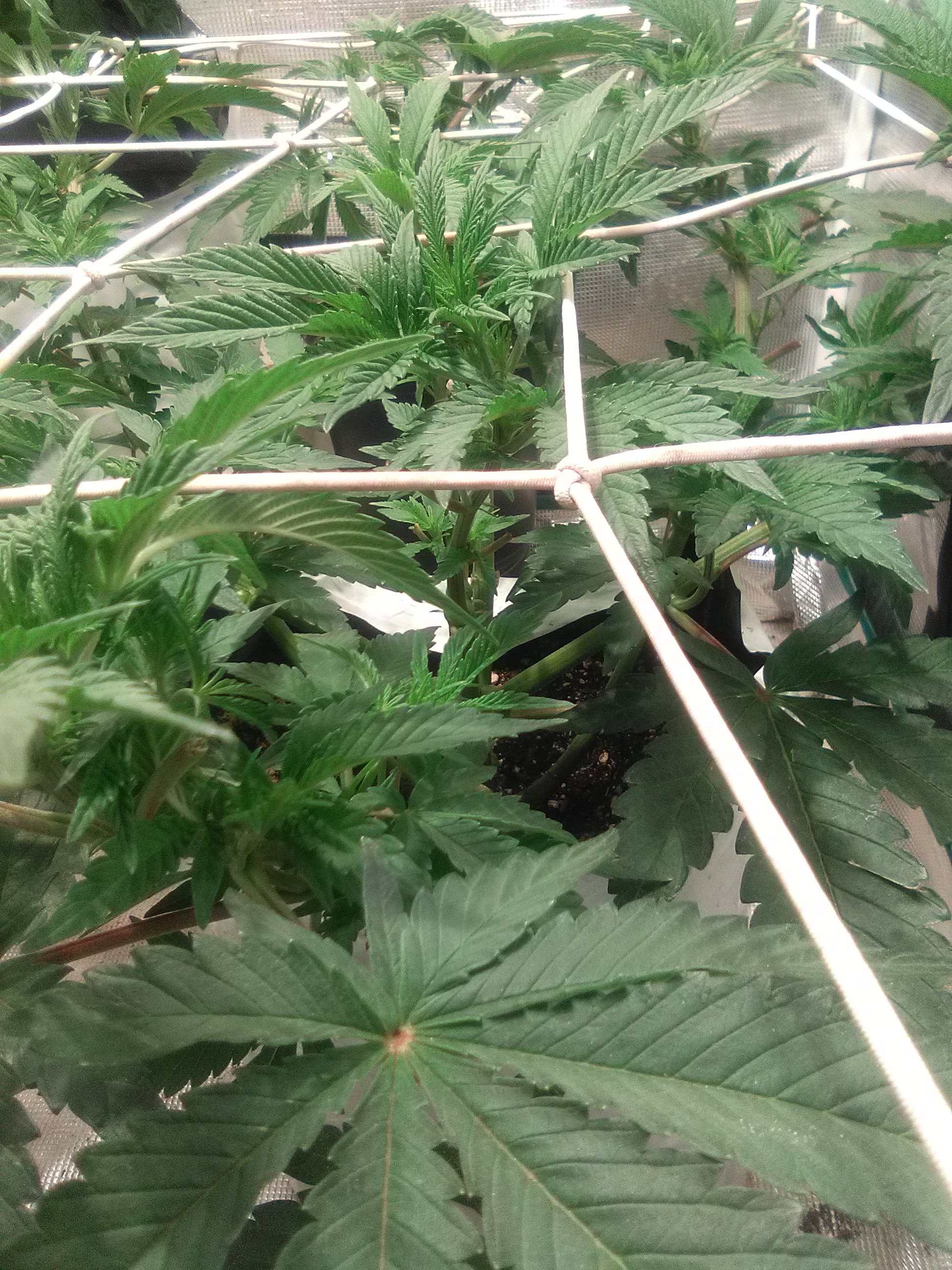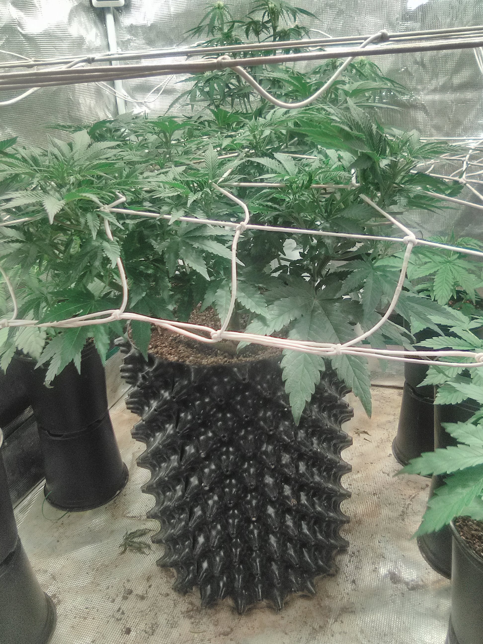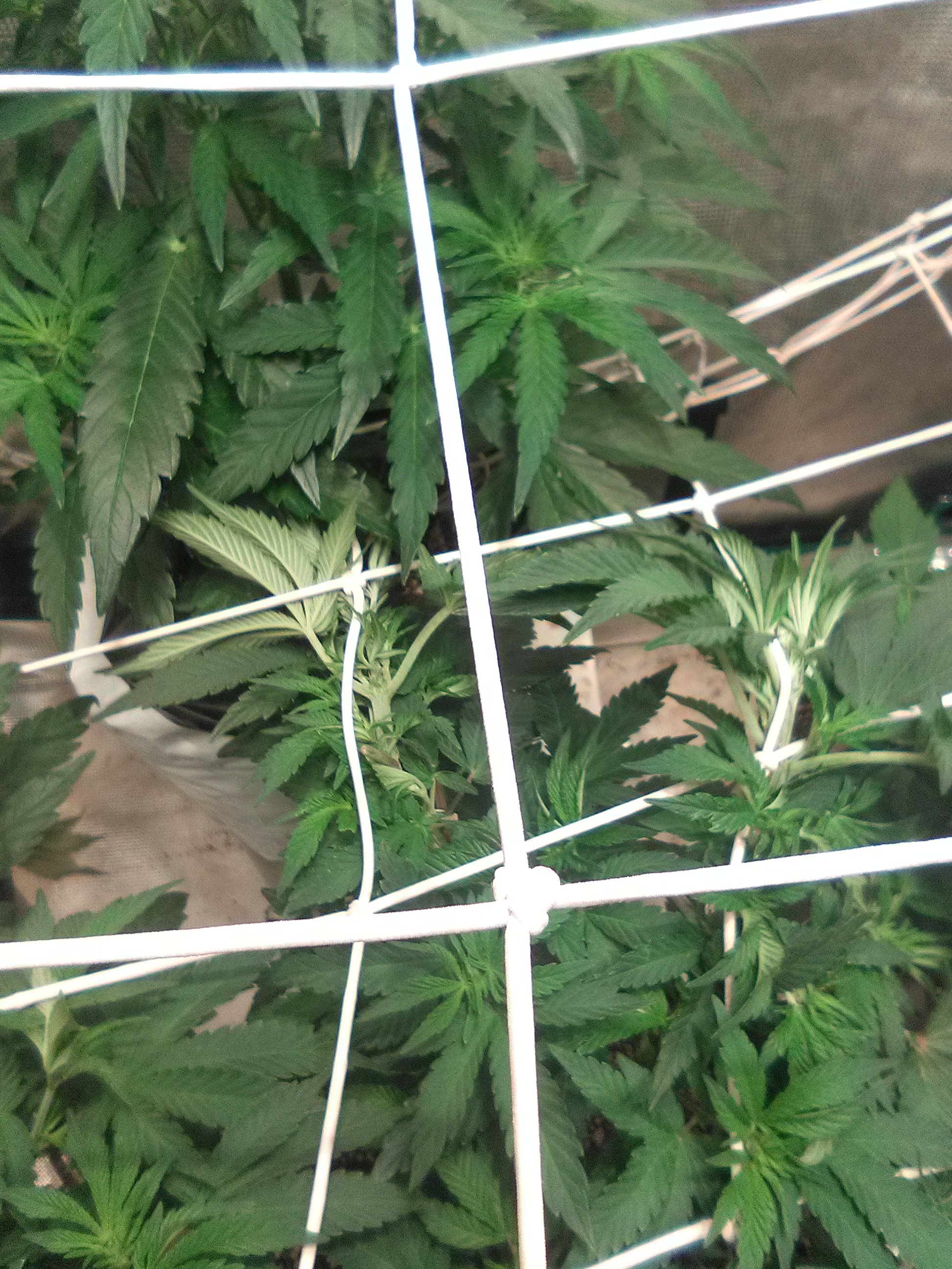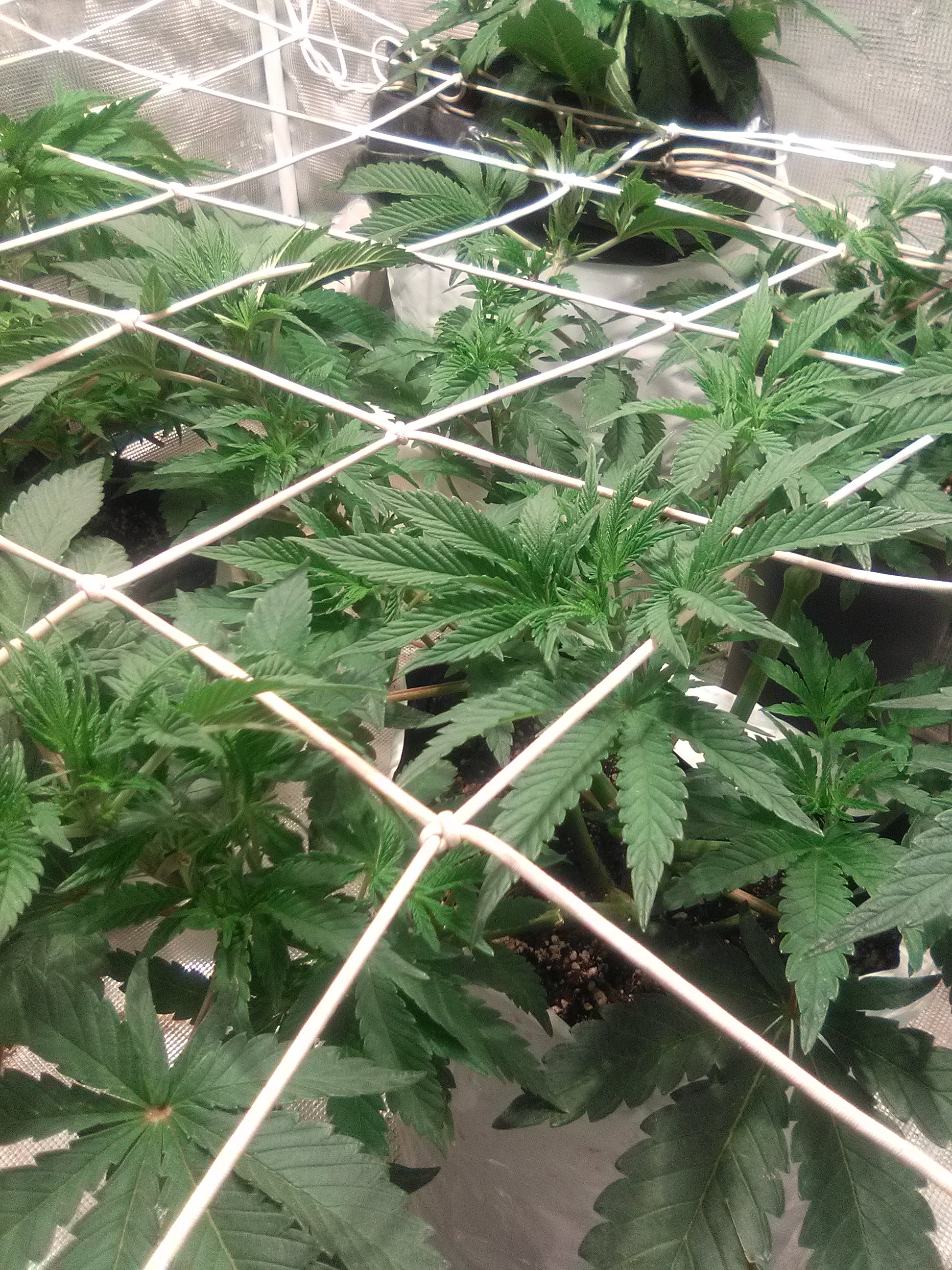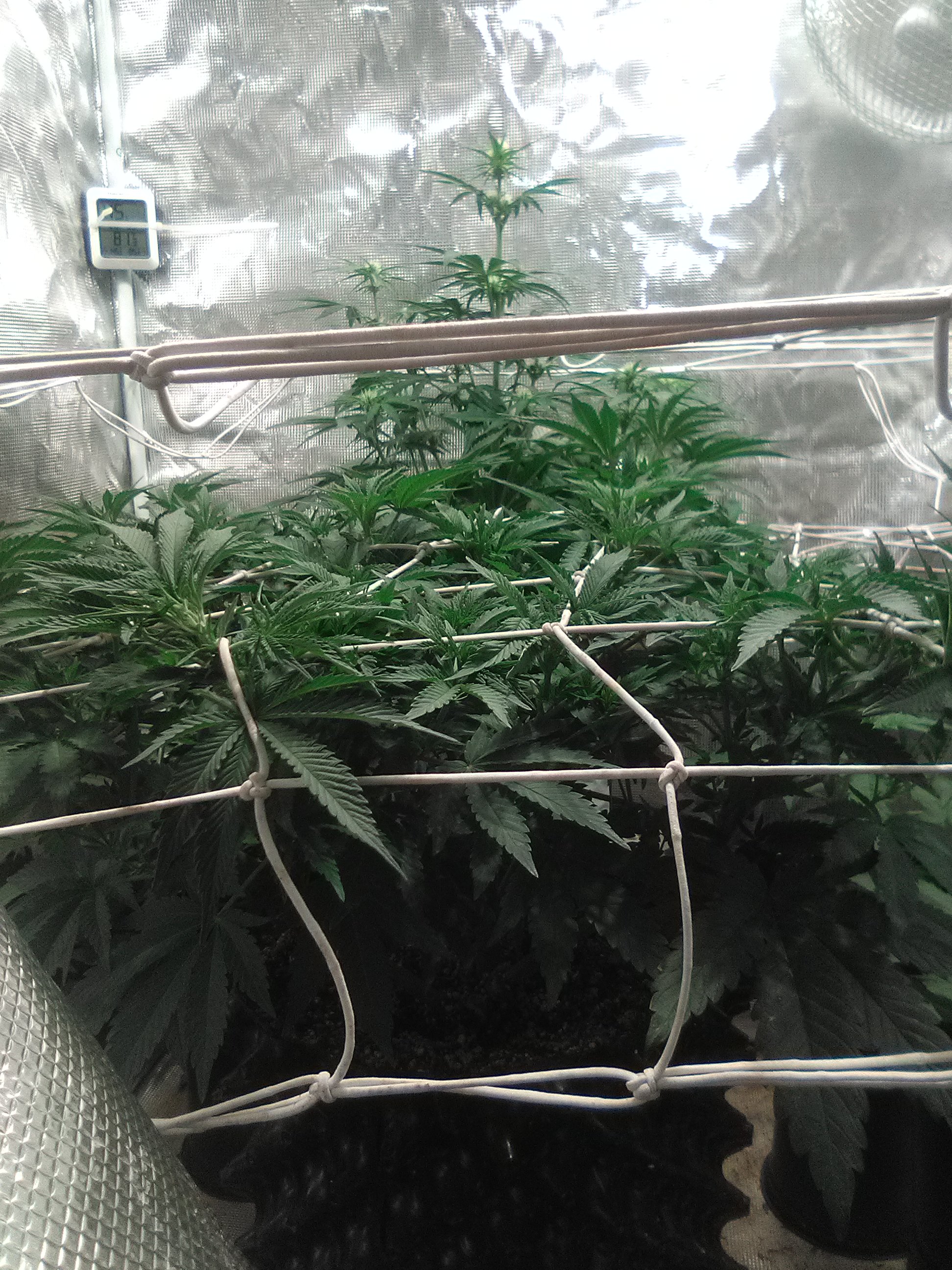 In a tent set up. You are creating a horizontal growing plain for a vertical direction light source. This will allow nodes that wouldn’t normally get as much light to be fully exposed. As the branching progresses we raise the net a little by little. The plants upward growth from the top will continue to apply pressure to your topped section. If not careful your plant will split in half. (Keep some tape available). As the secondary branches grow keep tucking them. Try to keep all fan leaves tucked below the canopy line. Continue this process till week three of flower, then let it go. They will need support so I will add a second net when the time comes. Stay tuned.