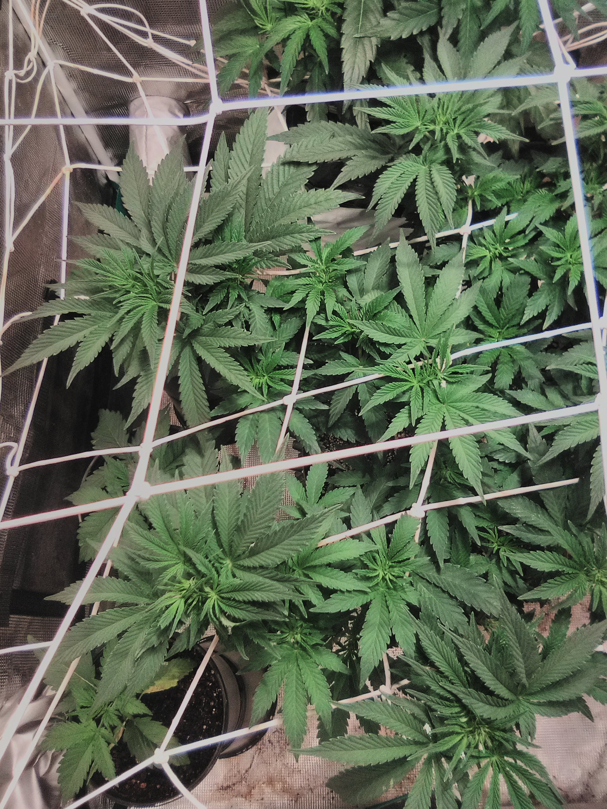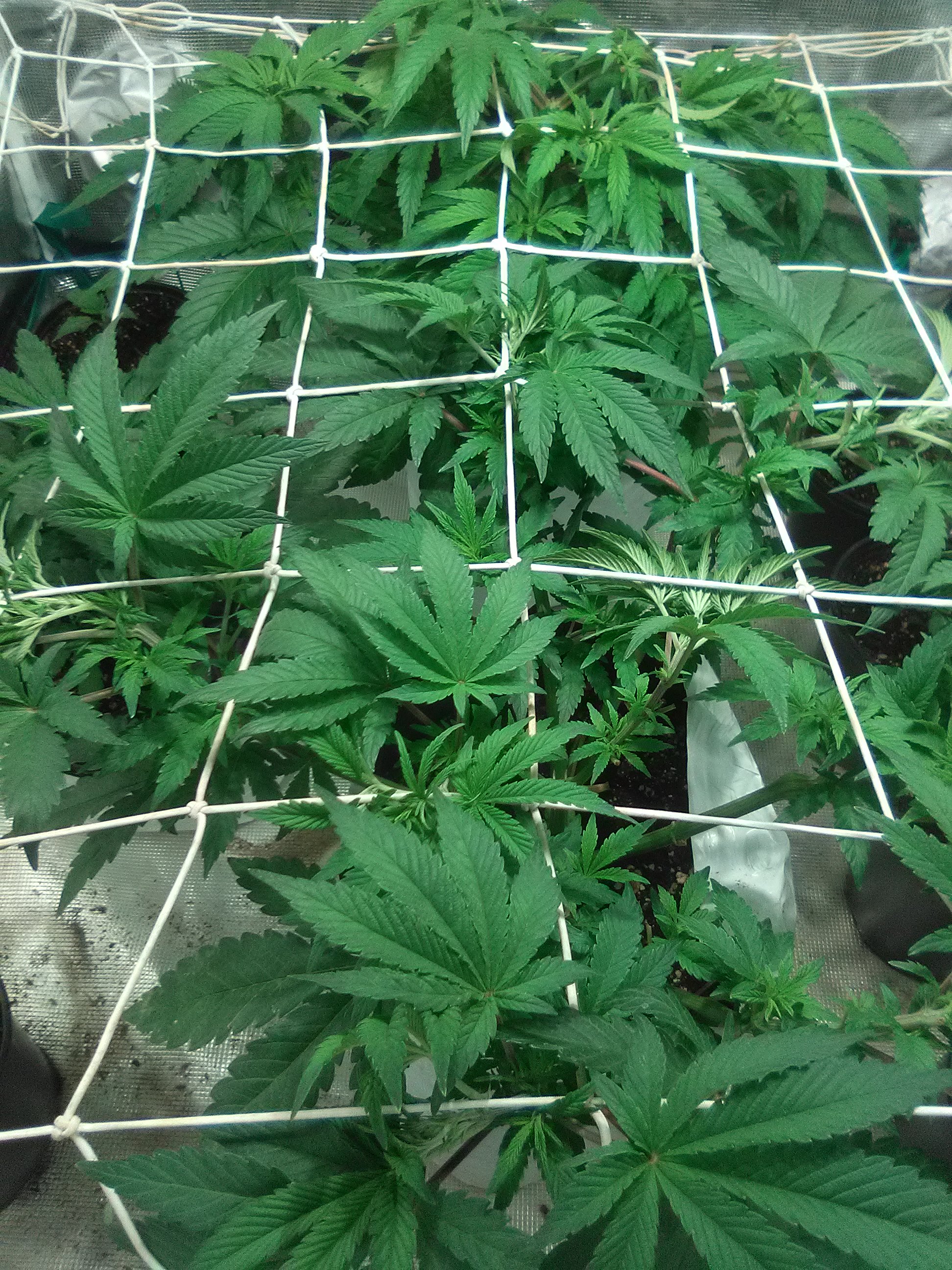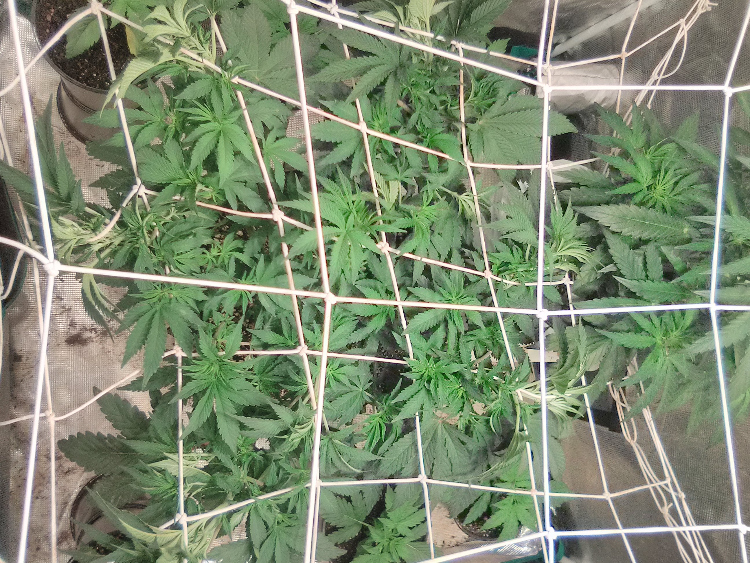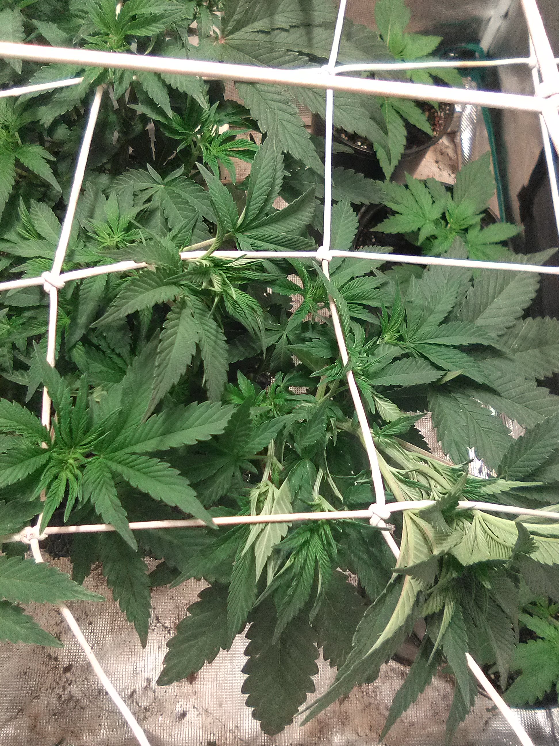 In a tent set up. You are creating a horizontal growing plain for a vertical direction light source. This will allow nodes that wouldn’t normally get as much light to be fully exposed. As the branching progresses we raise the net a little by little. The plants upward growth from the top will continue to apply pressure to your topped section. If not careful your plant will split in half. (Keep some tape available). As the secondary branches grow keep tucking them. Try to keep all fan leaves tucked below the canopy line. Continue this process till week three of flower, then let it go. They will need support so I will add a second net when the time comes. Stay tuned.