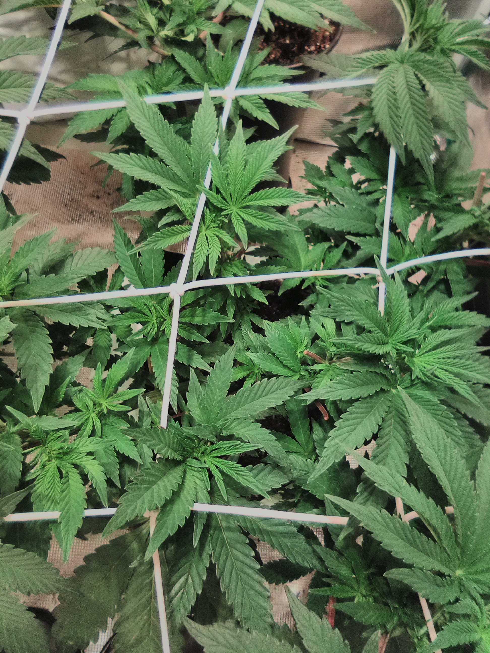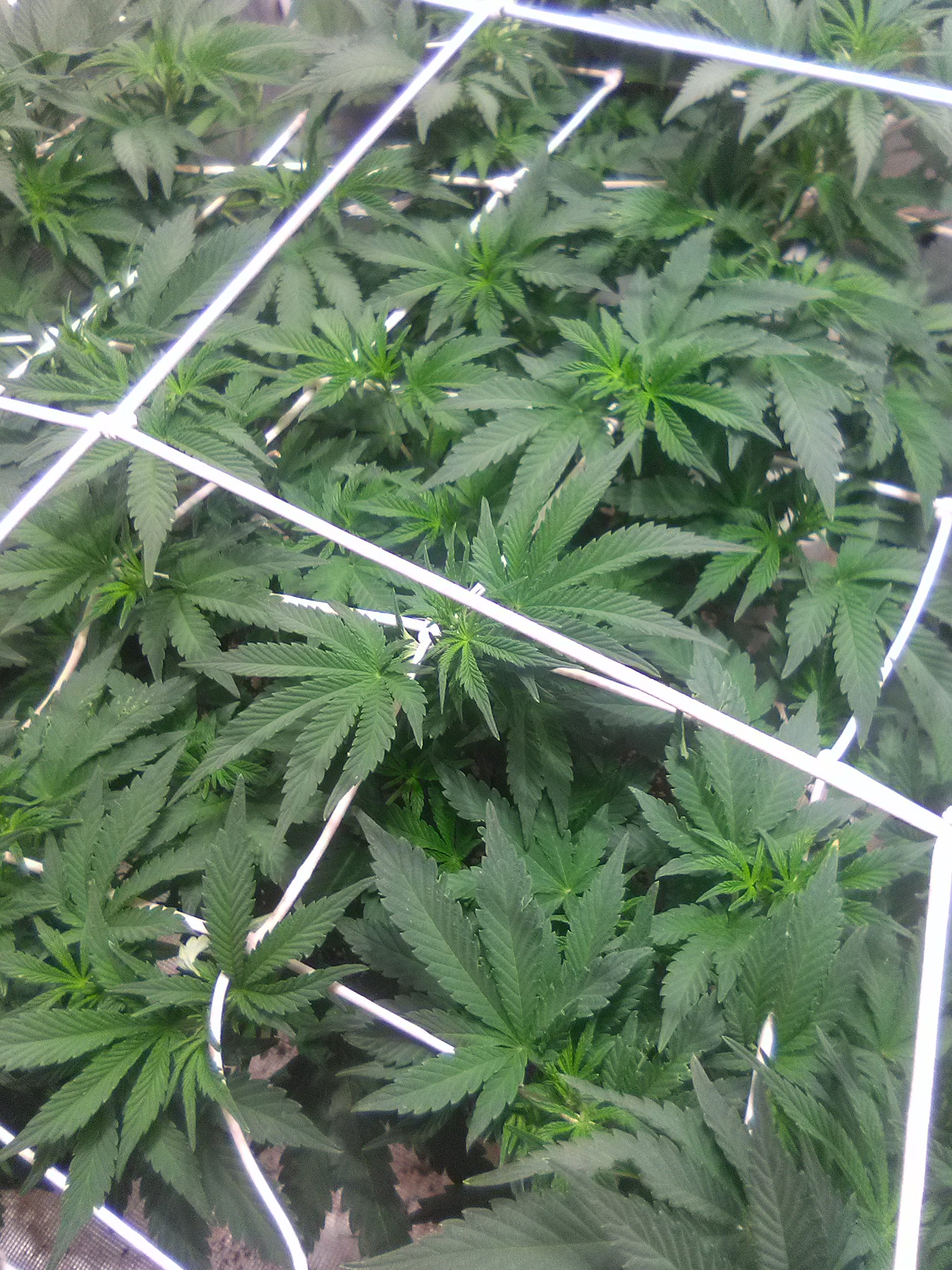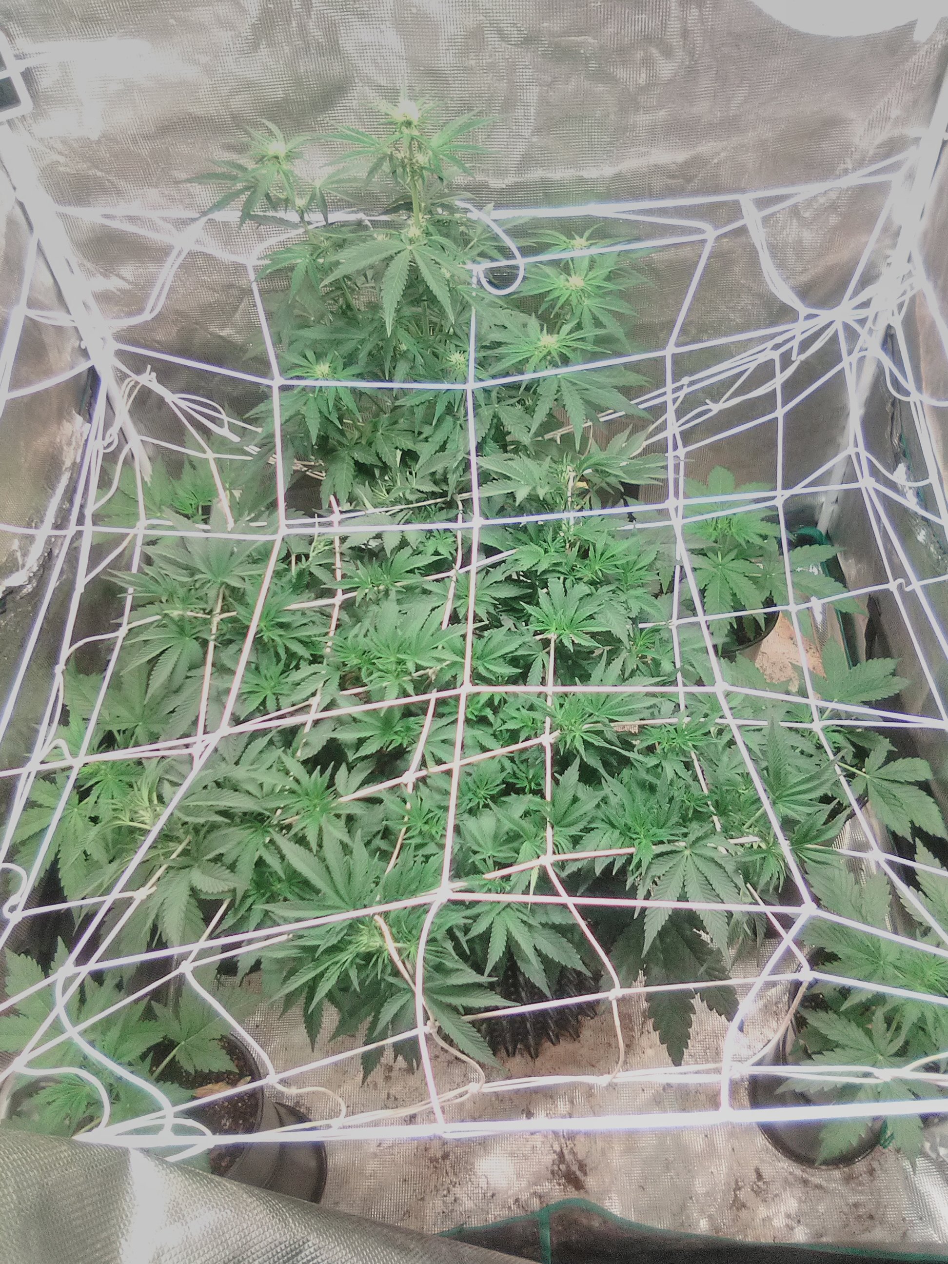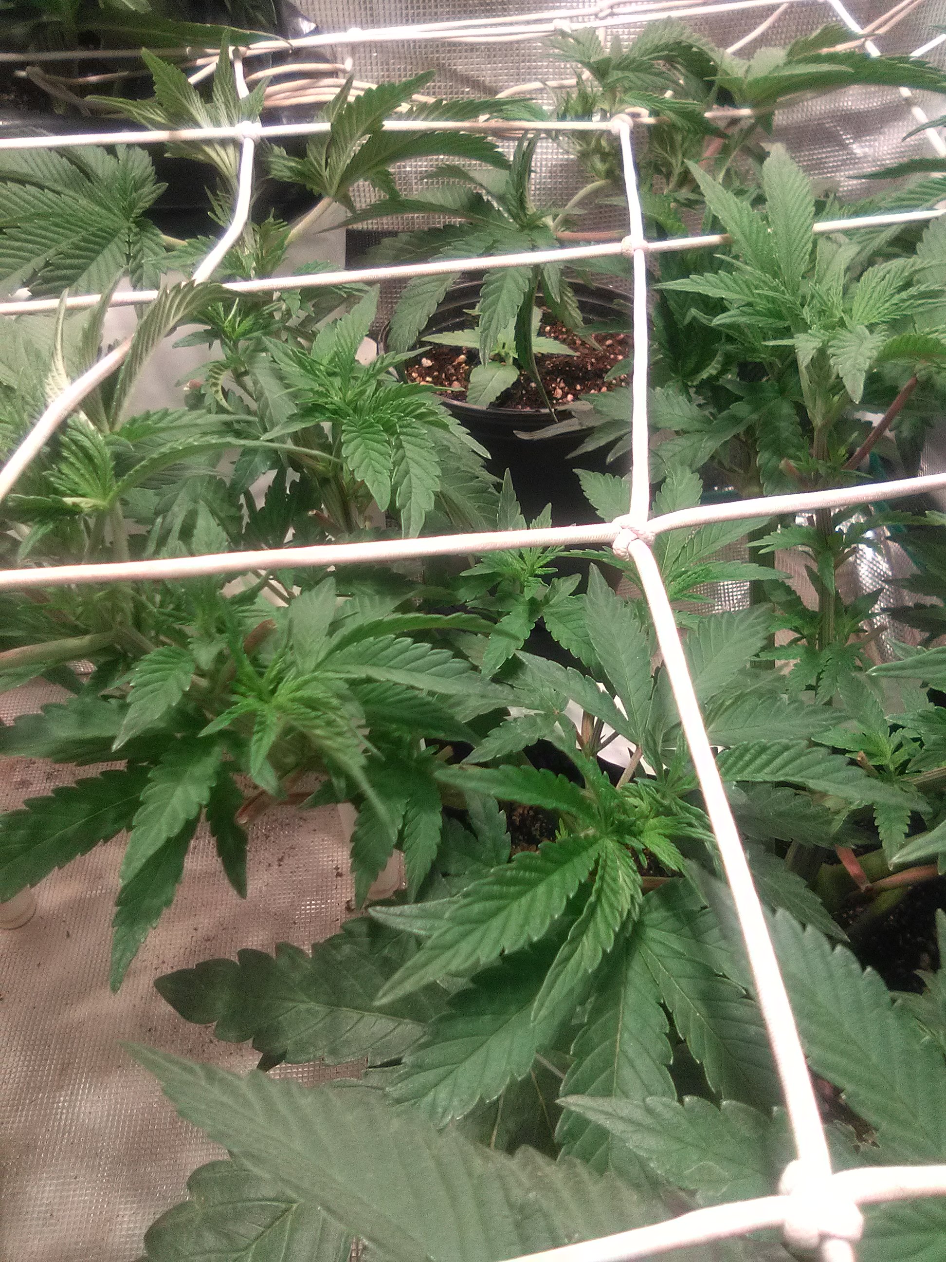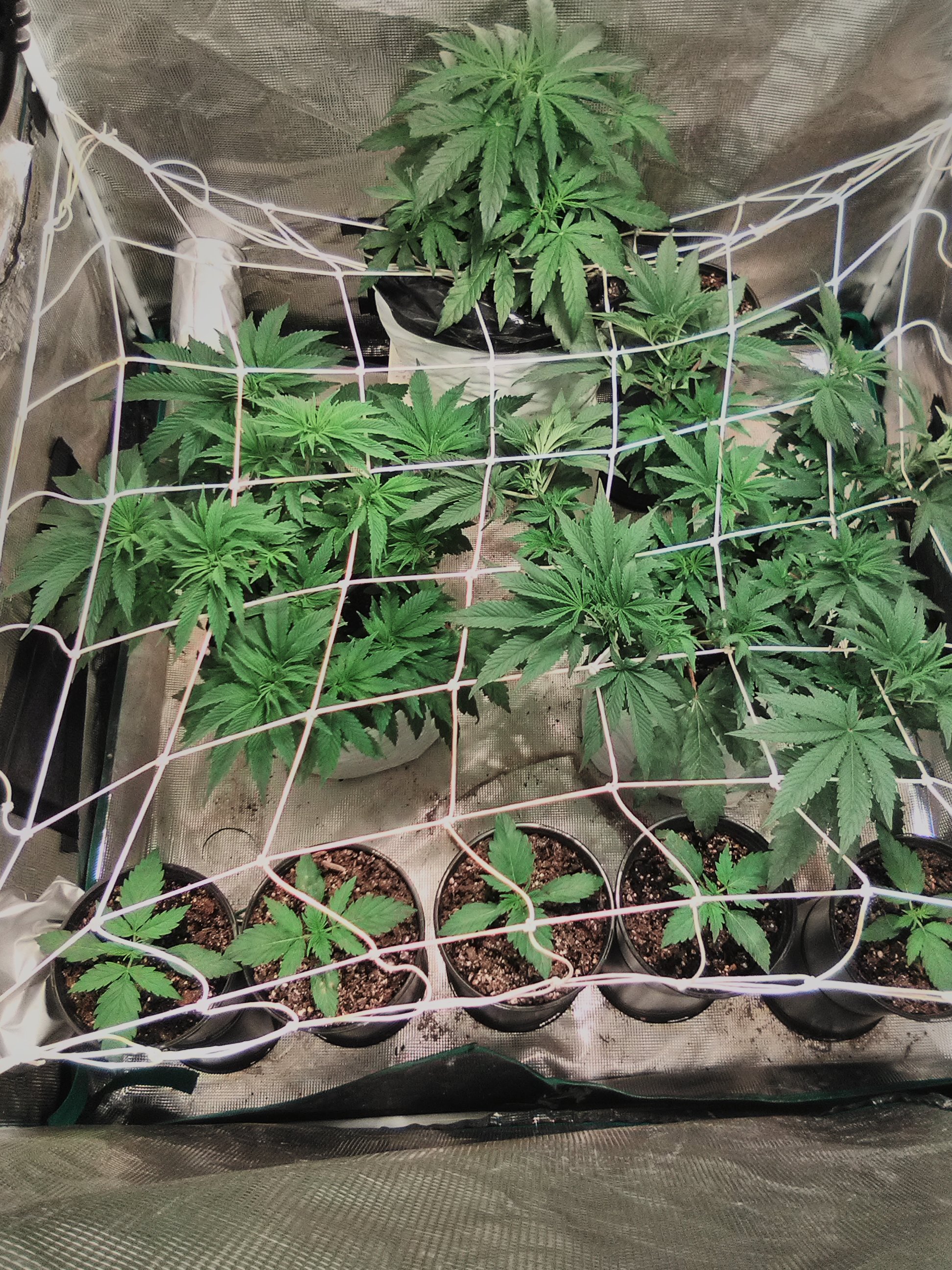 In a tent set up. You are creating a horizontal growing plain for a vertical direction light source. This will allow nodes that wouldn’t normally get as much light to be fully exposed. As the branching progresses we raise the net a little by little. The plants upward growth from the top will continue to apply pressure to your topped section. If not careful your plant will split in half. (Keep some tape available). As the secondary branches grow keep tucking them. Try to keep all fan leaves tucked below the canopy line. Continue this process till week three of flower, then let it go. They will need support so I will add a second net when the time comes. Stay tuned.