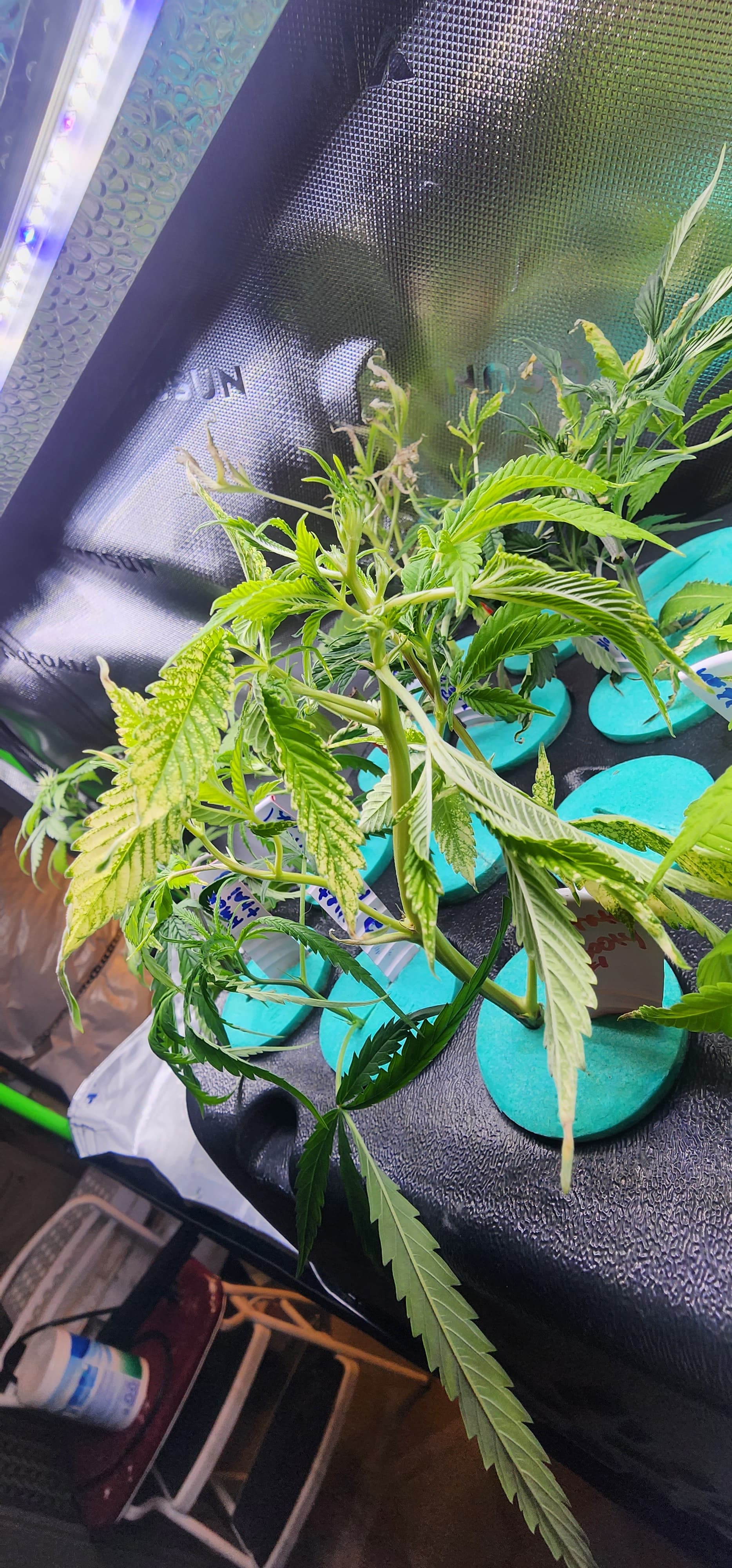 Got a tiny crimea blue that thinks its flowering already. Its going into 24/7 light with the clones. Were gonna reveg it lol.