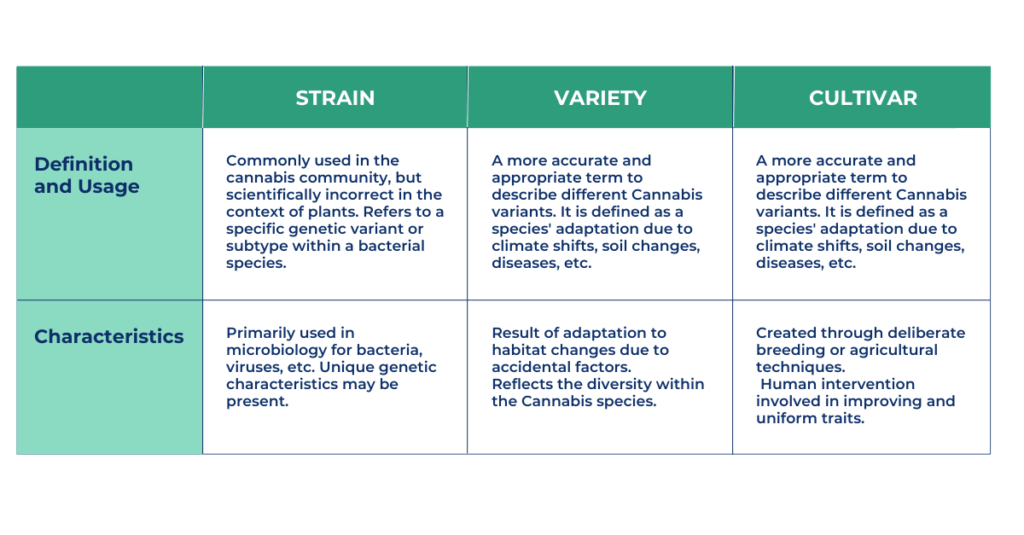 Strain is wholly inaccurate and if we are trying to teach, why perpetuate inaccurate information simply because the masses do it? Cultivar is inaccurate, we aren’t growing/trading/using the plant simply for the aesthetic aspect that would be described when using cultivar.
