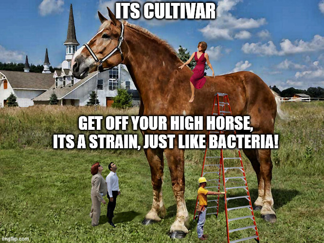 Wow i like strain because i know those more than cultivars. I feel like i should be at a table with a monicle on sippin tea like all snobby! “ its called a cultivar!” Ok well whatever. Its to the point when people ask me what strain is this. I want to say its weed, kind bud, chronic! I miss the 90’s when there was like 15 strains i knew about from reading hightimes. Names are out of control now.